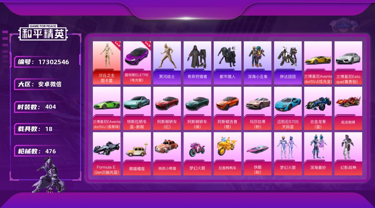 [17302546]木乃伊-29印记-双字ID-1神装-59粉装-33特效枪-18载具-23粉色飞行器-242692热力值-29王牌印记-404套装-476枪皮 【红色载具】:路特斯ELETRE(电光紫)(五级) 【红色神装等级】:沙丘之主-图卡盟(二级) 【热门品类】:粉装-梦幻火箭,套装-浪漫天命,套装-都市猎人,套装-冥河战士,套装-深海小丑鱼,套装-小丑鱼,套装-奇异狩猎者,角色-军刀雅典娜,套装-胖达团团,套装-金羽特工,套装-忍者信条,套装-暗夜行者,套装-龟仙人,套装-暗影哥特,套装-浪漫波比,套装-粉红小猪 【粉色套装】:粉装-深海曼妙,粉装-幻影战神,粉装-宝贝奶油派,粉装-水曜玄武,粉装-金曜白虎,粉装-蝶舞迷情,粉装-梦幻火箭,粉装-金属狂野,粉装-放客神游,粉装-古堡领主,粉装-天禅智恒,粉装-彗云及圣,粉装-狩月元帅,粉装-新星烈龙,粉装-向日葵,粉装-甜蜜誓约,粉装-心之恋语,粉装-极致幻想,粉装-潮汐统领,粉装-绚金战神,粉装-香水柠檬,粉装-绮梦青鸾,粉装-星之彼岸,粉装-甜梦冰蝶,粉装-馨动时刻,粉装-烈焰拳霸,粉装-虎啸骄阳,粉装-炙焰赤龙,粉装-飓风飞鹰,粉装-铁血龙王,粉装-桀骜红莲,粉装-焰龙焚天,粉装-银龙傲海,粉装-骨龙祭渊,粉装-暗夜玫瑰,角色-闪耀迪迦,角色-赛罗闪耀型,粉装-彩虹鹿灵,粉装-山涧鹿灵,角色-洛天依,粉装-沙场疾风,粉装-吟月归客,角色-零号机款机体服,角色-初号机款机体服,角色-2号机款机体服,粉装-青葱仙萝,粉装-天之羽翼,粉装-恐龙拽拽,粉装-橘柚倾心,粉装-冷魅冰骑,粉装-赤焰黑爵,粉装-紫电风暴,角色-复仇流浪者,粉装-垂柳戏鸭,粉装-第五大道,粉装-天星战神,角色-小叽联名款,玩偶服-猪猪侠,粉装-机械师花傲天 【粉色枪皮等级】:AKM-甜心宝贝(二级),AKM-炫紫旋律(一级),AKM-梦之光华(一级),AKM-百合蜜语(一级),AKM-盖世英雄(八级),M16A4-垂柳戏鸭(五级),SCAR-L-梦幻火箭(四级),SCAR-L-机甲封神(一级),SCAR-L-天蓬元帅(八级),M416-五爪金龙(六级),M416-心之恋语(三级),M416-风花雪月(四级),GROZA-香水柠檬(七级),AUG-星之彼岸(六级),M762-甜蜜誓约(一级),M762-冷魅冰骑(七级),UMP45-恐龙拽拽(六级),Ve