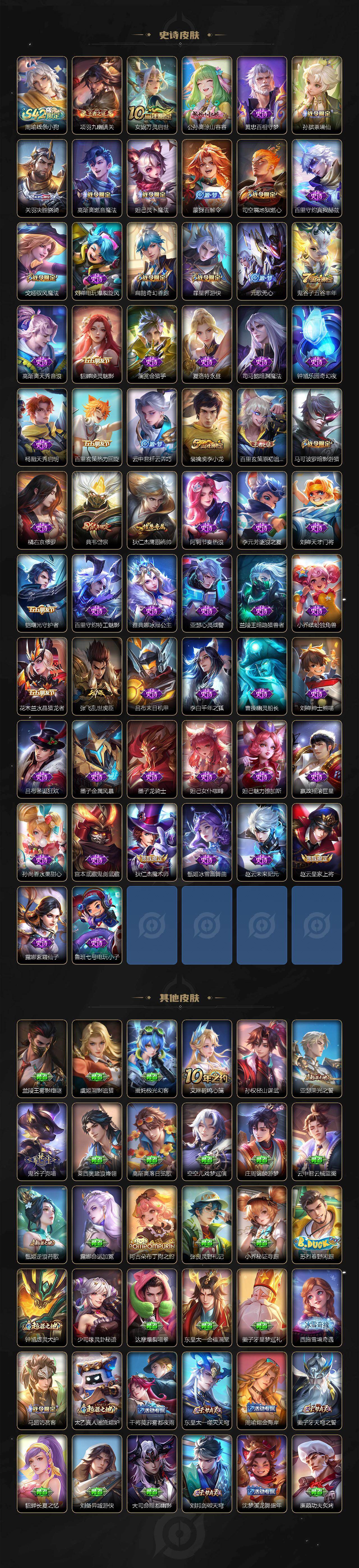 【史诗皮肤】:周瑜线条小狗,项羽九幽镇关,女娲万灵启世,公孙离涂山容容,黄忠百相守梦,孙膑茶境仙,关羽决胜骁骑,高渐离燃音魔法,妲己灵卜魔法,蒙犽百解令,司空震地狱燃心,百里守约真我赫兹,戈娅驭风魔法,刘禅电玩爆裂旋风,扁鹊奇幻香踪,暃星界游侠,元歌无心,鬼谷子五谷丰年,高渐离天秀音浪,貂蝉唤灵魅影,澜赏金猎手,夏洛特永昼,司马懿暗渊魔法,钟馗乐园奇幻夜,杨戬天秀启明,百里玄策热力回旋,云中君纤云弄巧,裴擒虎李小龙,百里玄策原初追逐者,马可波罗暗影游猎,橘右京修罗,典韦岱宗,狄仁杰鹰眼统帅,阿轲节奏热浪,李元芳逐浪之夏,刘禅天才门将,铠曙光守护者,百里守约特工魅影,雅典