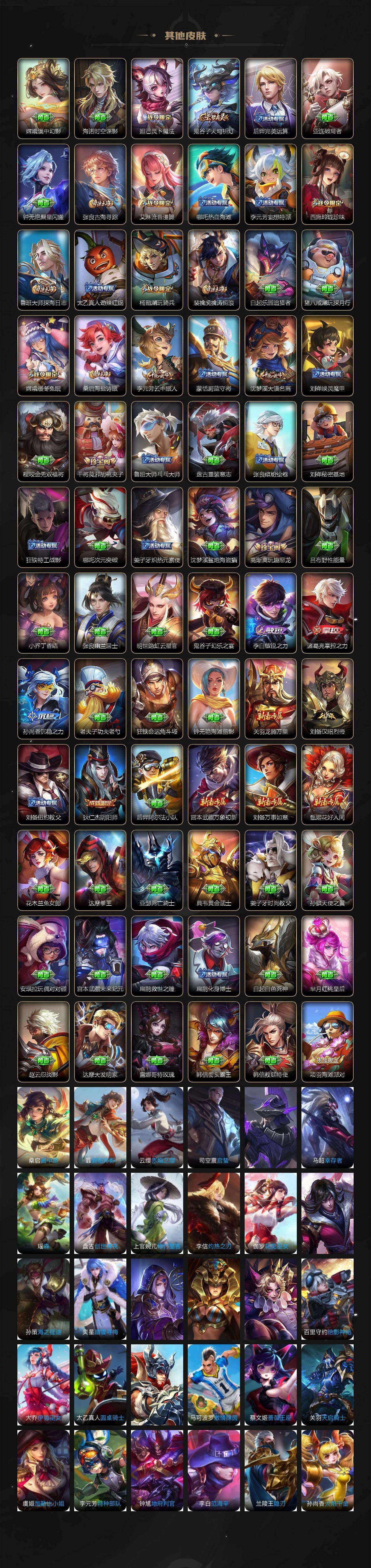 【限定皮肤】:姜子牙天穹之誓,狄仁杰阴阳师,赵云皇家上将,高渐离玩趣恶龙,扁鹊奇幻香踪,元歌无心,典韦岱宗,马可波罗暗影游猎,马可波罗妄想实况,狄仁杰魔术师,项羽海滩派对,孙悟空齐天大圣,李元芳云中旅人,杨戬潮玩骑兵,干将莫邪胡桃夹子,鬼谷子五谷丰年,百里玄策原初追逐者,沈梦溪大漠名商,裴擒虎李小龙,裴擒虎擒涛扼浪,云中君纤云弄巧,李信山海炽霜斩,嫦娥暖冬兔眠,西施玲珑珍味,鲁班大师探海日志,桑启海盐诗旅,暃星界游侠,戈娅驭风魔法,艾琳流音漫舞,司空震地狱燃心,张良古海寻踪,蒙犽百解令,高渐离燃音魔法,妲己灵卜魔法,鬼谷子天穹祈灯,沈梦溪龙舞盛年,刘邦剑破天穹,关羽决胜骁骑,刘备异域游侠,周瑜熔金海岸