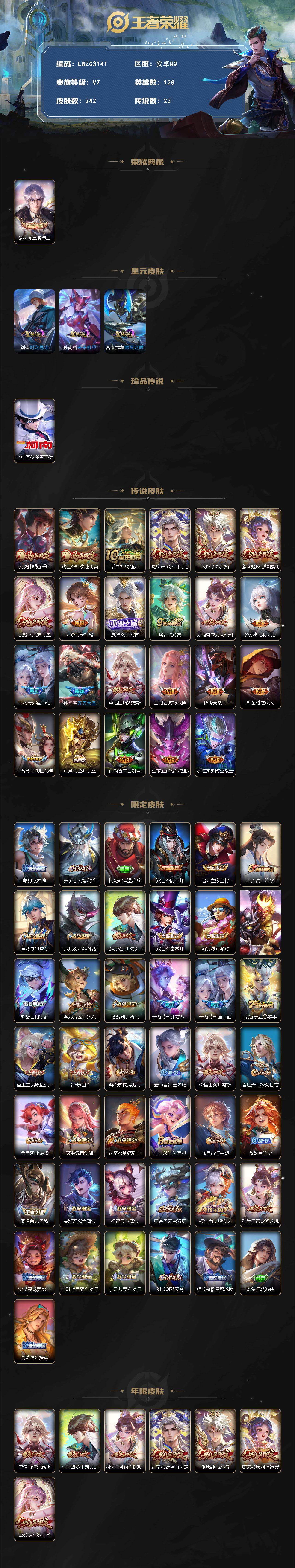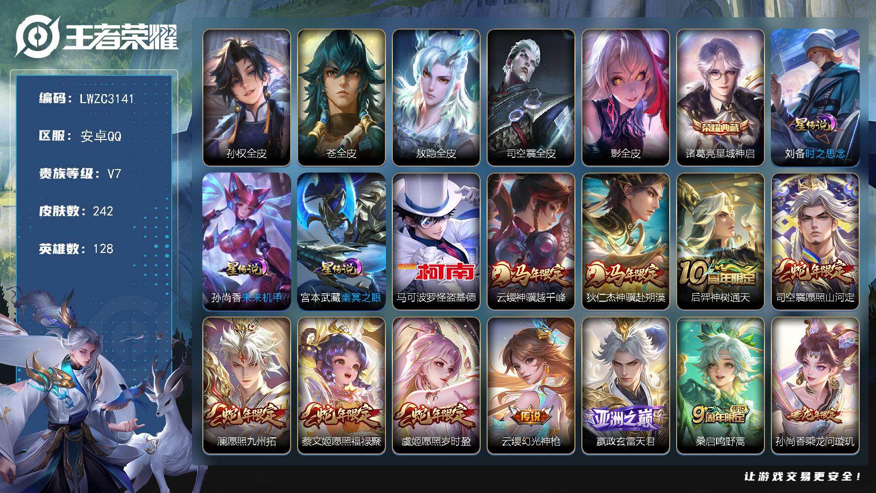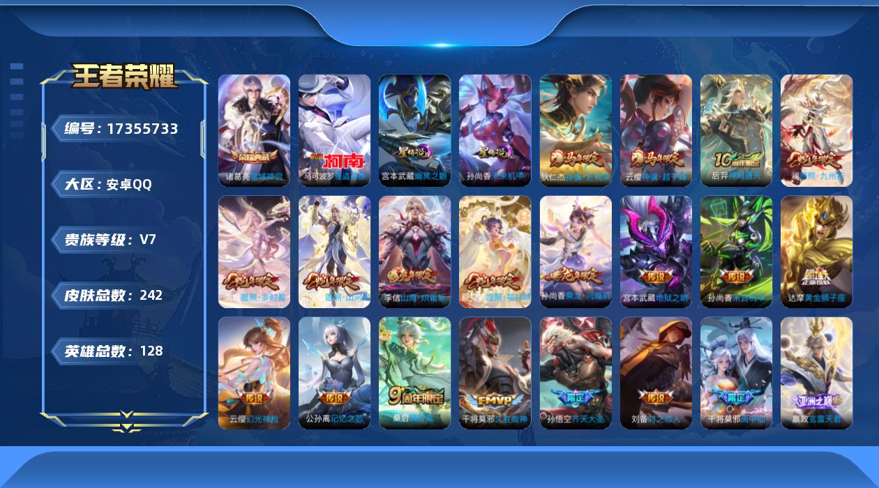 [17355733]可二次【特价出售/店主推荐/25市标/】:安卓Q-V7-最强王者段位-128英雄-242皮肤-1典藏皮肤-1珍品传说-3星元-23传说-68史诗