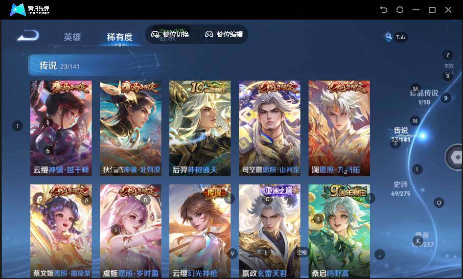 【传说皮肤】:云缨神骥越千峰,狄仁杰神骥赴朔漠,后羿神树通天,司空震愿照山河定,澜愿照九州拓,蔡文姬愿照福禄聚,虞姬愿照岁时盈,云缨幻光神枪,嬴政玄雷天君,桑启鸣野蒿,孙尚香乘龙问璇玑,公孙离记忆之芯,干将莫邪画中仙,孙悟空齐天大圣,李信山海炽霜斩,王昭君乞巧织情,铠绛天战甲,刘备时之恋人,干将莫邪久胜战神,达摩黄金狮子座,孙尚香末日机甲,宫本武藏地狱之眼,狄仁杰超时空战士