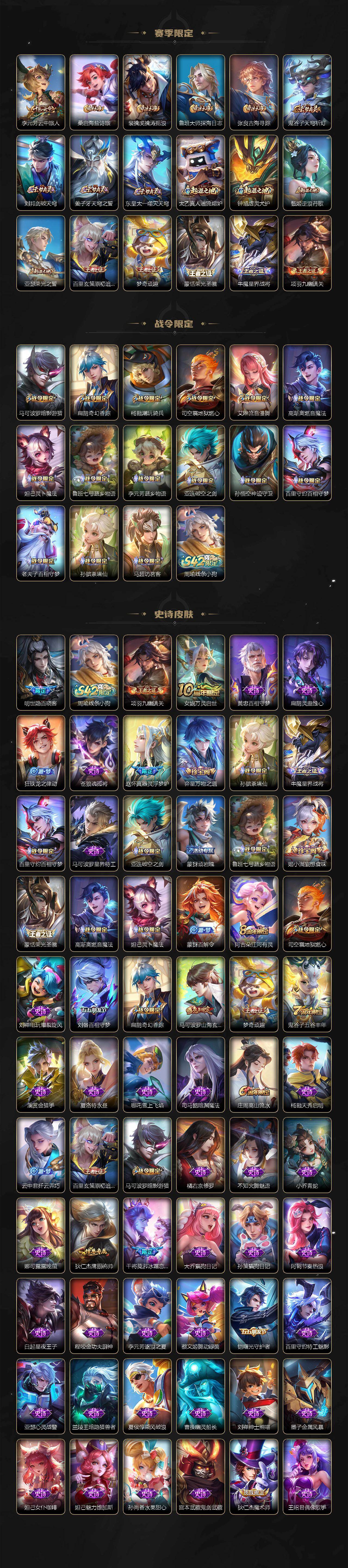 【赛季限定】:李元芳云中旅人,桑启海盐诗旅,裴擒虎擒涛扼浪,鲁班大师探海日志,张良古海寻踪,鬼谷子天穹祈灯,刘邦剑破天穹,姜子牙天穹之誓,东皇太一噬灭天穹,太乙真人谧流熔炉,钟馗虚灵犬护,甄姬逆浪荇歌,亚瑟荣光之誓,百里玄策原初追逐者,梦奇顽趣,蒙恬荣光圣徽,牛魔星界战将,项羽九幽镇关