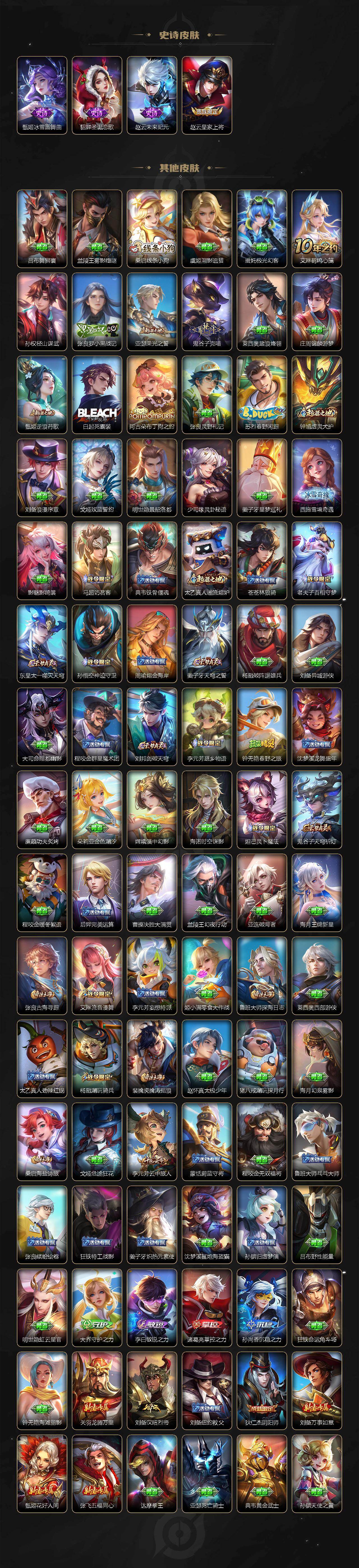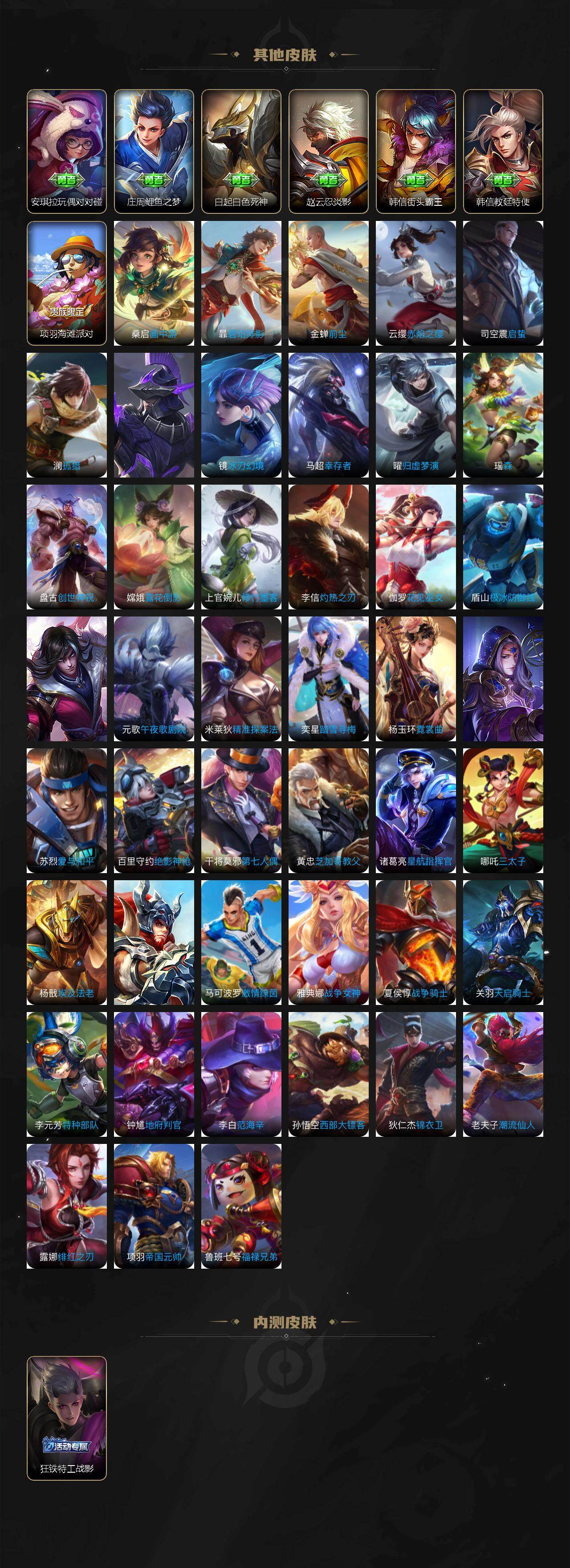 【限定皮肤】:蒙犽顽岩魄,姜子牙天穹之誓,杨戬破阵退雄兵,狄仁杰阴阳师,赵云皇家上将,庄周高山流水,扁鹊奇幻香踪,马可波罗暗影游猎,马可波罗山海玄木吟,狄仁杰魔术师,项羽海滩派对,孙悟空齐天大圣,刘备百相守梦,李元芳云中旅人,杨戬潮玩骑兵,干将莫邪冰霜恋舞曲,干将莫邪画中仙,鬼谷子五谷丰年,百里玄策原初追逐者,梦奇顽趣,裴擒虎擒涛扼浪,云中君纤云弄巧,李信山海炽霜斩,鲁班大师探海日志,桑启海盐诗旅,艾琳流音漫舞,司空震地狱燃心,阿古朵江河有灵,张良古海寻踪,蒙犽百解令,蒙恬荣光圣徽,高渐离燃音魔法,妲己灵卜魔法,鬼谷子天穹祈灯,姬小满妄想食味,孙尚香乘龙问璇玑,沈梦溪龙舞盛年,鲁班七号蔬乡物语,李元芳蔬乡物语,刘邦剑破天穹,程咬金群星魔术团,刘备异域游侠,周瑜熔金海岸