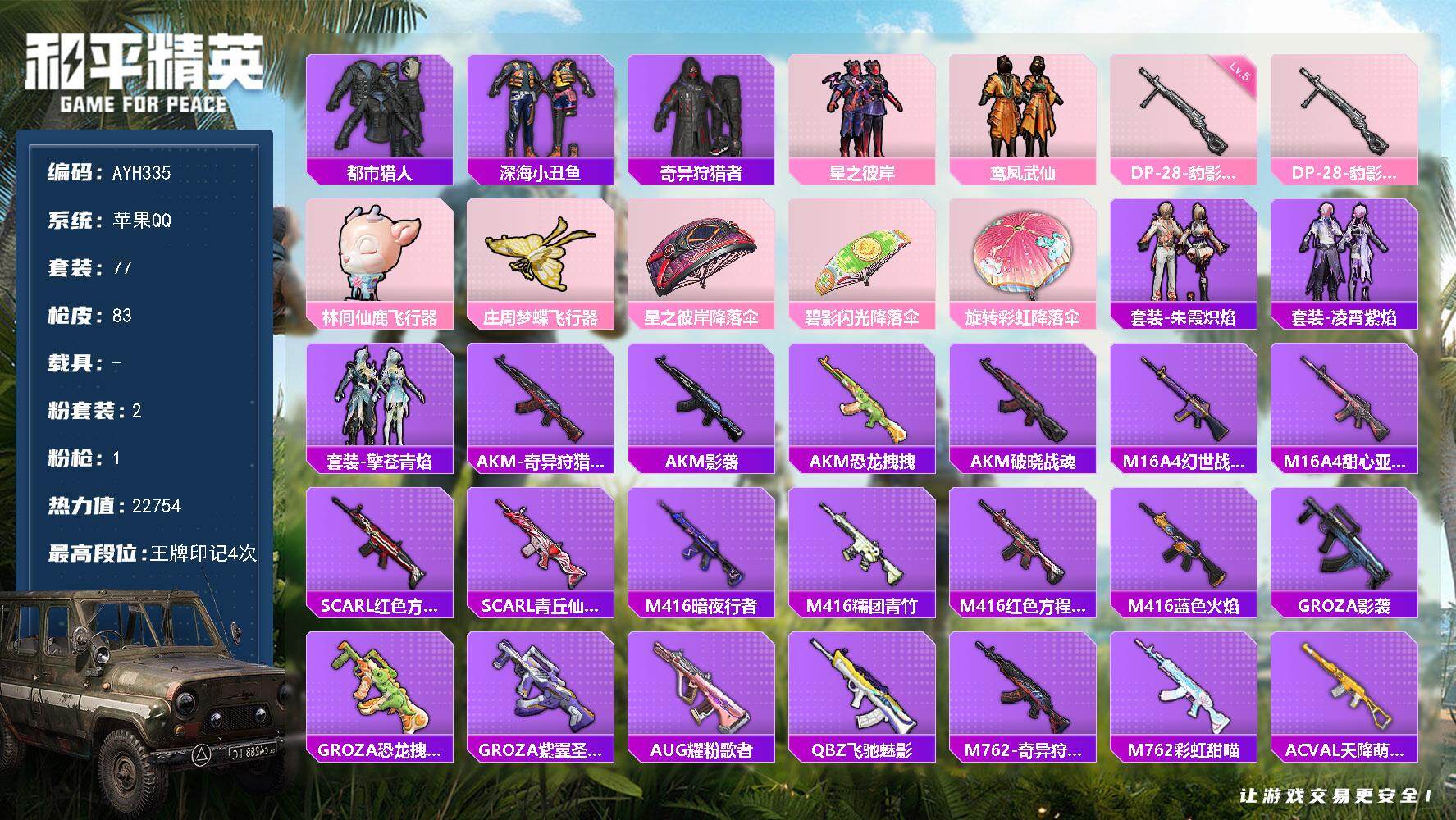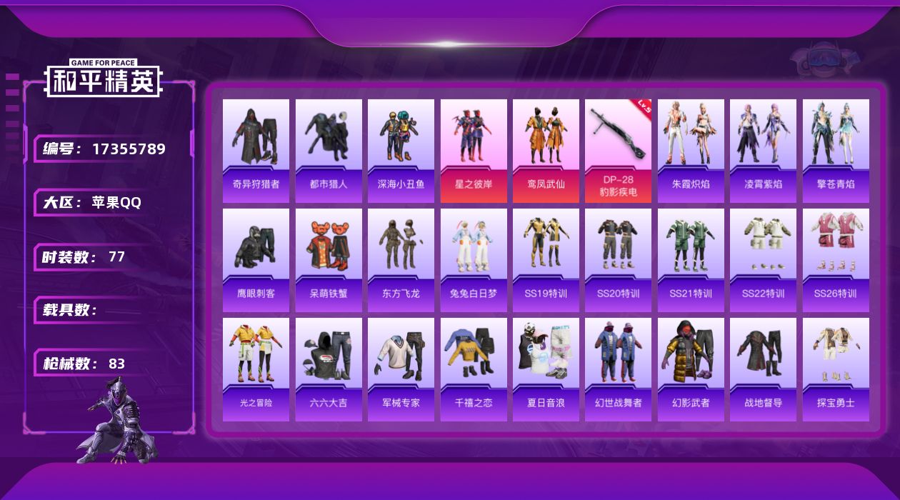 [17355789]苹果 手Q-2粉装-1特效枪-0载具-2粉色飞行器-22754热力值-4王牌印记-77套装-83枪皮【热门品类】:套装-都市猎人,套装-深海小丑鱼,套装-奇异狩猎者【粉色套装】:粉装-星之彼岸,粉装-鸾凤武仙【粉色枪皮等级】:DP-28-豹影疾电(五级)【粉色枪皮】:DP-28-豹影疾电【粉色飞行器】:林间仙鹿飞行器,庄周梦蝶飞行器