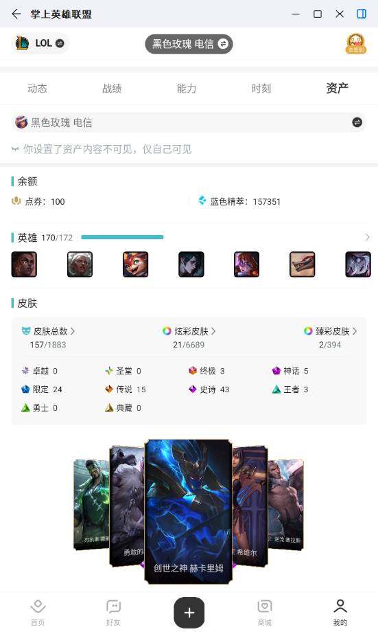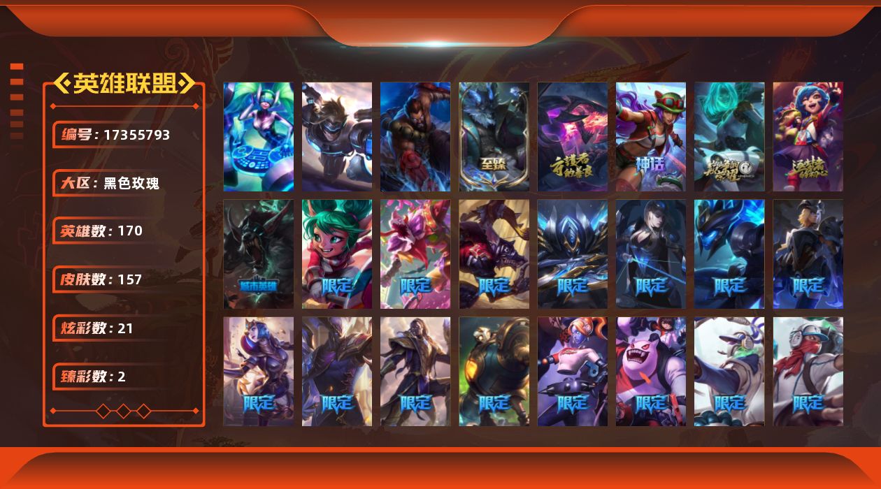 [17355793]未定级段位-170英雄-157皮肤-21炫彩-3终极-5神话-24限定-15传说-43史诗