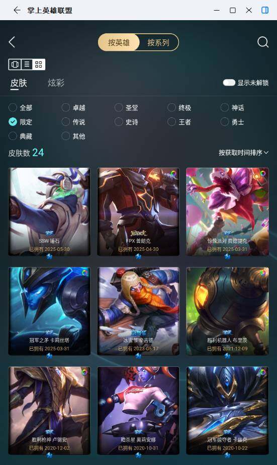 【限定皮肤】:冠军之血希瓦娜,冠军之矛卡莉丝塔,冠军之箭艾希,冠军掠夺者卡兹克,暗杀星奥莉安娜,暗杀星努努和威朗普,SSW辛吉德,SSW锤石,FPX普朗克,FPX薇恩,胜利女神奥莉安娜,胜利之剑亚托克斯,胜利枪神卢锡安,胜利机器人布里茨,鬼影森森茂凯,泳池派对格雷福斯,泳池派对凯特琳,泳池派对雷克顿,暗影沃里克,波比的巧克力工坊,都铎王朝图奇,惊悚派对费德提克