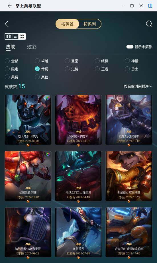 【传说皮肤】:地狱之门卫士加里奥,战场女武神凯尔,烈焰雄心崔丝塔娜,合金巨兽努努和威朗普,女皇艾希,最终BOSS维迦,陆地王者4WD布里茨,炼狱魔犬内瑟斯,冰霜亚龙希瓦娜,焰尾妖狐阿狸,宇航员诺提勒斯,金牌主播德莱文,霸天异形卡兹克,神王德莱厄斯,蔷薇绅士杰斯