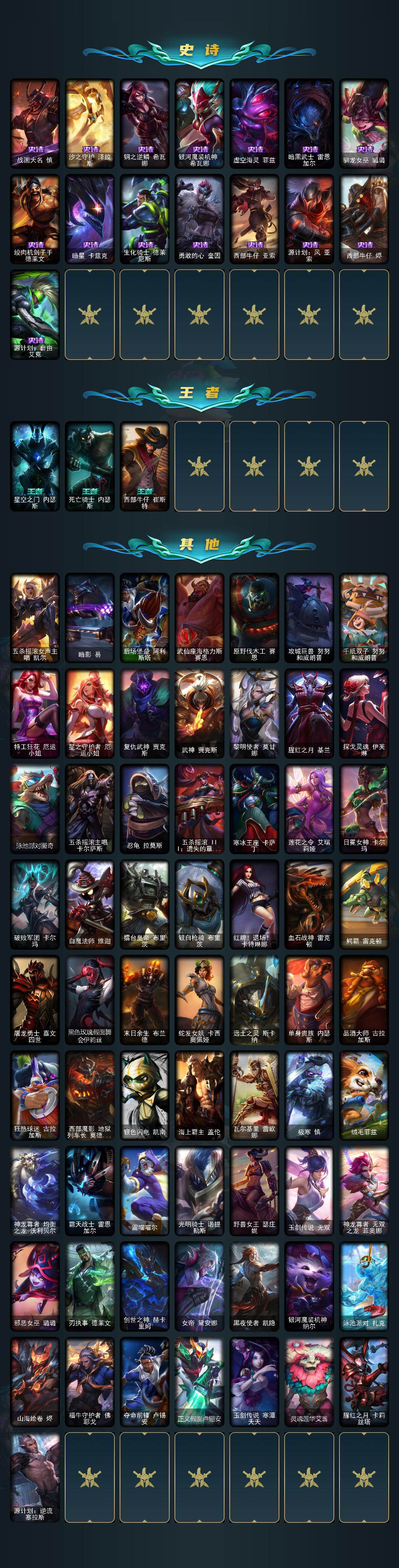 【史诗皮肤】:腥红之月崔斯特,战场公主希维尔,钢铁之心希维尔,圣洁化身索拉卡,兔宝宝提莫,国王泰达米尔,殇之机器人阿木木,武动巅峰萨科,掠星魔刃卡萨丁,霸天巨兽墨菲特,海贼魅影卡特琳娜,蓝焰梦魔魔腾,龙骑统帅嘉文四世,死亡绽放伊莉丝,三昧真火孙悟空,至高之拳李青,屠龙勇士薇恩,四神之力乌迪尔,星之守护者波比,面包之王潘森,死亡领主莫德凯撒,铁血女忍阿卡丽,刺客信条凯南,刺客信条锐雯,血色精锐锐雯,侏罗纪化石克格莫,战地机甲克格莫,腥红之月鬼武者慎,战国大名慎,沙之守护泽拉斯,钢之逆鳞希瓦娜,银河魔装机神希瓦娜,虚空海灵菲兹,暗黑武士雷恩加尔,驯龙女巫璐璐,绞肉机刽子手德莱文,暗星卡兹克,生化骑士德莱厄斯,勇敢的心奎因,西部牛仔亚索,源计划风亚索,西部牛仔烬,源计划自由艾克