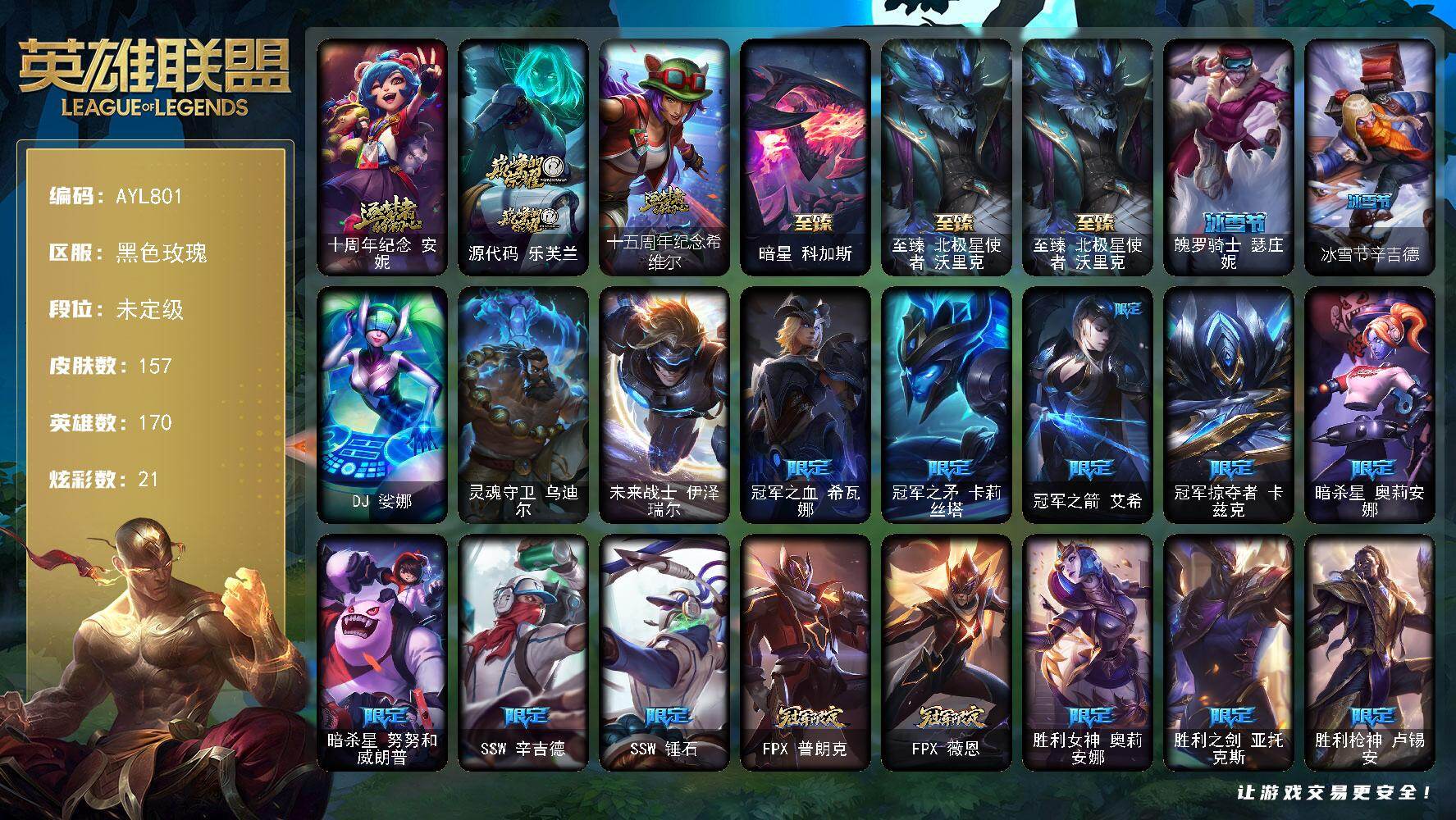 [17355793]未定级段位-170英雄-157皮肤-21炫彩-3终极-5神话-24限定-15传说-43史诗 【神话皮肤】:十周年纪念安妮,源代码乐芙兰,十五周年纪念希维尔,暗星科加斯,至臻北极星使者沃里克 【至臻皮肤】:至臻北极星使者沃里克 【臻彩皮肤】:魔女阿卡丽虚荣 【冰雪限定】:魄罗骑士瑟庄妮,冰雪节辛吉德 【终极皮肤】:DJ娑娜,灵魂守卫乌迪尔,未来战士伊泽瑞尔 【限定皮肤】:冠军之血希瓦娜,冠军之矛卡莉丝塔,冠军之箭艾希,冠军掠夺者卡兹克,暗杀星奥莉安娜,暗杀星努努和威朗普,SSW辛吉德,SSW锤石,FPX普朗克,FPX薇恩,胜利女神奥莉安娜,胜利之剑亚托克斯,胜利枪神卢锡安,胜利机器人布里茨,鬼影森森茂凯,泳池派对格雷福斯,泳池派对凯特琳,泳池派对雷克顿,暗影沃里克,波比的巧克力工坊,都铎王朝图奇,惊悚派对费德提克 【传说皮肤】:地狱之门卫士加里奥,战场女武神凯尔,烈焰雄心崔丝塔娜,合金巨兽努努和威朗普,女皇艾希,最终BOSS维迦,陆地王者4WD布里茨,炼狱魔犬内瑟斯,冰霜亚龙希瓦娜,焰尾妖狐阿狸,宇航员诺提勒斯,金牌主播德莱文,霸天异形卡兹克,神王德莱厄斯,蔷薇绅士杰斯 【史诗皮肤】:腥红之月崔斯特,战场公主希维尔,钢铁之心希维尔,圣洁化身索拉卡,兔宝宝提莫,国王泰达米尔,殇之机器人阿木木,武动巅峰萨科,掠星魔刃卡萨丁,霸天巨兽墨菲特,海贼魅影卡特琳娜,蓝焰梦魔魔腾,龙骑统帅嘉文四世,死亡绽放伊莉丝,三昧真火孙悟空,至高之拳李青,屠龙勇士薇恩,四神之力乌迪尔,星之守护者波比,面包之王潘森,死亡领主莫德凯撒,铁血女忍阿卡丽,刺客信条凯南,刺客信条锐雯,血色精锐锐雯,侏罗纪化石克格莫,战地机甲克格莫,腥红之月鬼武者慎,战国大名慎,沙之守护泽拉斯,钢之逆鳞希瓦娜,银河魔装机神希瓦娜,虚空海灵菲兹,暗黑武士雷恩加尔,驯龙女巫璐璐,绞肉机刽子手德莱文,暗星卡兹克,生化骑士德莱厄斯,勇敢的心奎因,西部牛仔亚索,源计划风亚索,西部牛仔烬,源计划自由艾克 【王者皮肤】:星空之门内瑟斯,死亡骑士内瑟斯,西部牛仔崔斯特 【其他皮肤1】:五杀摇滚女声主唱凯尔,暗影易,后场堡垒阿利斯塔,武仙座海格力斯赛恩,原野伐木工赛恩,攻城巨兽努努和威朗普,千纸双子努努和威朗普,特工狂花厄运小姐,星之守护者厄运小姐,复仇武神贾克斯,武神贾克斯,黎明使者莫甘娜,腥红之月基兰,探戈灵魂伊芙琳,泳池派对图奇,