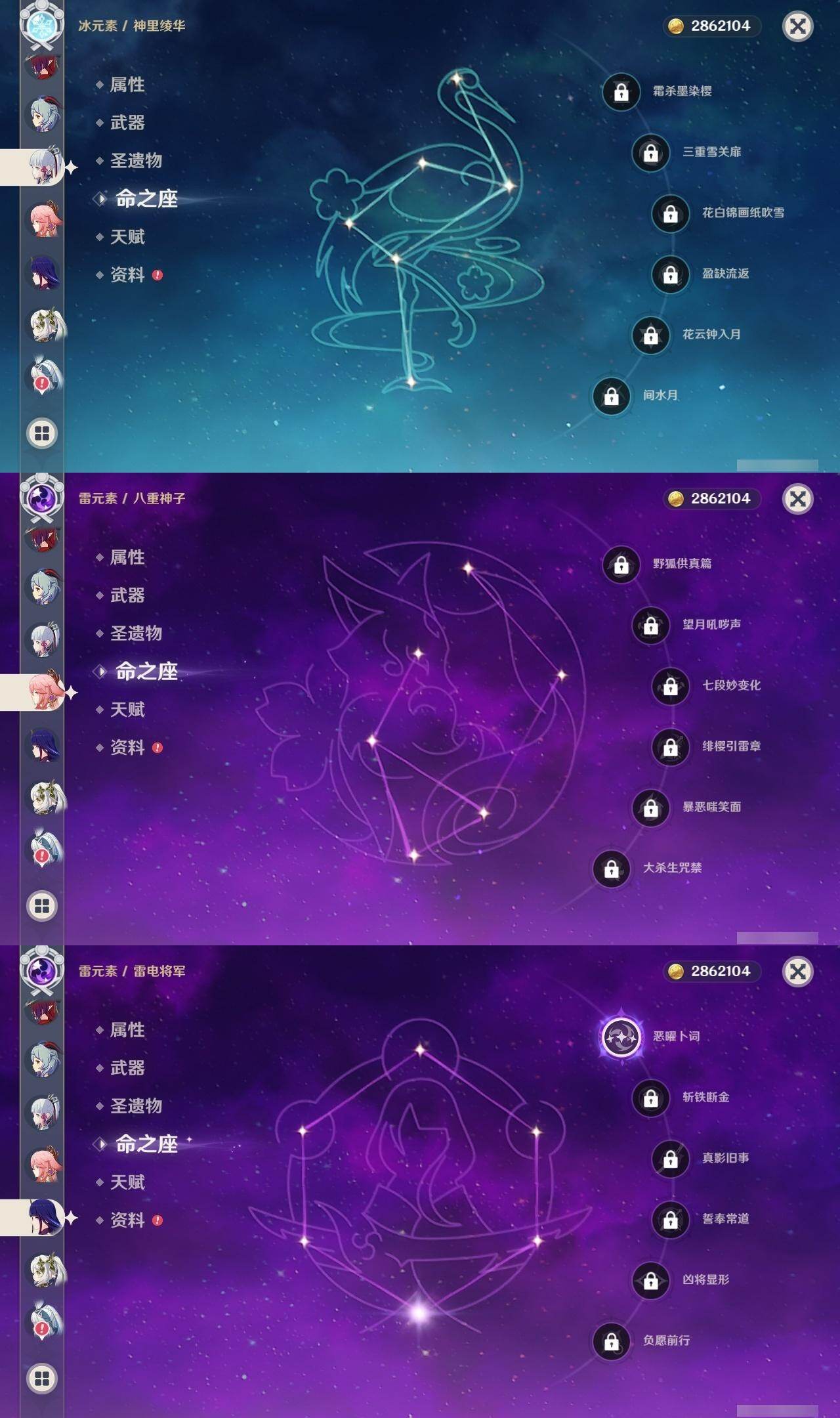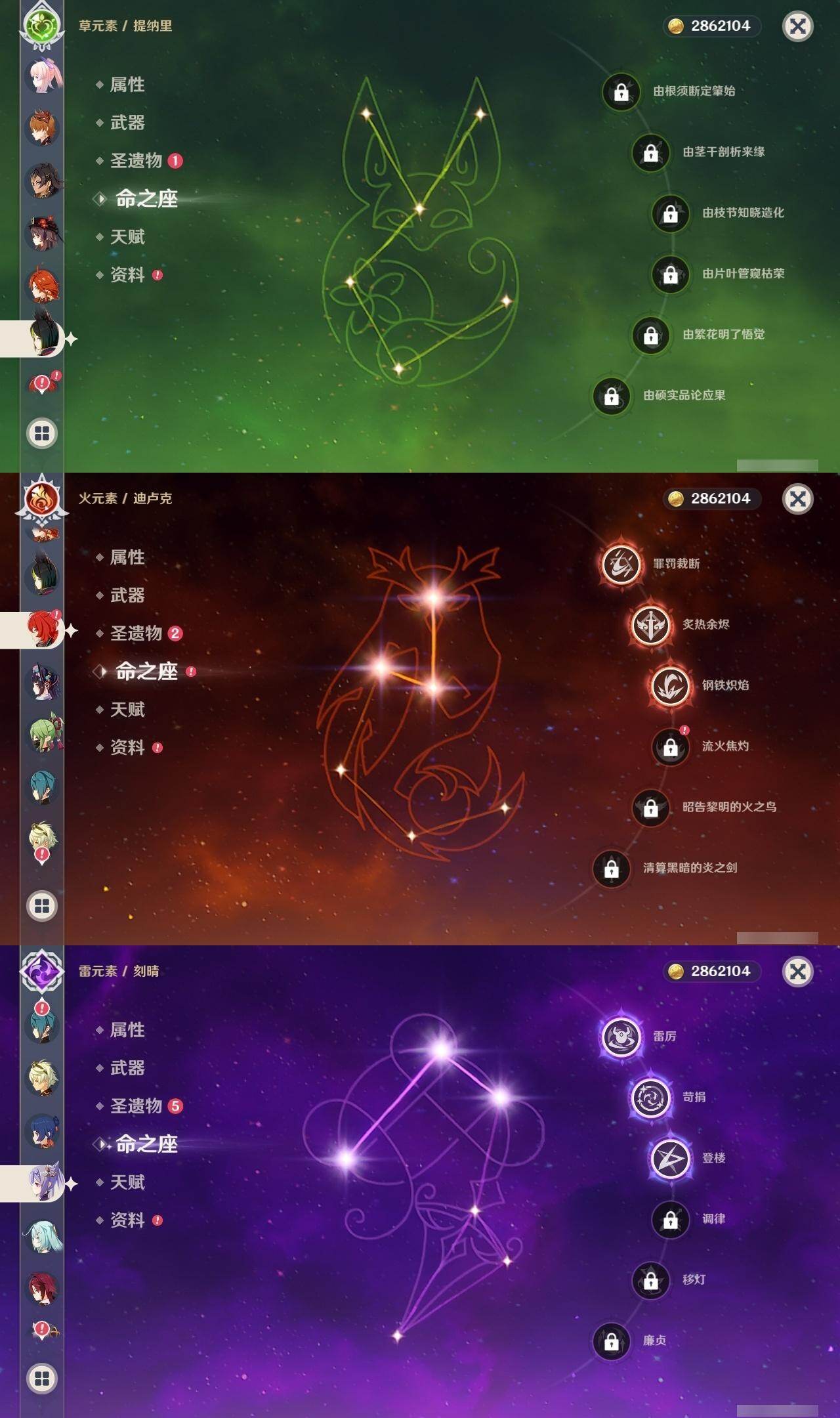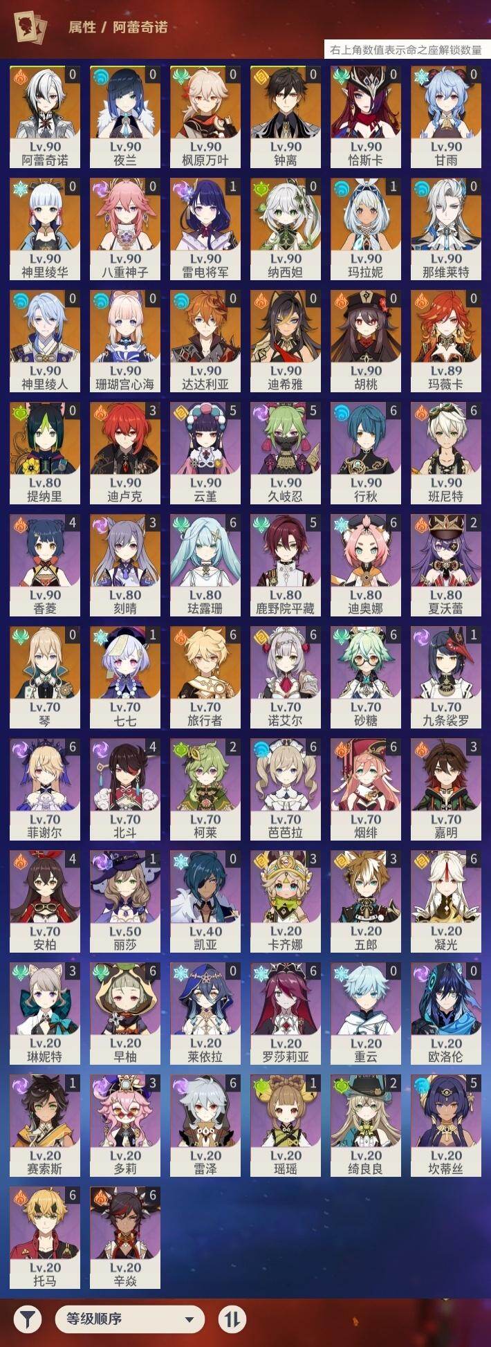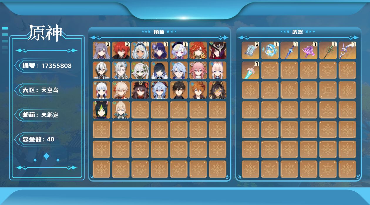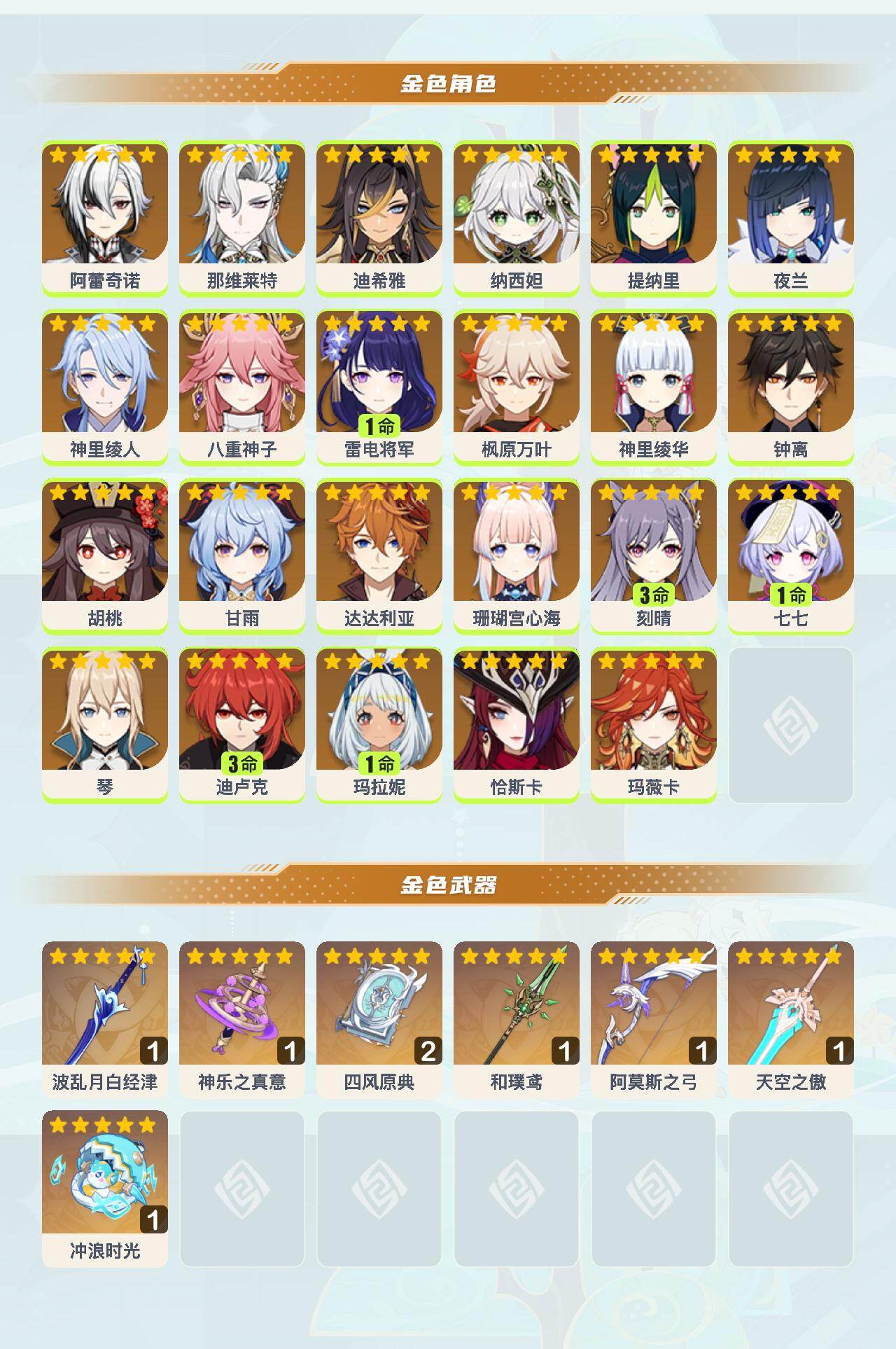 0命阿蕾奇诺,0命那维莱特,0命迪希雅,0命纳西妲,0命提纳里,0命夜兰,0命神里绫人,0命八重神子,1命雷电将军,0命枫原万叶,0命神里绫华,0命钟离,0命胡桃,0命甘雨,0命达达利亚,0命珊瑚宫心海,3命刻晴,1命七七,0命琴,3命迪卢克,1命玛拉妮,0命恰斯卡,0命玛薇卡,精1波乱月白经津,精1神乐之真意,精2四风原典,精1和璞鸢,精1阿莫斯之弓,精1天空之傲,精1冲浪时光