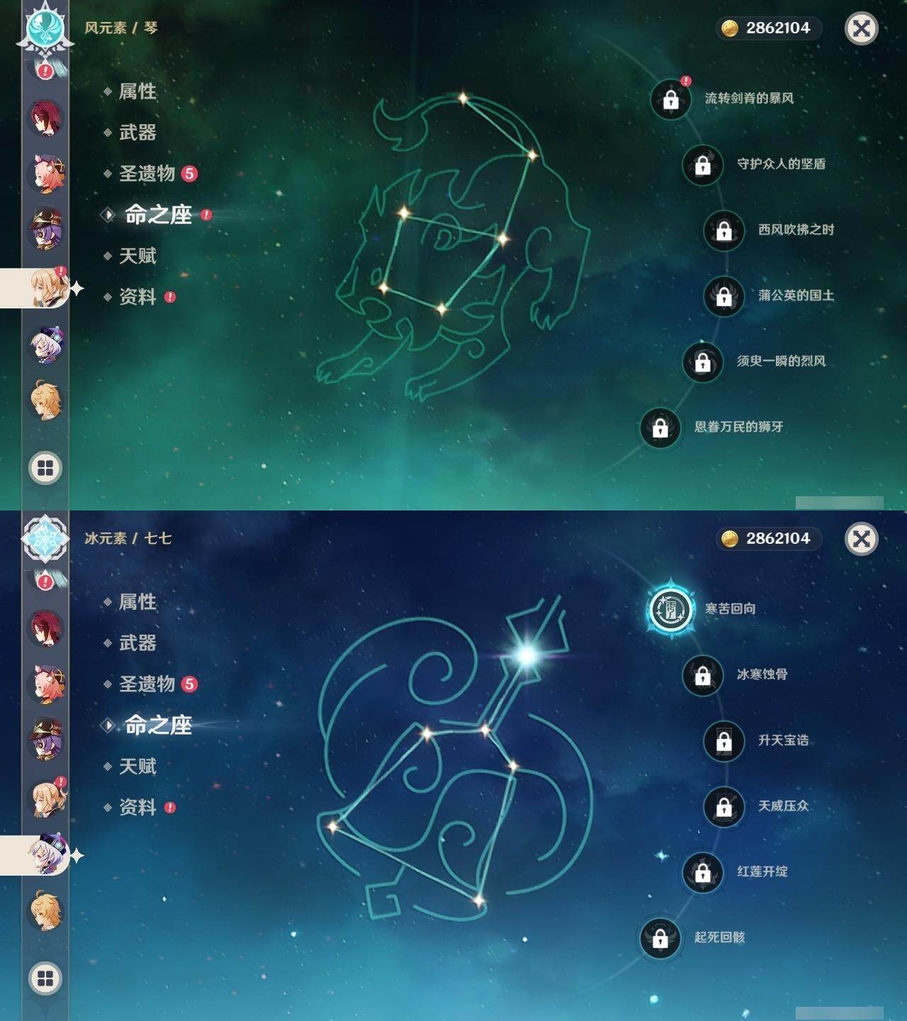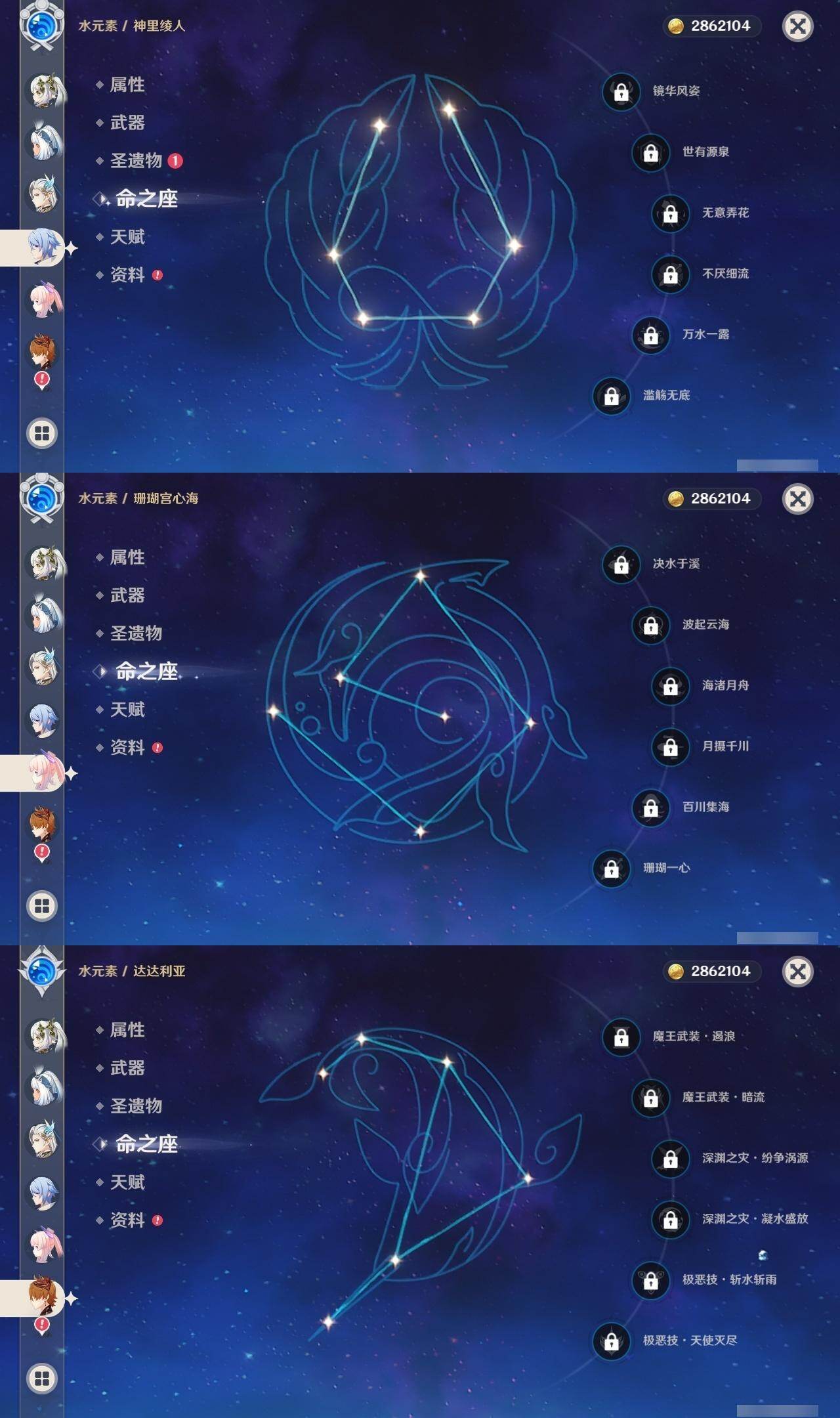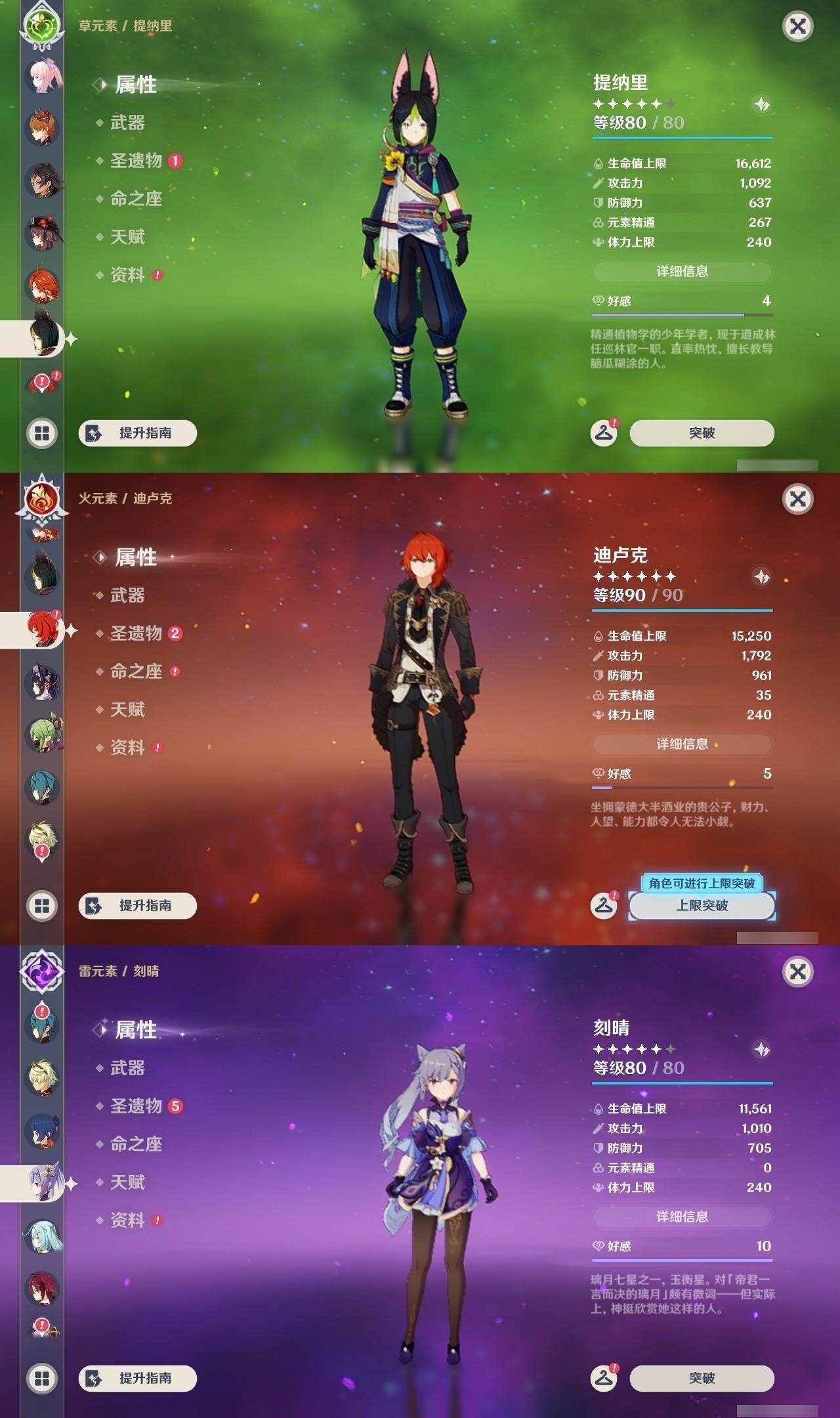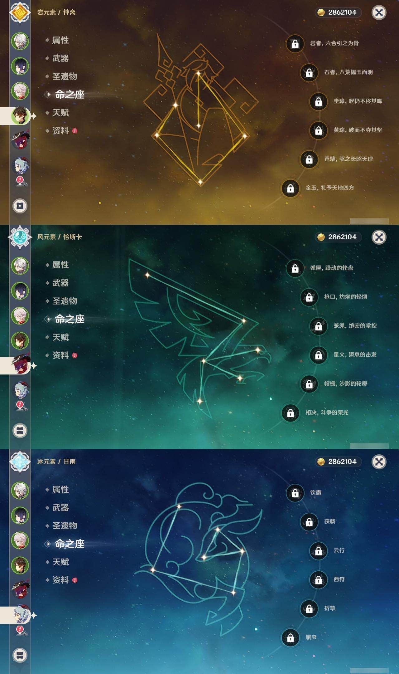 0命阿蕾奇诺,0命那维莱特,0命迪希雅,0命纳西妲,0命提纳里,0命夜兰,0命神里绫人,0命八重神子,1命雷电将军,0命枫原万叶,0命神里绫华,0命钟离,0命胡桃,0命甘雨,0命达达利亚,0命珊瑚宫心海,3命刻晴,1命七七,0命琴,3命迪卢克,1命玛拉妮,0命恰斯卡,0命玛薇卡,精1波乱月白经津,精1神乐之真意,精2四风原典,精1和璞鸢,精1阿莫斯之弓,精1天空之傲,精1冲浪时光
