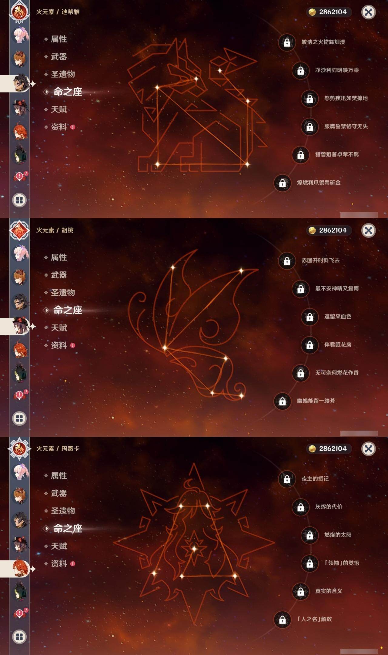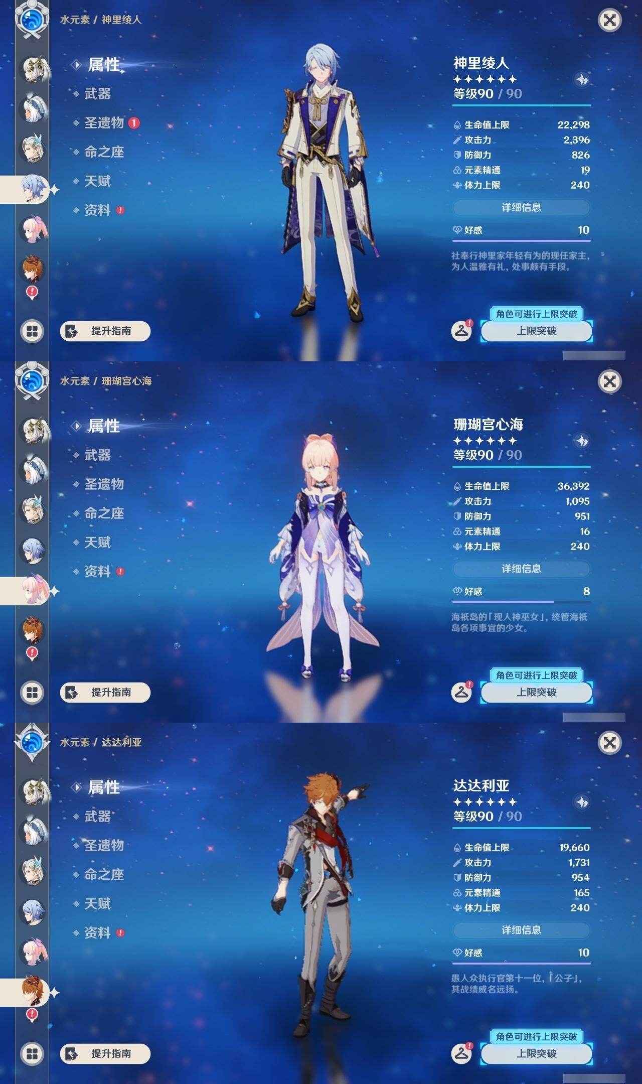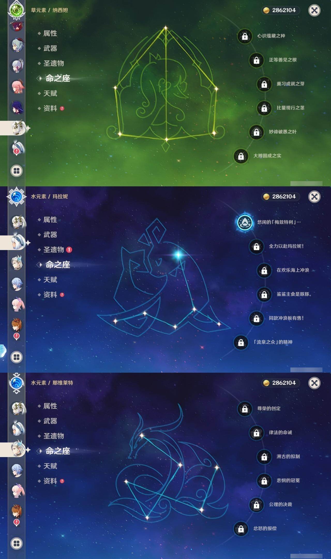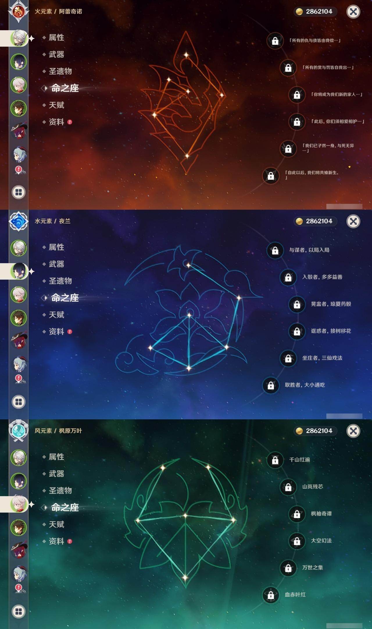 0命阿蕾奇诺,0命那维莱特,0命迪希雅,0命纳西妲,0命提纳里,0命夜兰,0命神里绫人,0命八重神子,1命雷电将军,0命枫原万叶,0命神里绫华,0命钟离,0命胡桃,0命甘雨,0命达达利亚,0命珊瑚宫心海,3命刻晴,1命七七,0命琴,3命迪卢克,1命玛拉妮,0命恰斯卡,0命玛薇卡,精1波乱月白经津,精1神乐之真意,精2四风原典,精1和璞鸢,精1阿莫斯之弓,精1天空之傲,精1冲浪时光