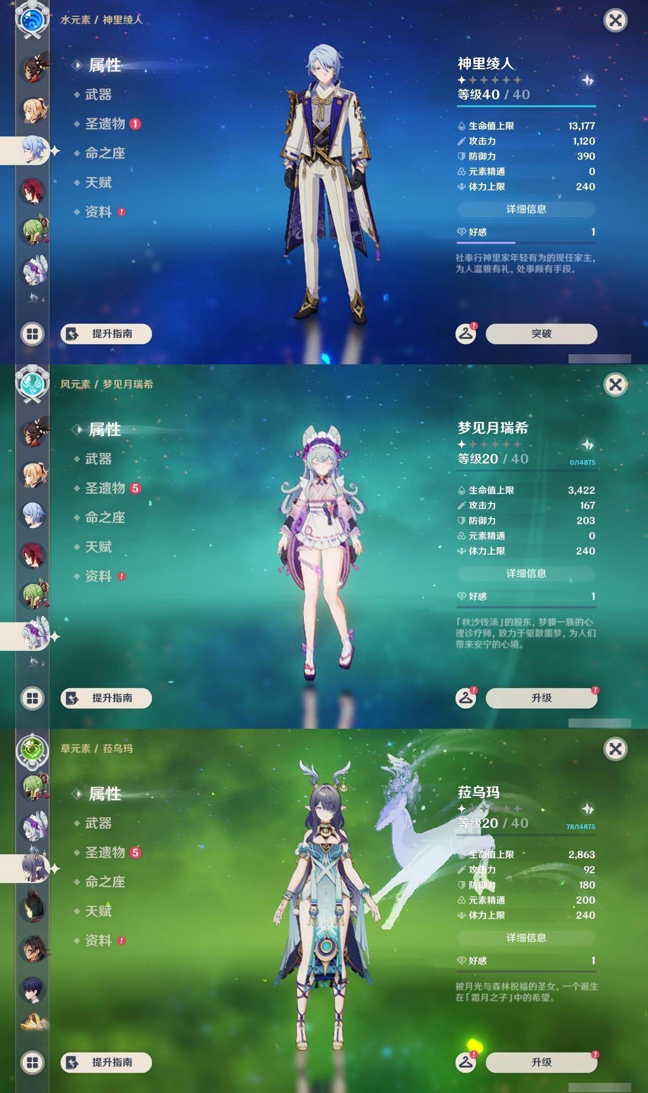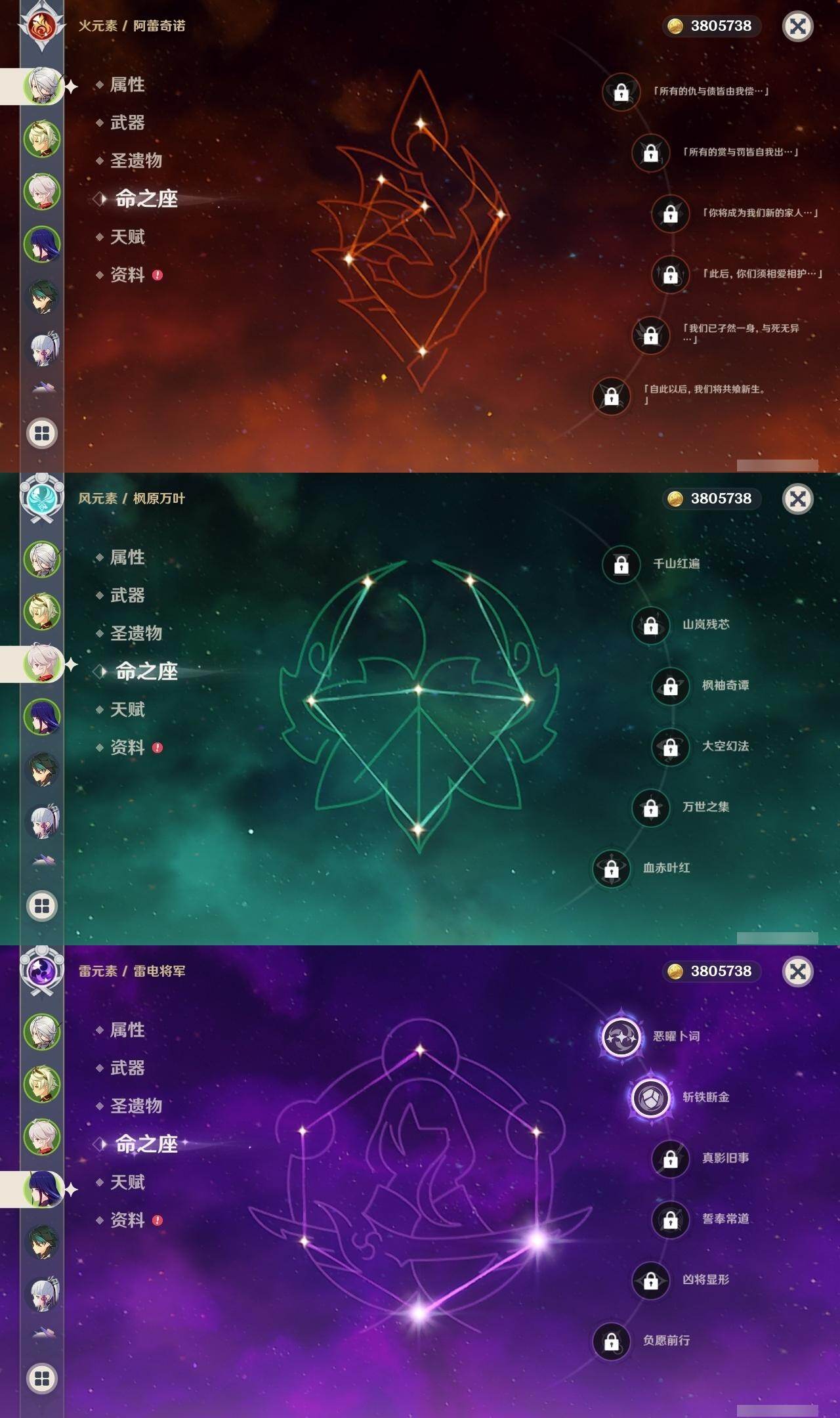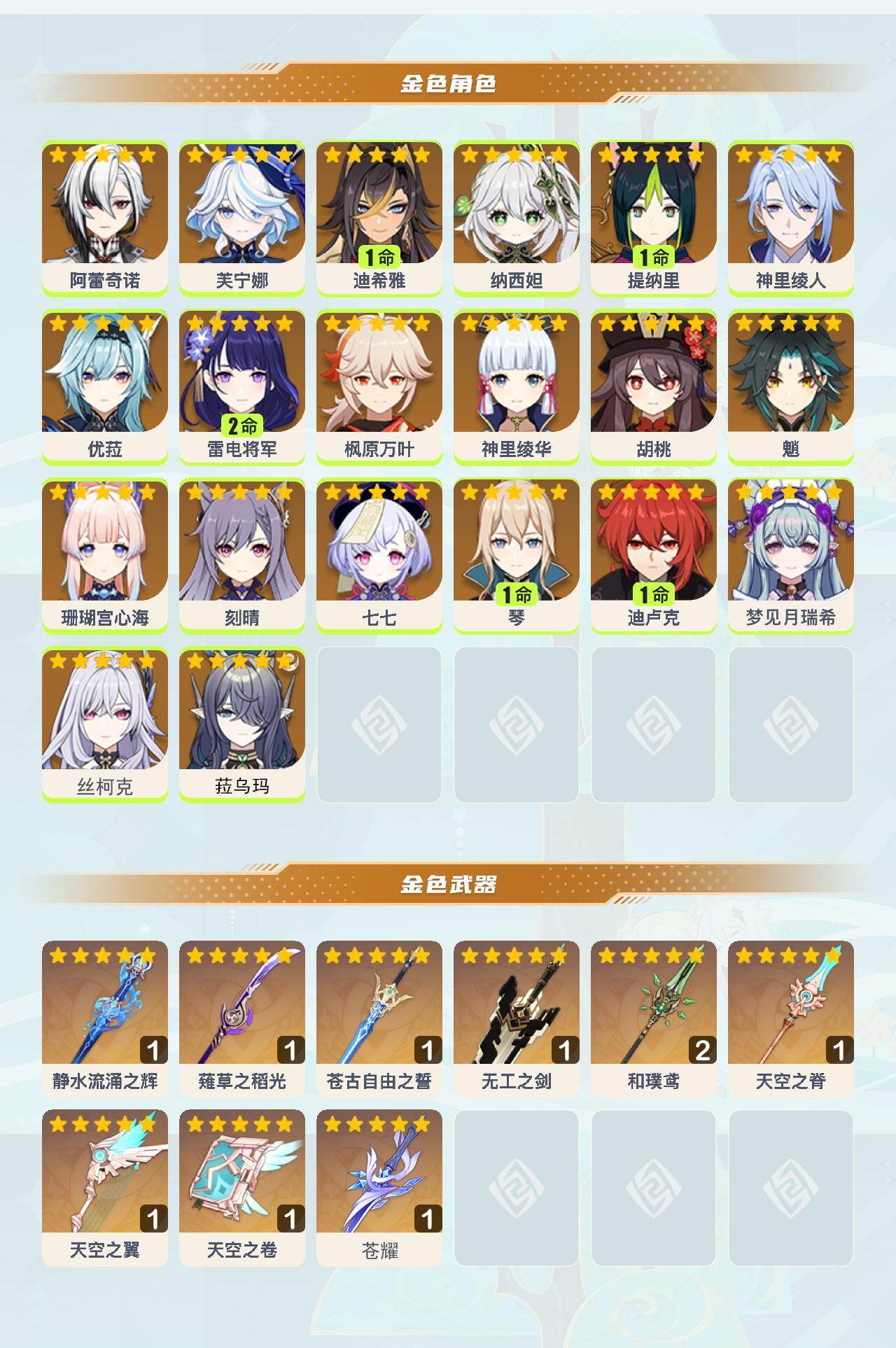 0命阿蕾奇诺,0命芙宁娜,1命迪希雅,0命纳西妲,1命提纳里,0命神里绫人,0命优菈,2命雷电将军,0命枫原万叶,0命神里绫华,0命胡桃,0命魈,0命珊瑚宫心海,0命刻晴,0命七七,1命琴,1命迪卢克,0命梦见月瑞希,0命丝柯克,0命菈乌玛,精1静水流涌之辉,精1薙草之稻光,精1苍古自由之誓,精1无工之剑,精2和璞鸢,精1天空之脊,精1天空之翼,精1天空之卷,精1苍耀