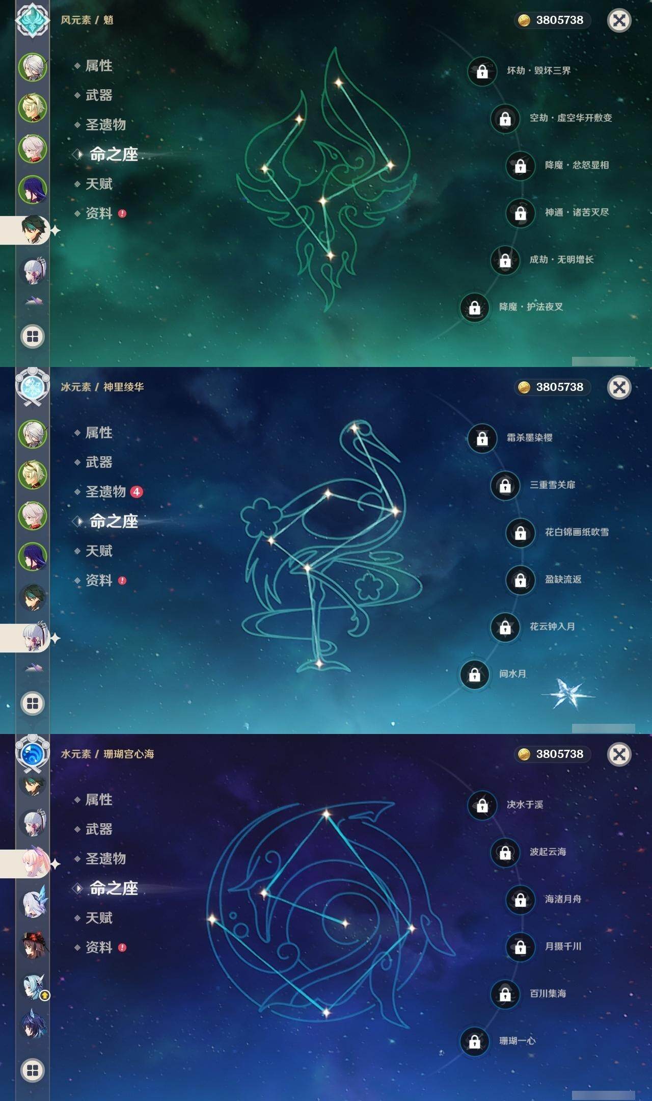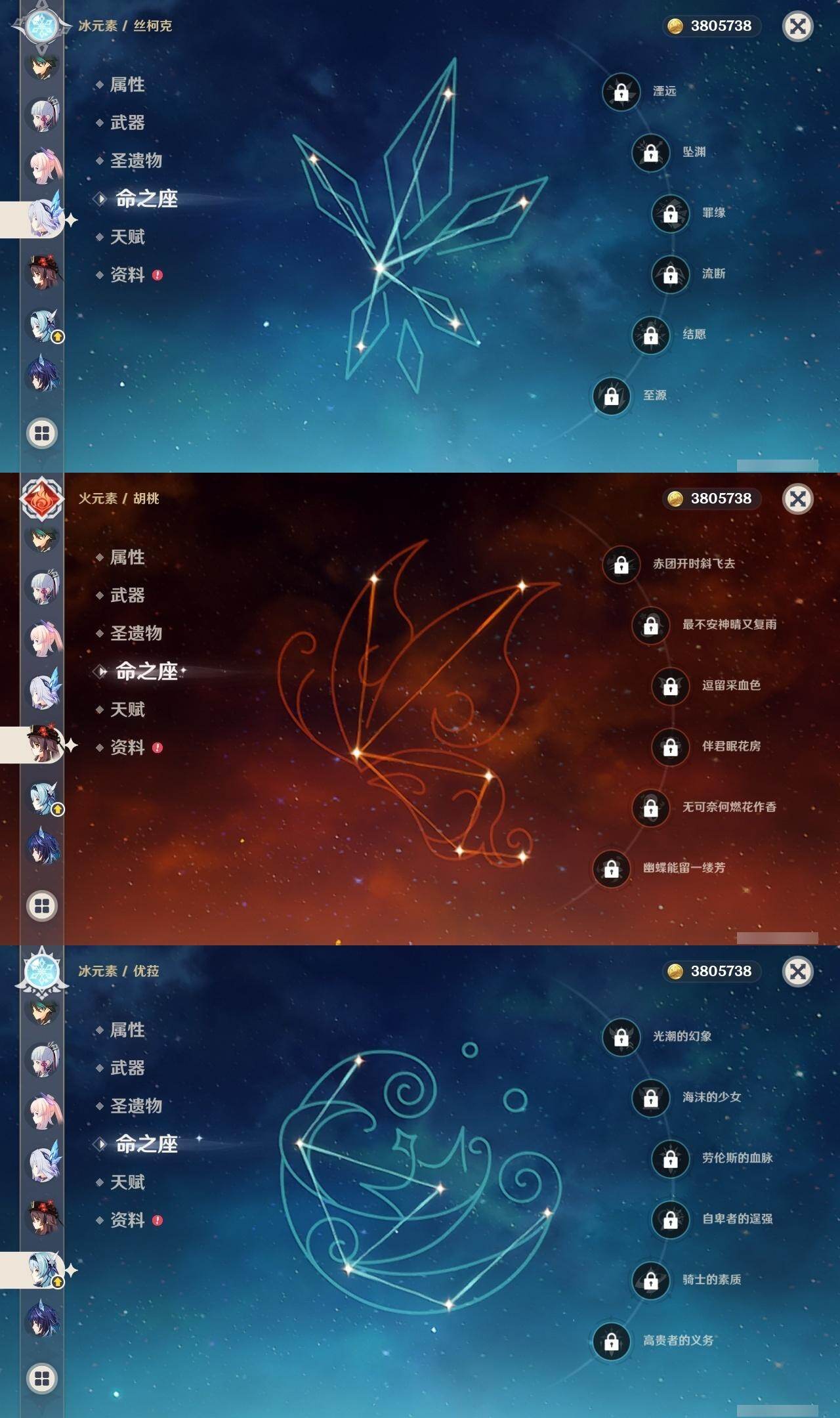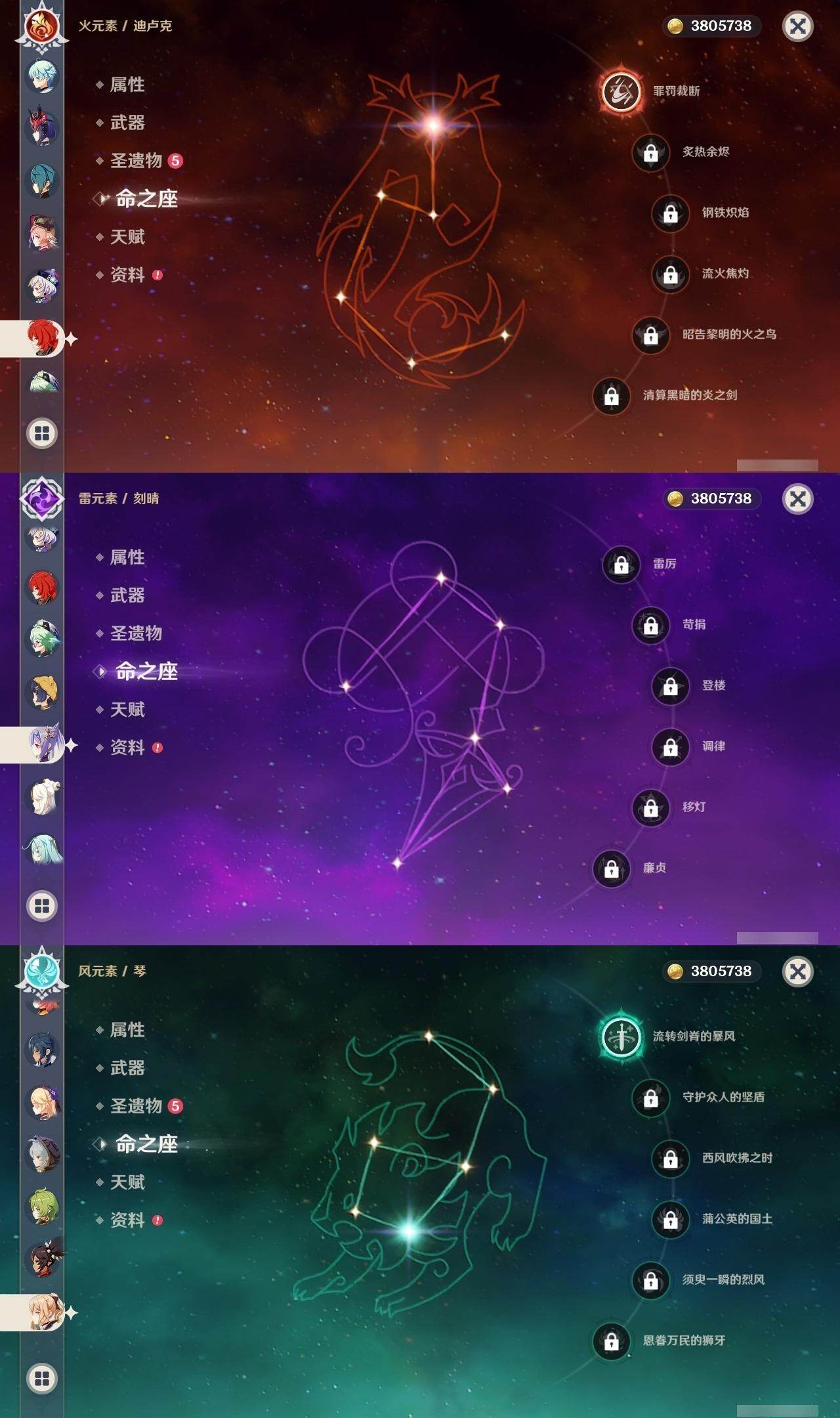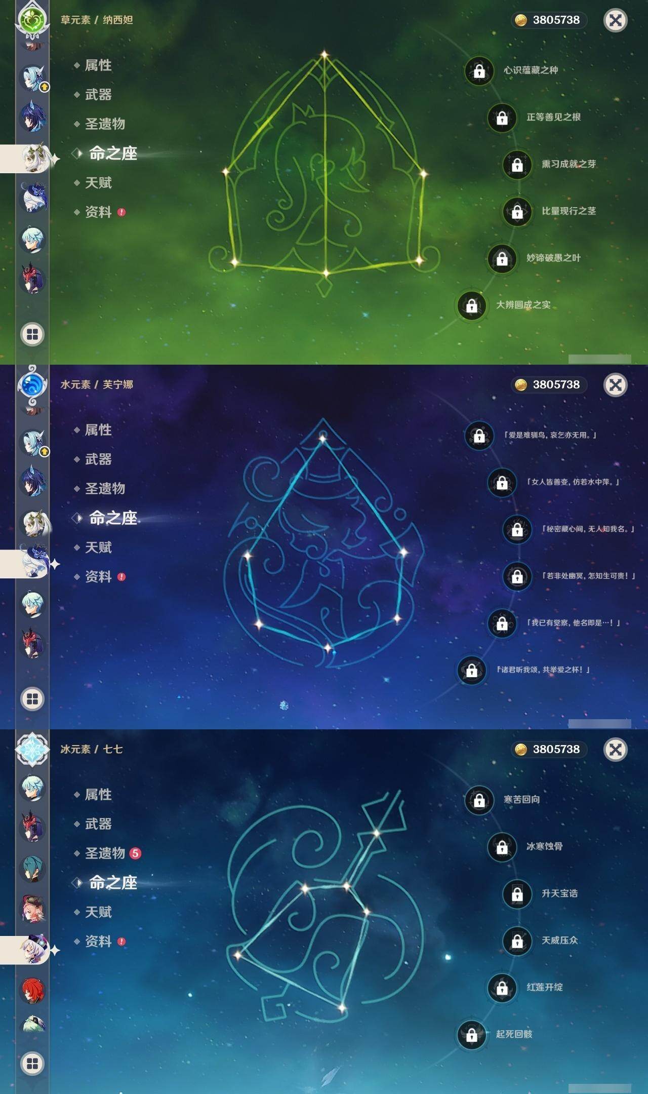 0命阿蕾奇诺,0命芙宁娜,1命迪希雅,0命纳西妲,1命提纳里,0命神里绫人,0命优菈,2命雷电将军,0命枫原万叶,0命神里绫华,0命胡桃,0命魈,0命珊瑚宫心海,0命刻晴,0命七七,1命琴,1命迪卢克,0命梦见月瑞希,0命丝柯克,0命菈乌玛,精1静水流涌之辉,精1薙草之稻光,精1苍古自由之誓,精1无工之剑,精2和璞鸢,精1天空之脊,精1天空之翼,精1天空之卷,精1苍耀