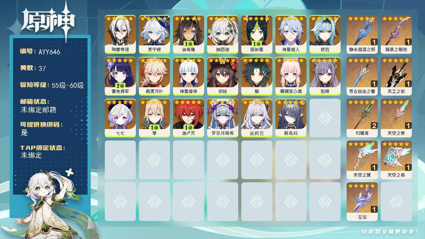 [17355854]59级/37黄/女主/20个五星角色/10个五星武器 0命阿蕾奇诺,0命芙宁娜,1命迪希雅,0命纳西妲,1命提纳里,0命神里绫人,0命优菈,2命雷电将军,0命枫原万叶,0命神里绫华,0命胡桃,0命魈,0命珊瑚宫心海,0命刻晴,0命七七,1命琴,1命迪卢克,0命梦见月瑞希,0命丝柯克,0命菈乌玛,精1静水流涌之辉,精1薙草之稻光,精1苍古自由之誓,精1无工之剑,精2和璞鸢,精1天空之脊,精1天空之翼,精1天空之卷,精1苍耀