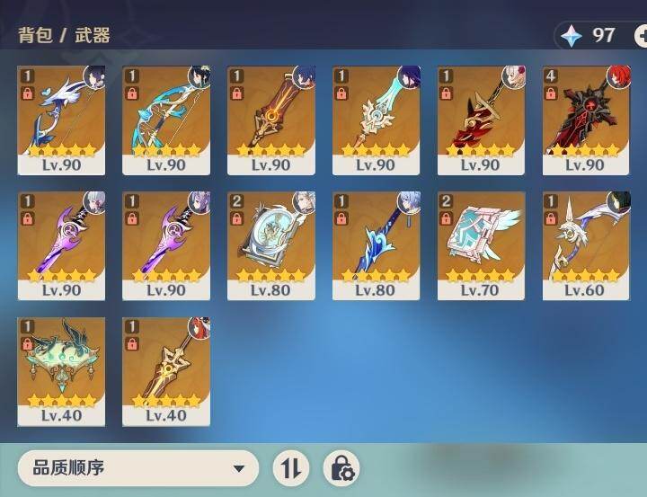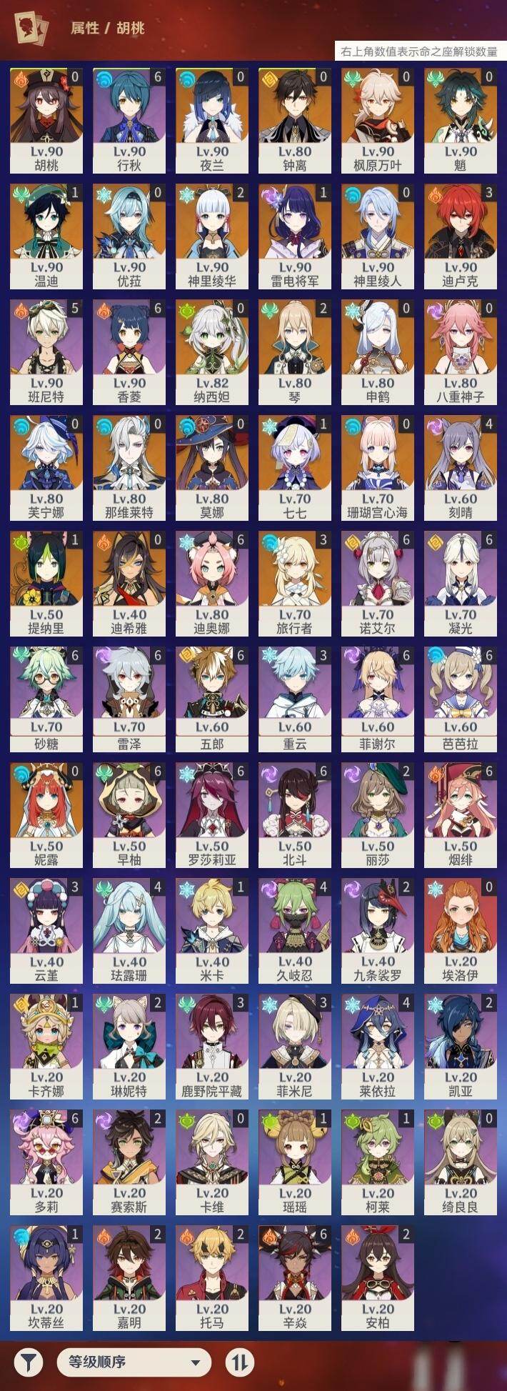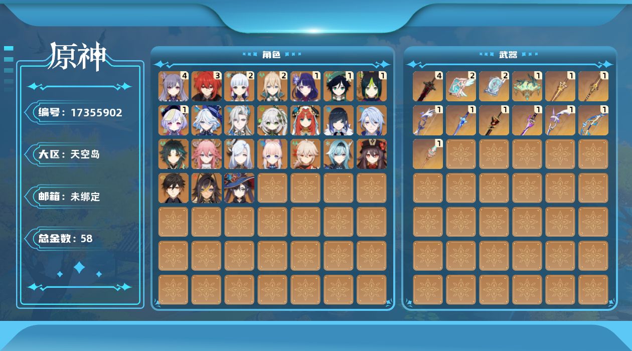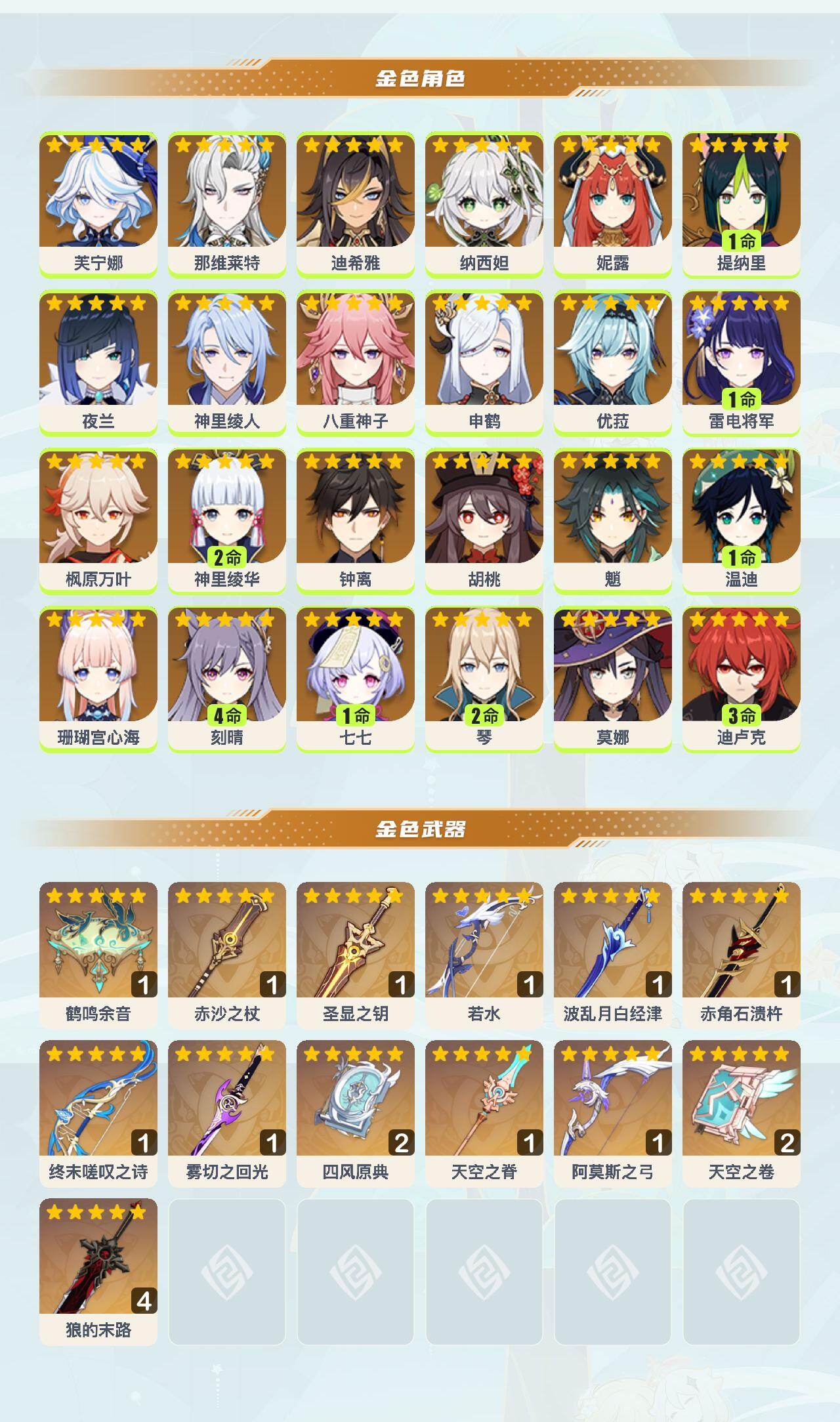 0命芙宁娜,0命那维莱特,0命迪希雅,0命纳西妲,0命妮露,1命提纳里,0命夜兰,0命神里绫人,0命八重神子,0命申鹤,0命优菈,1命雷电将军,0命枫原万叶,2命神里绫华,0命钟离,0命胡桃,0命魈,1命温迪,0命珊瑚宫心海,4命刻晴,1命七七,2命琴,0命莫娜,3命迪卢克,精1鹤鸣余音,精1赤沙之杖,精1圣显之钥,精1若水,精1波乱月白经津,精1赤角石溃杵,精1终末嗟叹之诗,精1雾切之回光,精2四风原典,精1天空之脊,精1阿莫斯之弓,精2天空之卷,精4狼的末路