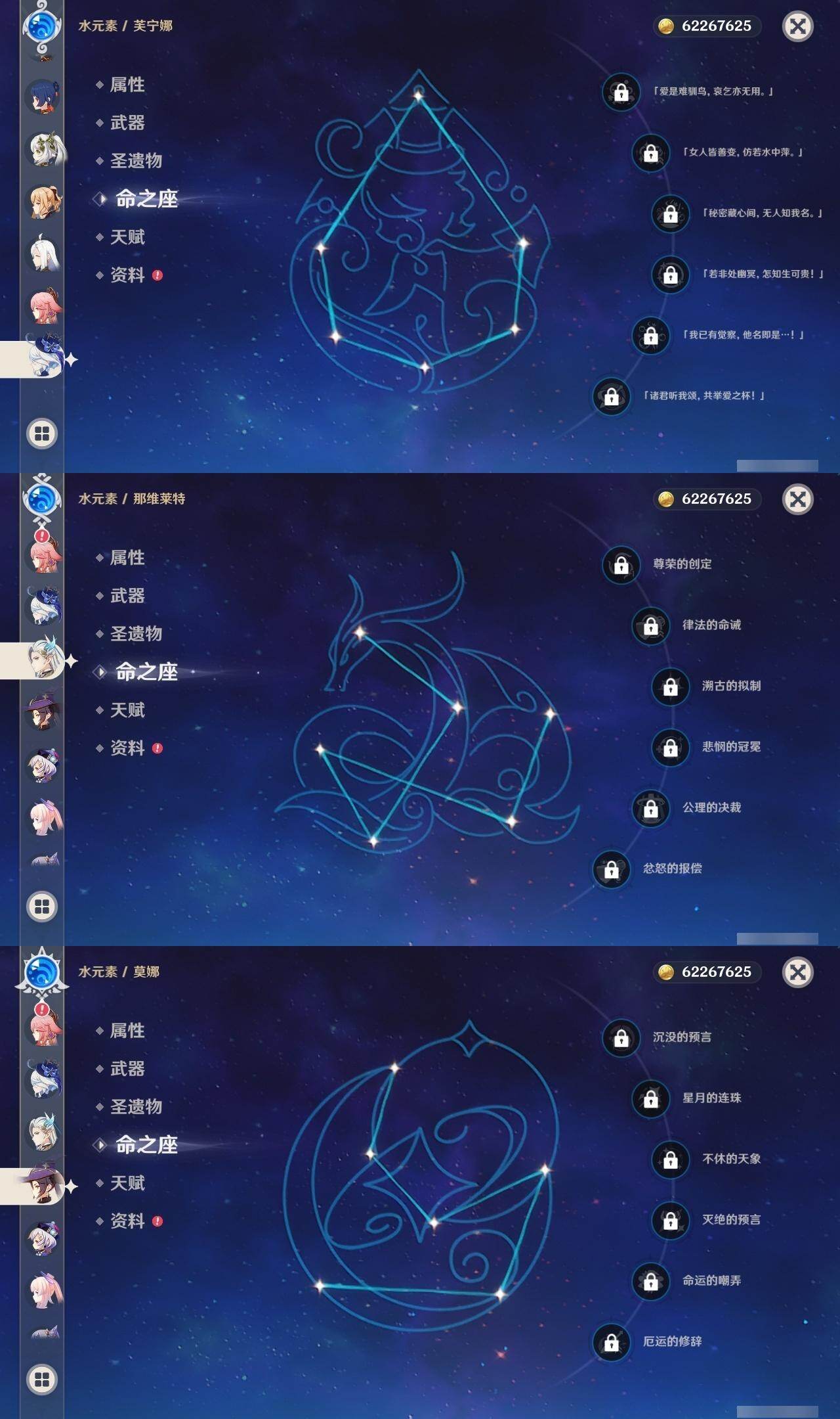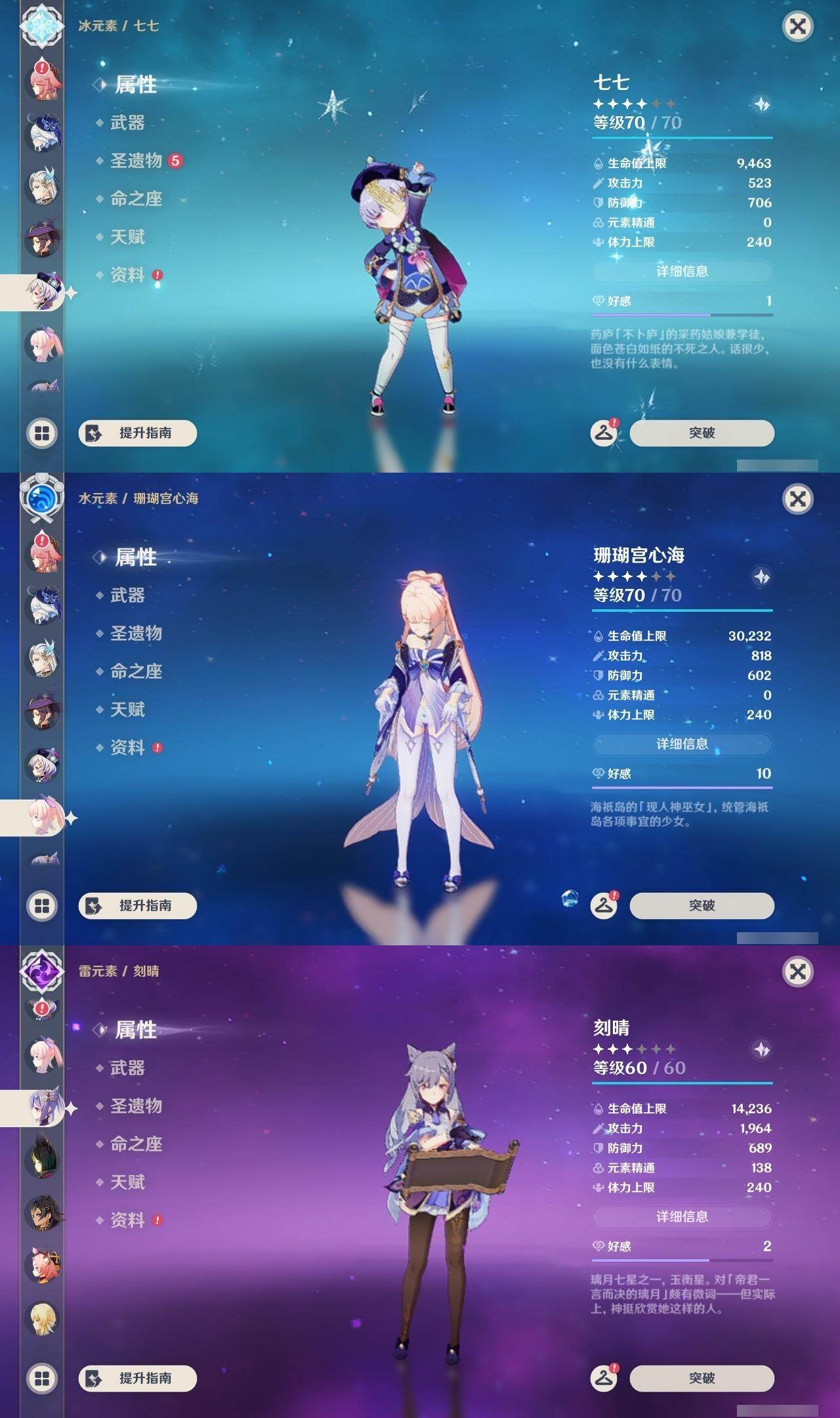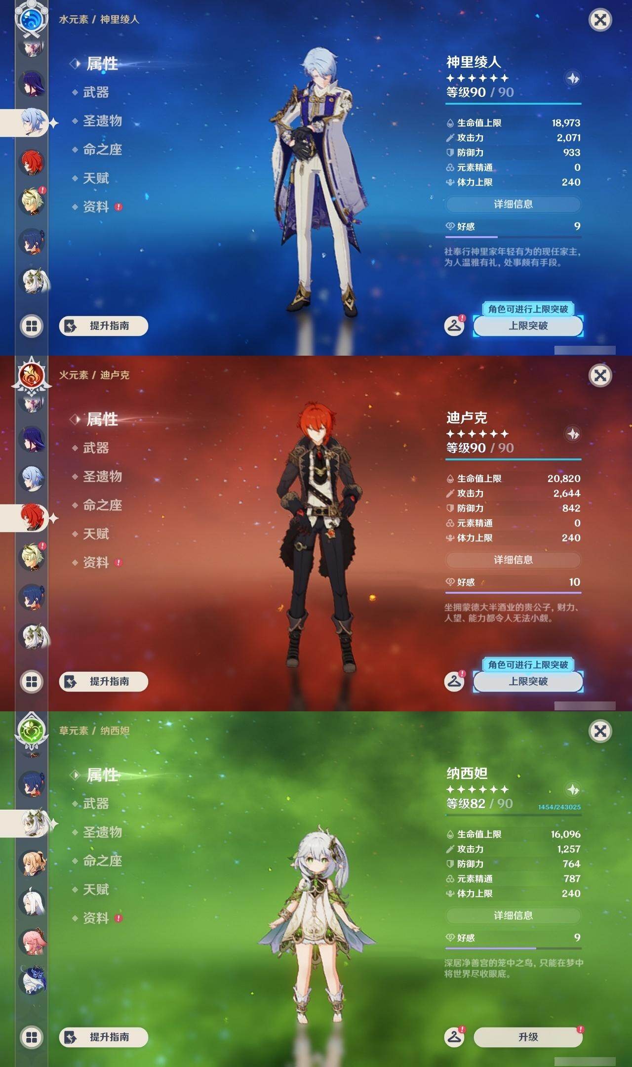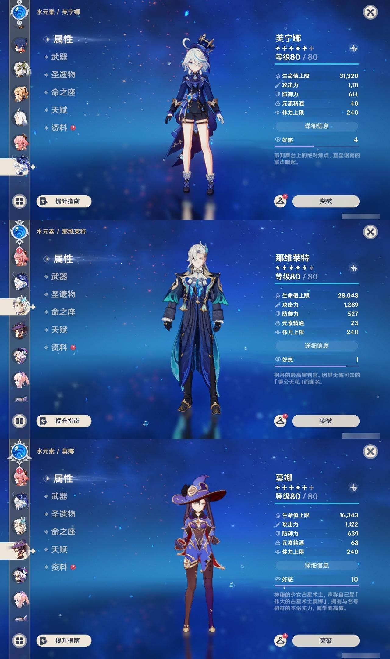 0命芙宁娜,0命那维莱特,0命迪希雅,0命纳西妲,0命妮露,1命提纳里,0命夜兰,0命神里绫人,0命八重神子,0命申鹤,0命优菈,1命雷电将军,0命枫原万叶,2命神里绫华,0命钟离,0命胡桃,0命魈,1命温迪,0命珊瑚宫心海,4命刻晴,1命七七,2命琴,0命莫娜,3命迪卢克,精1鹤鸣余音,精1赤沙之杖,精1圣显之钥,精1若水,精1波乱月白经津,精1赤角石溃杵,精1终末嗟叹之诗,精1雾切之回光,精2四风原典,精1天空之脊,精1阿莫斯之弓,精2天空之卷,精4狼的末路