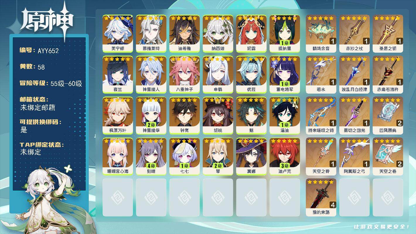 [17355902]60级/58黄/女主/24个五星角色/14个五星武器 0命芙宁娜,0命那维莱特,0命迪希雅,0命纳西妲,0命妮露,1命提纳里,0命夜兰,0命神里绫人,0命八重神子,0命申鹤,0命优菈,1命雷电将军,0命枫原万叶,2命神里绫华,0命钟离,0命胡桃,0命魈,1命温迪,0命珊瑚宫心海,4命刻晴,1命七七,2命琴,0命莫娜,3命迪卢克,精1鹤鸣余音,精1赤沙之杖,精1圣显之钥,精1若水,精1波乱月白经津,精1赤角石溃杵,精1终末嗟叹之诗,精1雾切之回光,精2四风原典,精1天空之脊,精1阿莫斯之弓,精2天空之卷,精4狼的末路