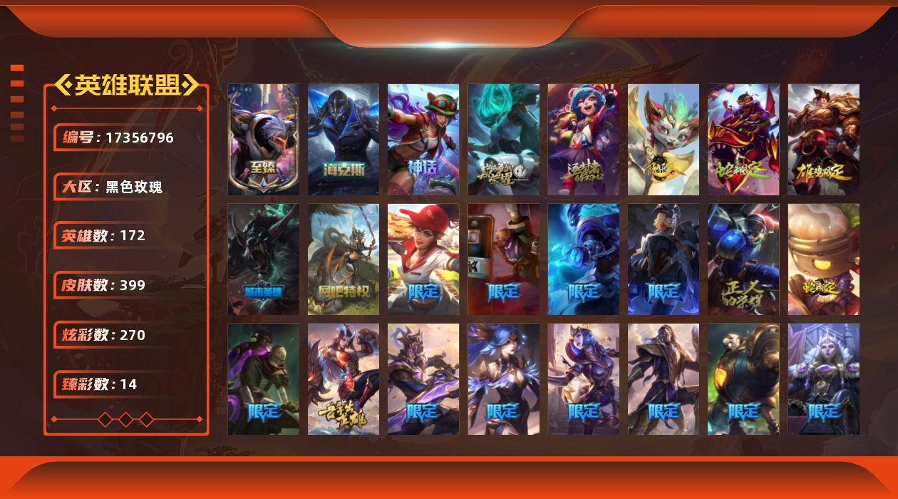 [17356796]【店主推荐捡漏号】未定级段位-172英雄-399皮肤-270炫彩-0终极-6神话-43限定-39传说-93史诗
