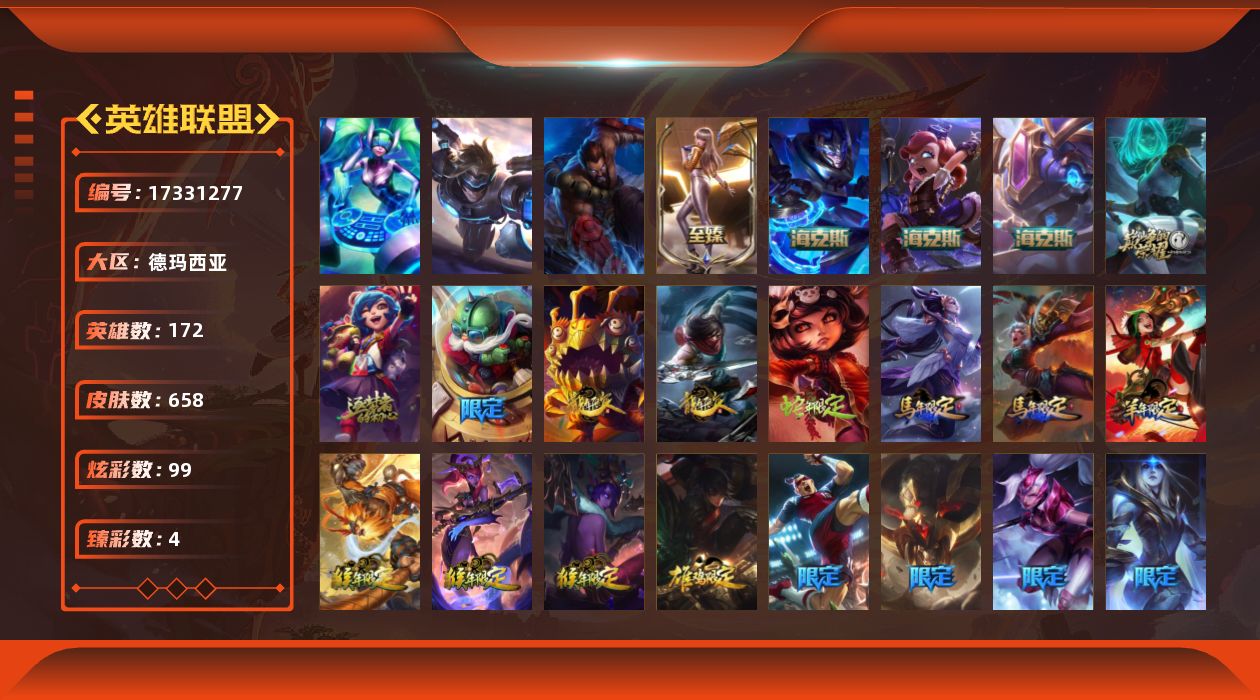 [17331277]未定级段位-172英雄-658皮肤-99炫彩-3终极-6神话-120限定-55传说-177史诗
