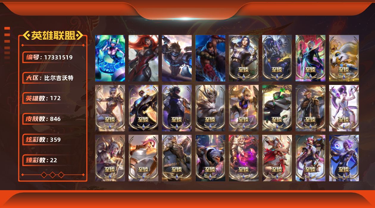 铂金段位-172英雄-846皮肤-359炫彩-4终极-46神话-139限定-77传说-170史诗