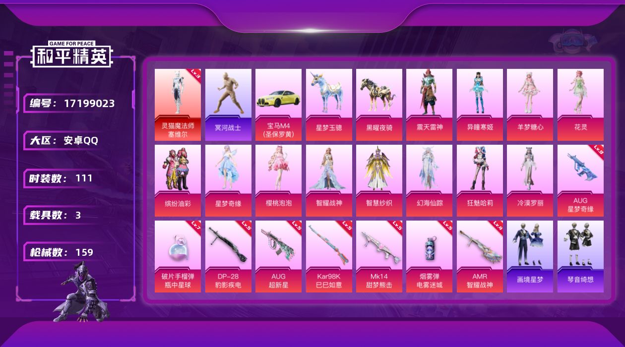 [17199023]【1670】安卓 手Q-1神装-12粉装-8特效枪-3载具-4粉色飞行器-59077热力值-5王牌印记-111套装-159枪皮 【红色神装等级】:灵猫魔法师-塞维尔(三级) 【红色角色神装】:灵猫魔法师-塞维尔 【热门品类】:粉装-缤纷油彩,套装-浪漫天命,套装-冥河战士,套装-暗影哥特 【粉色套装】:粉装-缤纷油彩,角色-星梦奇缘,角色-樱桃泡泡,角色-智耀战神,角色-智慧纱织,角色-幻海仙踪,角色-狂魅哈莉,角色-冷漠罗丽,角色-花灵,角色-羊梦糖心,角色-异瞳寒姬,角色-震天雷神 【粉色枪皮等级】:AUG-超新星(五级),AUG-星梦奇缘(九级),Kar98K-巳巳如意(五级),Mk14-甜梦熊击(五级),AMR-智耀战神(四级),DP-28-豹影疾电(五级),烟雾弹-电雾迷城(五级),破片手榴弹-瓶中星球(七级) 【粉色载具】:宝马M4(圣保罗黄),星梦玉骢,黑曜夜骑 【粉色枪皮】:AUG-超新星,AUG-星梦奇缘,Kar98K-巳巳如意,Mk14-甜梦熊击,AMR-智耀战神,DP-28-豹影疾电,烟雾弹-电雾迷城,破片手榴弹-瓶中星球 【粉色飞行器】:幻海仙踪飞行器,灵猫魔法师飞行器,无垠阁飞行器 【粉色降落伞】:绝对恒星降落伞,第五大道降落伞,星梦奇缘降落伞,金丰海韵降落伞,临安公主降落伞,樱桃泡泡降落伞,智耀战神降落伞,幻海仙踪降落伞,星穹咏叹调降落伞,辉羽雀灵降落伞,幻彩电音降落伞,双重狂想降落伞,灵猫魔法师降落伞,异瞳寒姬降落伞,天象三御降落伞,炫彩糖果降落伞 【稀有套装】:套装-巳巳如意,套装-小鸟芋圆,套装-雪国风尚,角色-许七安,角色-临安公主,角色-怀庆长公主,套装-燕燕于飞,套装-鱼渊荷华,角色-蜜桃派对,套装-粉恋花,套装-紫幽梦,套装-蓝冰羽,角色-猎影月神,角色-瑰梦爱神,角色-幽澜祭司,角色-鲛海歌灵,套装-星影赞美诗,套装-霓虹热舞,套装-极速光影,套装-彩虹兔,套装-云朵鹅,套装-雪绒豹,套装-混沌火种,套装-蜜露汐语,角色-绛羽幽主,套装-朱霞炽焰,套装-凌霄紫焰,套装-擎苍青焰,玩偶服-喜羊羊,角色-绯色魅影,角色-紫俏灵猫,角色-紫霄电母,角色-玄霖雨神,套装-画境星梦,套装-琴音绮想,套装-炫彩糖果 【稀有枪皮】:AUG-冰晶雪宝,AKM-灵猫魔法师,M16A4-冥河战士,SCAR-L-夜灯,SCAR-L-玉兔迎春,