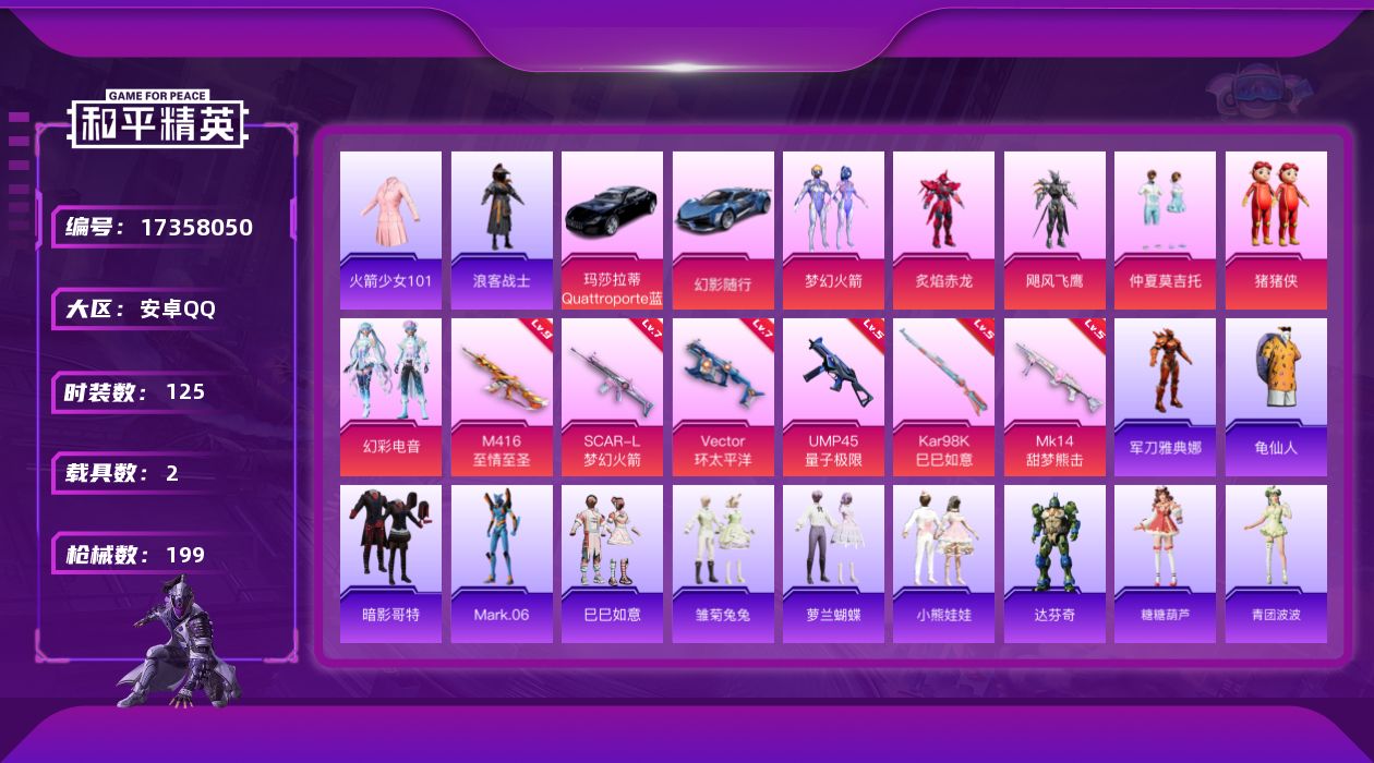 [17358050]老101/安卓 手Q-6粉装-6特效枪-2载具-1粉色飞行器-63844热力值-14王牌印记-125套装-199枪皮【热门品类】:粉装-梦幻火箭,套装-火箭少女101,角色-军刀雅典娜,套装-浪客战士,套装-龟仙人,套装-暗影哥特,角色-Mark.06【粉色套装】:粉装-梦幻火箭,粉装-炙焰赤龙,粉装-飓风飞鹰,粉装-仲夏莫吉托,玩偶服-猪猪侠,粉装-幻彩电音【粉色枪皮等级】:SCAR-L-梦幻火箭(七级),M416-至情至圣(九级),UMP45-量子极限(五级),Vector-环太平洋(七级),Kar98K-巳巳如意(五级),Mk14-甜梦熊击(五级)【粉色具】:玛莎拉蒂Quattroporte(夜幕蓝),幻影随行【粉色枪皮】:SCAR-L-梦幻火箭,M416-至情至圣,UMP45-量子极限,Vector-环太平洋,Kar98K-巳巳如意,Mk14-甜梦熊击【粉色飞行器】:繁龙极客飞行器