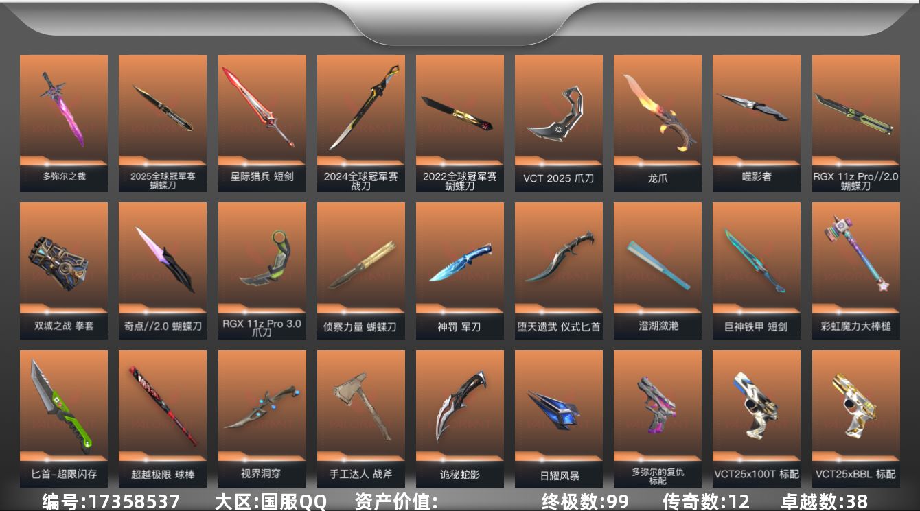 [17358537]【极品素材号/店主推荐捡漏号】}【套装】:2025全球冠军赛套装,2024全球冠军赛套装,2022全球冠军赛套装,上古龙炎套装,多弥尔的复仇套装,噬影者套装,VCT 2025 赛季套装,西部未来套装,创·纪元套装,RGX 11z Pro//3.0套装,《双城之战》收藏套装,奇点//2.0套装,回火礼包:奇点套装,般若假面//2.0套装,异鳞魔蛇套装,掠影套装,黑市套装,英雄之选套装,手工达人套装,琉璃幻梦套装【英雄】:幻棱,炼狱,维斯,暮蝶,钛狐,壹决,铁臂,捷风,雷兹,幽影,不死鸟,贤者,猎枭,蝰蛇,零,芮娜,奇乐,尚勃勒,霓虹,斯凯,夜露,星礈,K/O,海神,盖可,黑梦,钢锁【近战武器】:近战武器-2025全球冠军赛 蝴蝶刀,近战武器-2024全球冠军赛 战刀,近战武器-2022全球冠军赛 蝴蝶刀,近战武器-多弥尔之裁,近战武器-穿花蝴蝶,近战武器-RGX 11z Pro//2.0 蝴蝶刀,近战武器-侦察力量 蝴蝶刀,近战武器-奇点//2.0 蝴蝶刀,近战武器-VCT 2025 爪刀,近战武器-紫金爪刀,近战武器-RGX 11z Pro//3.0 爪刀,近战武器-黑波之刃,近战武器-落英飞旋,近战武器-噬影者 簇刃,近战武器-镭切,近战武器-威龙之刃,近战武器-澄湖潋滟,近战武器-夜之蝴蝶,近战武器-鬼丸国纲,近战武器-双生獠牙,近战武器-双城之战 拳套,近战武器-未来开拓者,近战武器-巨神铁甲 短剑,近战武器-龙爪,近战武器-般若长牙,近战武器-彩虹魔力大棒槌,近战武器-超限闪存 匕首,近战武器-超越极限 球棒,近战武器-定海神珍,近战武器-堕天遗武 仪式匕首,近战武器-盖亚之愠,近战武器-硅晶刻刀,近战武器-金角扇,近战武器-琉璃锻梦剑,近战武器-魄月玄刃,近战武器-神罚 军刀,近战武器-生物分子解离器,近战武器-圣石遗物,近战武器-视界洞穿,近战武器-手工达人 战斧,近战武器-天玄刀,近战武器-影刃,近战武器-诡秘蛇影 军刀,近战武器-日耀风暴 遗器,近战武器-星际猎兵 短剑【狂徒】:狂徒-艾沃莉的梦之翼,狂徒-上古龙炎,狂徒-2025全球冠军赛,狂徒-光明哨兵,狂徒-归零者,狂徒-洪荒怒焰,狂徒-混沌序曲,狂徒-机动狂飙,狂徒-奇点//2.0,狂徒-双城之战,狂徒-塑水宗,狂徒-创·纪元,狂徒-噬影者,狂徒-多弥尔的复仇,狂徒-ORA x 颗秒,狂徒-