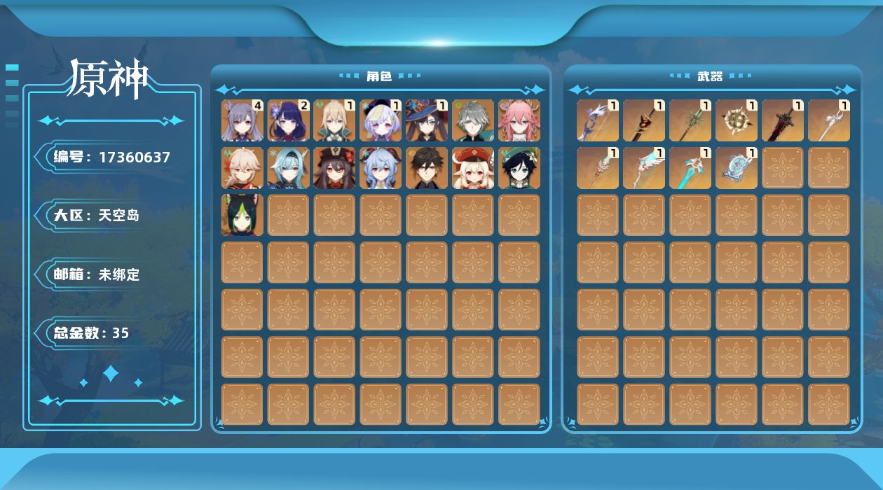 0命艾尔海森,0命提纳里,0命八重神子,0命优菈,2命雷电将军,0命枫原万叶,0命钟离,0命胡桃,0命甘雨,0命温迪,0命可莉,4命刻晴,1命七七,1命琴,1命莫娜,精1若水,精1赤角石溃杵,精1四风原典,精1和璞鸢,精1天空之脊,精1天空之翼,精1天空之刃,精1尘世之锁,精1风鹰剑,精1狼的末路