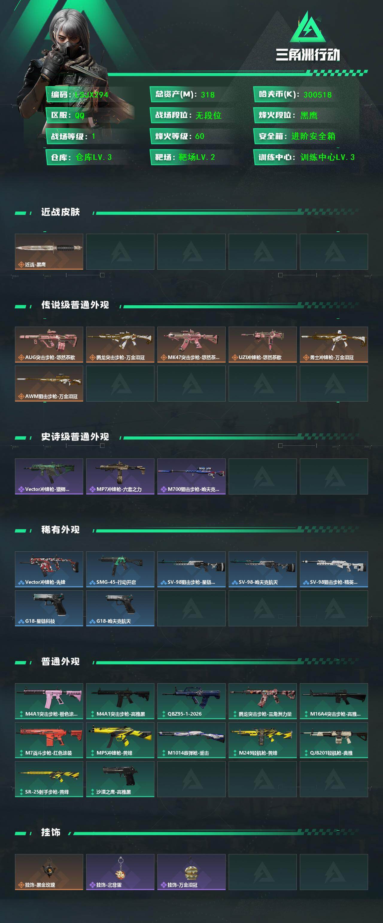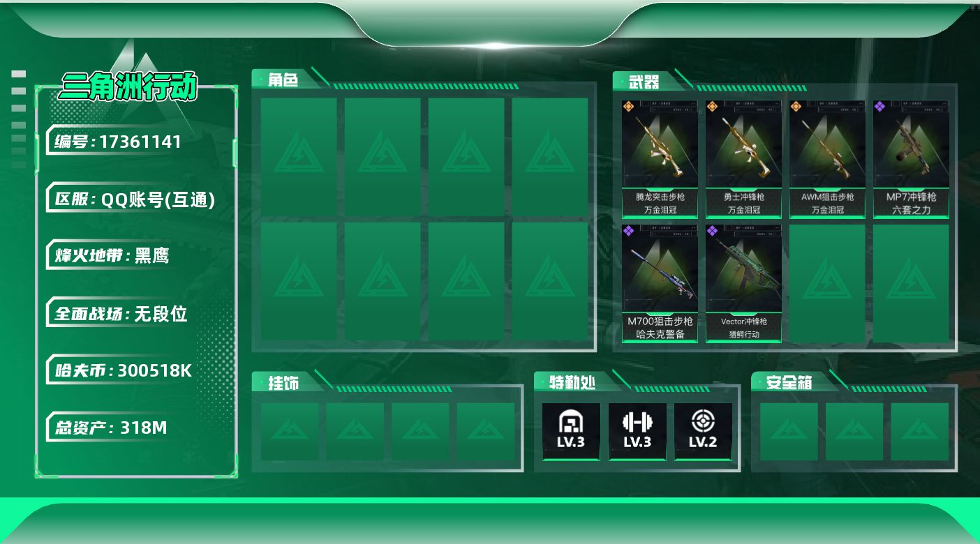 [17361141]【特价出售/店主推荐】318m总资产-300518k哈伏币-60烽火等级-黑鹰-1战场等级-无军衔 【近战皮肤】:近战-黑鹰 【传说外观】:AUG突击步枪-悠然茶歇,腾龙突击步枪-万金泪冠,MK47突击步枪-悠然茶歇,UZI冲锋枪-悠然茶歇,勇士冲锋枪-万金泪冠,AWM狙击步枪-万金泪冠 【史诗外观】:Vector冲锋枪-猎鳄行动,MP7冲锋枪-六套之力,M700狙击步枪-哈夫克警备 【稀有外观】:Vector冲锋枪-先锋,SMG-45冲锋枪-行动开启,SV-98狙击步枪-星链科技,SV-98狙击步枪-哈夫克航天,SV-98狙击步枪-精英联盟,G18-星链科技,G18-哈夫克航天 【普通外观】:M4A1突击步枪-粉色涂装,M4A1突击步枪-高雅黑,QBZ95-1突击步枪-2026,腾龙突击步枪-三角洲力量,M16A4突击步枪-高雅黑,M7战斗步枪-红色涂装,MP5冲锋枪-黄蜂,M1014霰弹枪-重击,M249轻机枪-黄蜂,QJB201轻机枪-典雅,SR-25射手步枪-黄蜂,沙漠之鹰-高雅黑 【挂饰】:挂饰-蚀金玫瑰,挂饰-北非蛋,挂饰-万金泪冠