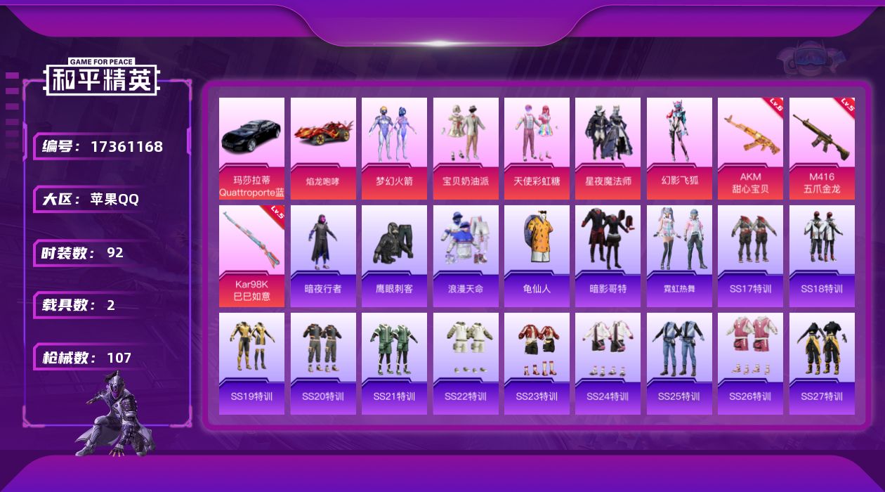 [17361168]【特价出售/店主推荐】苹果 手Q-5粉装-3特效枪-2载具-1粉色飞行器-40786热力值-18王牌印记-92套装-107枪皮
