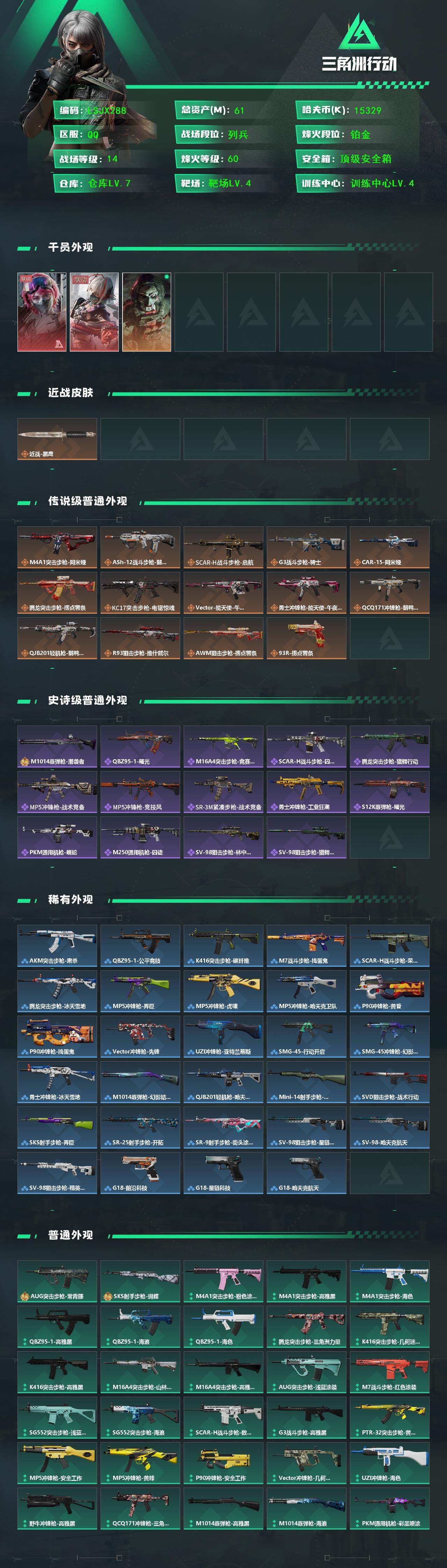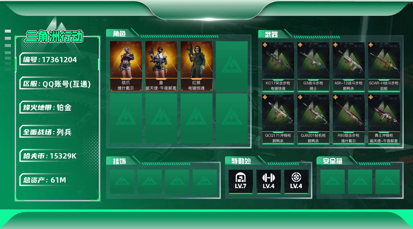 [17361204]可二次【特价出售/店主推荐】61m总资产-15329k哈伏币-60烽火等级-铂金-14战场等级-列兵 【干员外观】:蛊-能天使午夜邮差,骇爪-维什戴尔,红狼-电锯惊魂 【近战皮肤】:近战-黑鹰 【传说外观】:M4A1突击步枪-阿米娅,ASh-12战斗步枪-鹅鸭杀,SCAR-H战斗步枪-启航,G3战斗步枪-骑士,CAR-15突击步枪-阿米娅,腾龙突击步枪-捞点薯条,KC17突击步枪-电锯惊魂,Vector冲锋枪-能天使-午夜邮差,勇士冲锋枪-能天使-午夜邮差,QCQ171冲锋枪-鹅鸭杀,QJB201轻机枪-鹅鸭杀,R93狙击步枪-维什戴尔,AWM狙击步枪-捞点薯条,93R-捞点薯条 【史诗外观】:M1014霰弹枪-潜袭者,QBZ95-1突击步枪-曙光,M16A4突击步枪-竞赛选手,SCAR-H战斗步枪-囚徒,腾龙突击步枪-猎鳄行动,MP5冲锋枪-战术竞备,MP5冲锋枪-竞技风,SR-3M紧凑突击步枪-战术竞备,勇士冲锋枪-工业狂潮,S12K霰弹枪-曙光,PKM通用机枪-蝮蛇,M250通用机枪-囚徒,SV-98狙击步枪-林中猎手,SV-98狙击步枪-猎鳄行动 【稀有外观】:AKM突击步枪-肃杀,QBZ95-1突击步枪-公平竞技,K416突击步枪-碳纤维,M7战斗步枪-捣蛋鬼,SCAR-H战斗步枪-荣耀列队,腾龙突击步枪-冰天雪地,MP5冲锋枪-弄臣,MP5冲锋枪-虎啸,MP5冲锋枪-哈夫克卫队,P90冲锋枪-黄昏,P90冲锋枪-捣蛋鬼,Vector冲锋枪-先锋,UZI冲锋枪-亚特兰蒂斯,SMG-45冲锋枪-行动开启,SMG-45冲锋枪-幻影结构,勇士冲锋枪-冰天雪地,M1014霰弹枪-幻影结构,QJB201轻机枪-哈夫克卫队,Mini-14射手步枪-荣耀列队,SVD狙击步枪-战术行动,SKS射手步枪-弄臣,SR-25射手步枪-开拓,SR-9射手步枪-街头涂鸦,SV-98狙击步枪-星链科技,SV-98狙击步枪-哈夫克航天,SV-98狙击步枪-精英联盟,G18-前沿科技,G18-星链科技,G18-哈夫克航天 【普通外观】:AUG突击步枪-常青藤,SKS射手步枪-蝴蝶,M4A1突击步枪-粉色涂装,M4A1突击步枪-高雅黑,M4A1突击步枪-海色,QBZ95-1突击步枪-高雅黑,QBZ95-1突击步枪-海浪,QBZ95-1突击步枪-海色,腾龙突击步枪-三角洲力量,K416突击