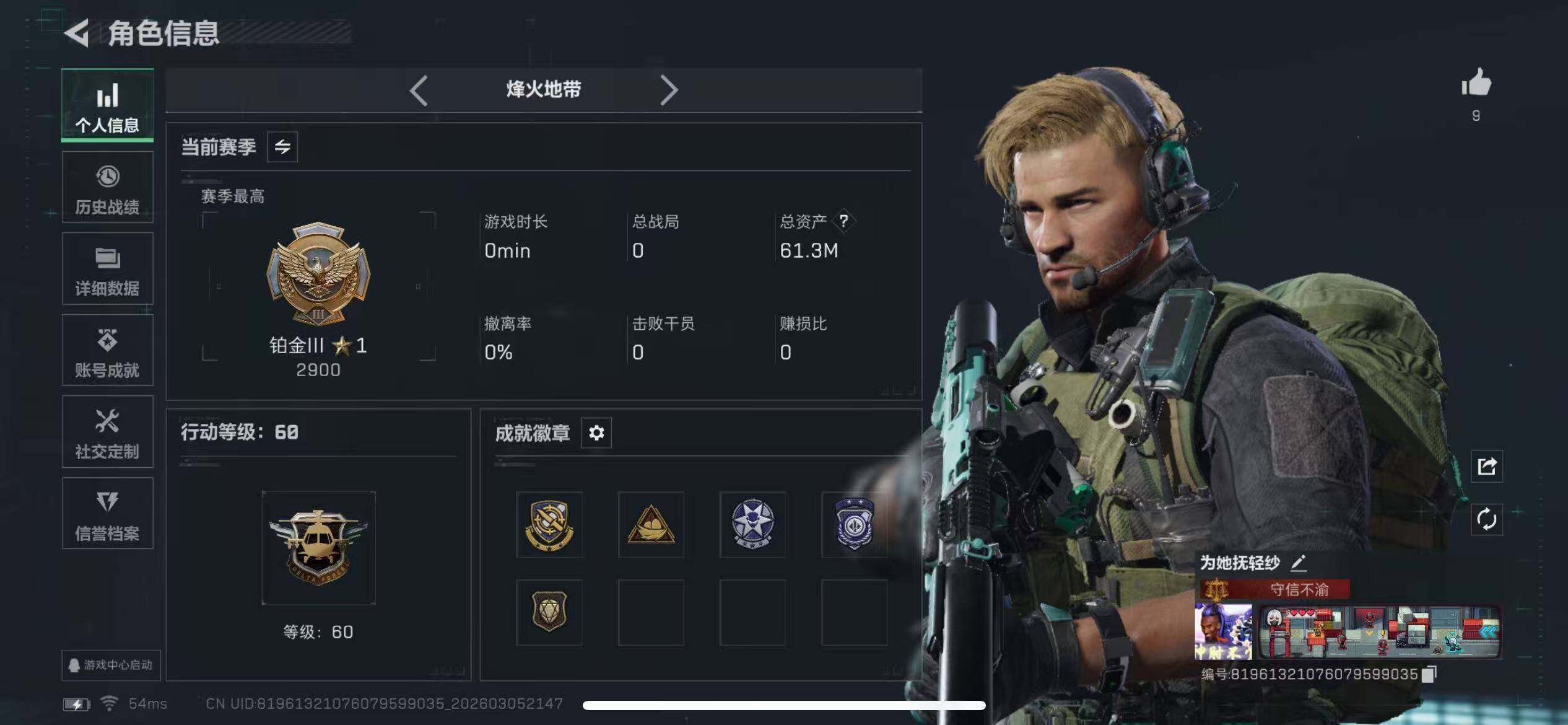 [17361204]可二次【特价出售/店主推荐】61m总资产-15329k哈伏币-60烽火等级-铂金-14战场等级-列兵