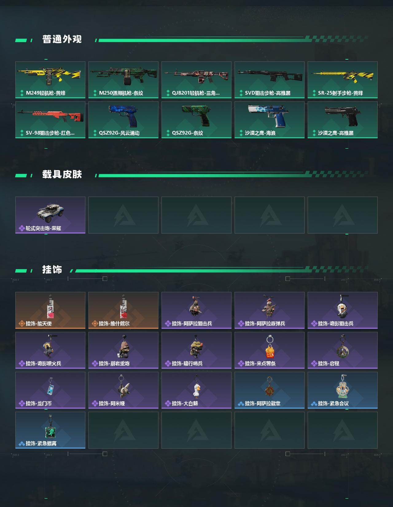 【稀有外观】:AKM突击步枪-肃杀,QBZ95-1突击步枪-公平竞技,K416突击步枪-碳纤维,M7战斗步枪-捣蛋鬼,SCAR-H战斗步枪-荣耀列队,腾龙突击步枪-冰天雪地,MP5冲锋枪-弄臣,MP5冲锋枪-虎啸,MP5冲锋枪-哈夫克卫队,P90冲锋枪-黄昏,P90冲锋枪-捣蛋鬼,Vector冲锋枪-先锋,UZI冲锋枪-亚特兰蒂斯,SMG-45冲锋枪-行动开启,SMG-45冲锋枪-幻影结构,勇士冲锋枪-冰天雪地,M1014霰弹枪-幻影结构,QJB201轻机枪-哈夫克卫队,Mini-14射手步枪-荣耀列队,SVD狙击步枪-战术行动,SKS射手步枪-弄臣,SR-25射手步枪-开拓,SR-9射手步枪-街头涂鸦,SV-98狙击步枪-星链科技,SV-98狙击步枪-哈夫克航天,SV-98狙击步枪-精英联盟,G18-前沿科技,G18-星链科技,G18-哈夫克航天