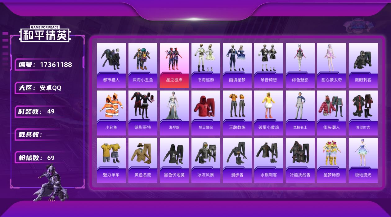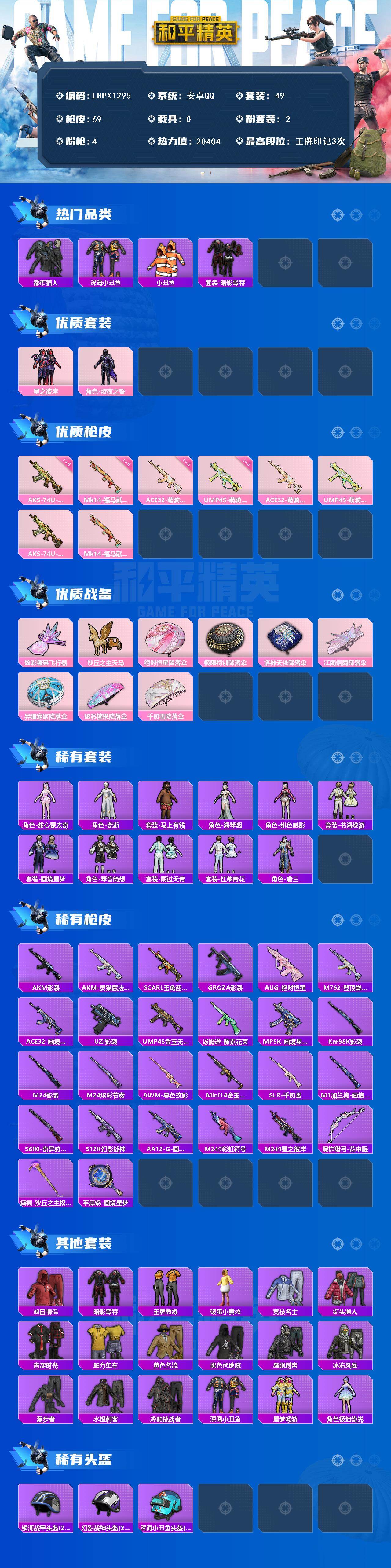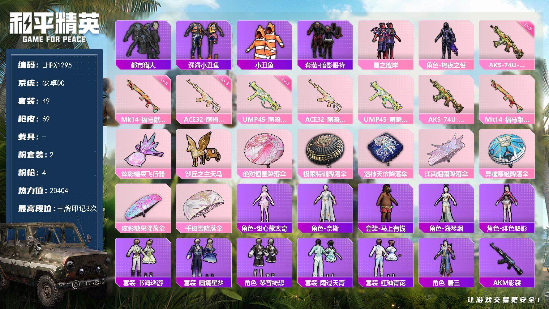 [17361188]安卓 手Q-2粉装-4特效枪-0载具-2粉色飞行器-20404热力值-3王牌印记-49套装-69枪皮 【热门品类】:套装-都市猎人,套装-深海小丑鱼,套装-小丑鱼,套装-暗影哥特 【粉色套装】:粉装-星之彼岸,角色-烬夜之誓 【粉色枪皮等级】:ACE32-萌骑漫游(三级),UMP45-萌骑冒险(三级),AKS-74U-森灵之息(五级),Mk14-福马献瑞(五级) 【粉色枪皮】:ACE32-萌骑漫游,UMP45-萌骑冒险,AKS-74U-森灵之息,Mk14-福马献瑞 【粉色飞行器】:炫彩糖果飞行器,沙丘之主天马 【粉色降落伞】:绝对恒星降落伞,极限特训降落伞,洛神天依降落伞,江南烟雨降落伞,异瞳寒姬降落伞,炫彩糖果降落伞,千仞雪降落伞 【稀有套装】:角色-甜心蒙太奇,套装-雪国风尚,套装-炫彩糖果,角色-奈斯,套装-马上有钱,角色-海琴烟,角色-绯色魅影,套装-书海巡游,套装-画境星梦,套装-琴音绮想,套装-雨过天青,套装-红釉青花,角色-唐三 【稀有枪皮】:AKM-影袭,AKM-灵猫魔法师,SCAR-L-玉兔迎春,GROZA-影袭,AUG-绝对恒星,M762-登顶巅峰,ACE32-画境星梦,UZI-影袭,UMP45-金玉无双,汤姆逊-像素花束,MP5K-画境星梦,Kar98K-影袭,M24-影袭,M24-炫彩节奏,AWM-暮色玫影,Mini14-金玉无双,SLR-千仞雪,M1加兰德-画境星梦,S686-奇异狩猎者,S12K-幻影战神,AA12-G-画境星梦,M249-彩虹符号,M249-星之彼岸,爆炸猎弓-花中眠,撬棍-沙丘之主权杖,平底锅-画境星梦 【其他套装】:套装-旭日情侣,套装-暗影哥特,套装-王牌教练,套装-破蛋小黄鸡,套装-竞技名士,套装-街头潮人,套装-青涩时光,套装-魅力单车,套装-黄色名流,套装-黑色伏地魔,套装-鹰眼刺客,套装-冰冻风暴,套装-漫步者,套装-水银刺客,套装-冷酷挑战者,套装-深海小丑鱼,套装-星梦畅游,角色-极地流光 【稀有头盔】:银河战甲头盔(2级),幻影战神头盔(2级),深海小丑鱼头盔(3级) 【稀有背包】:深海小丑鱼背包(3级) 【营地ID】:1028809952