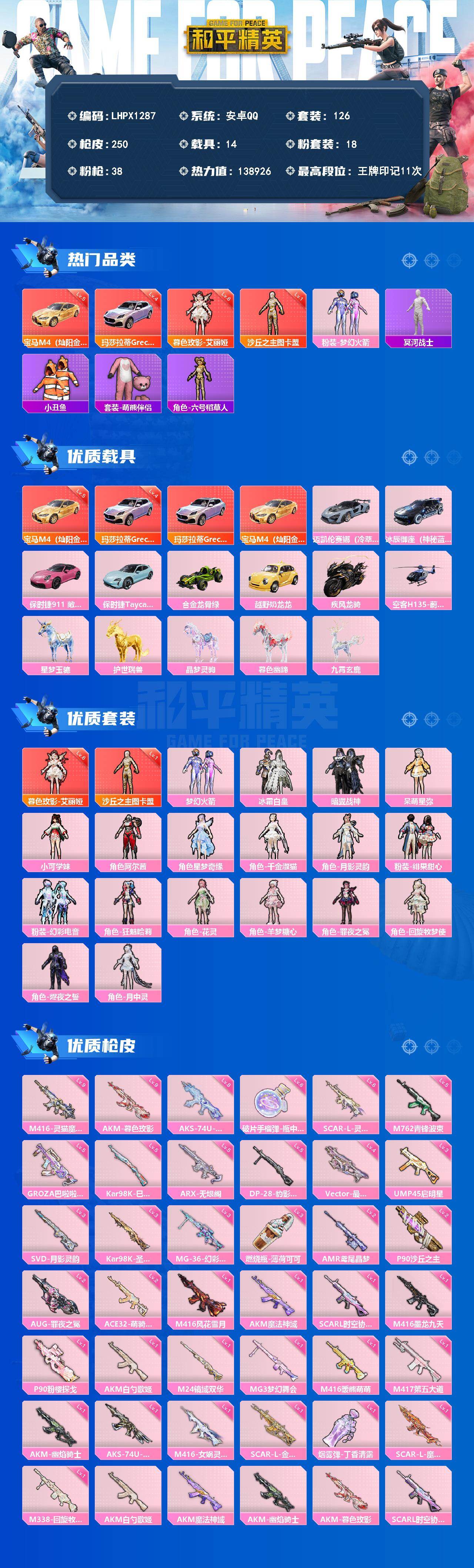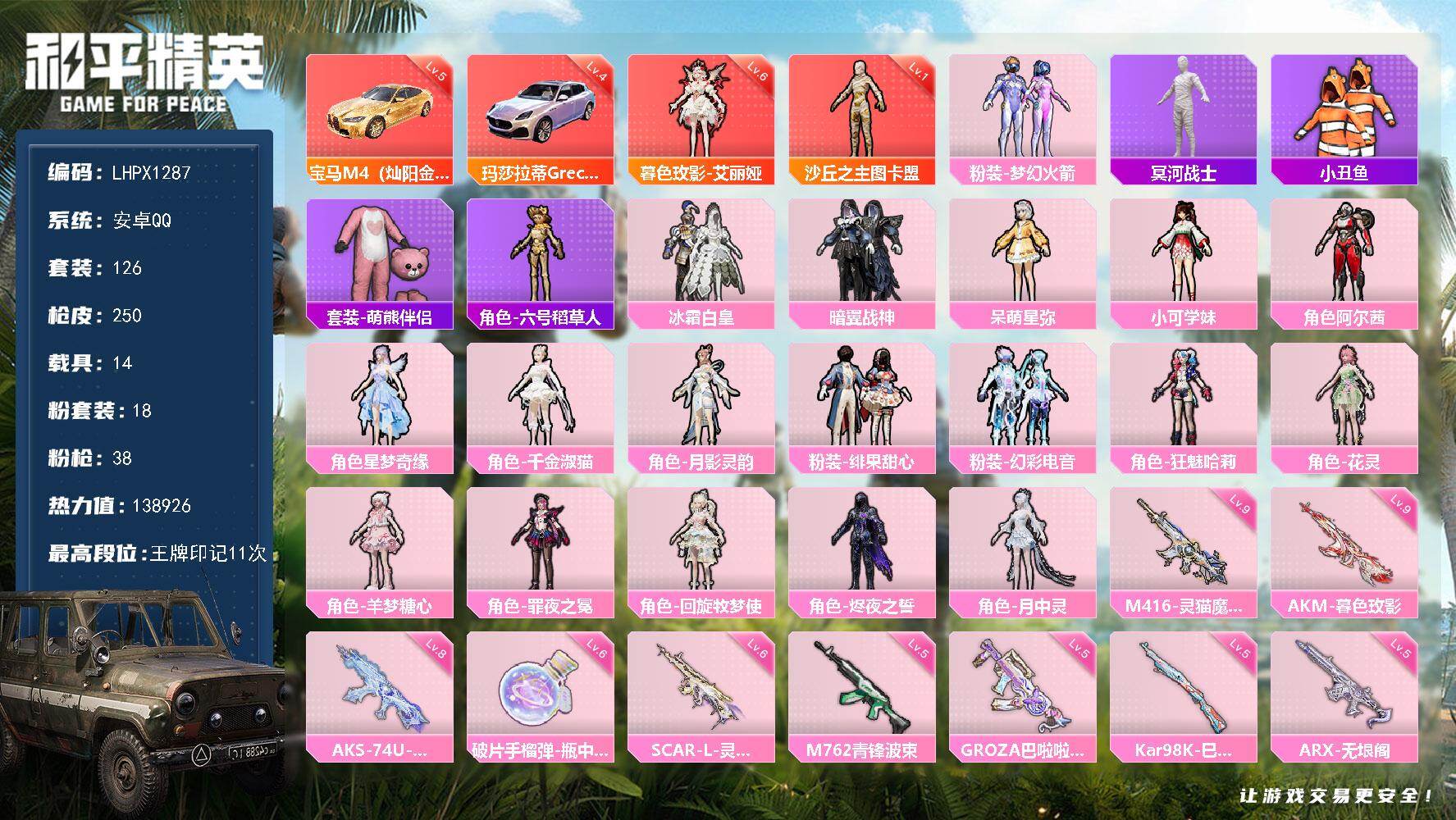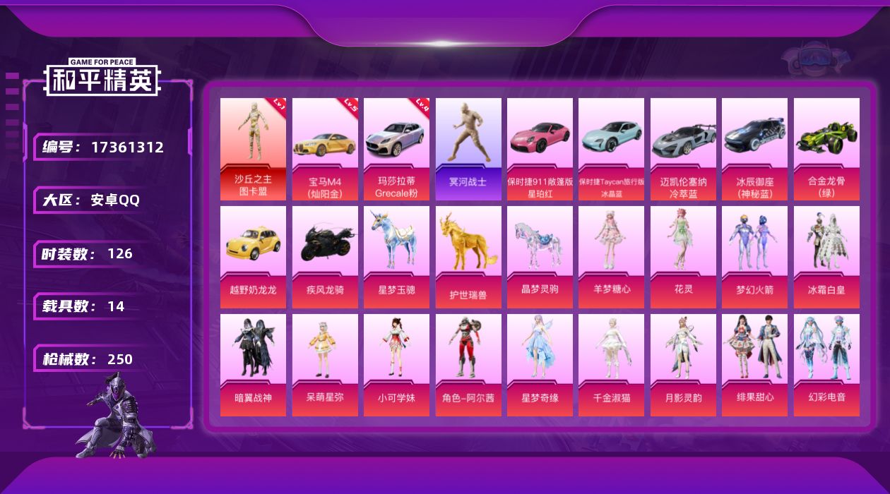 [17361312]【特价出售/店主推荐】安卓 手Q-2神装-18粉装-38特效枪-14载具-22粉色飞行器-138926热力值-11王牌印记-126套装-250枪皮 【红色载具】:玛莎拉蒂Grecale(幻星粉)(四级),宝马M4(灿阳金)(五级) 【红色神装等级】:暮色玫影-艾丽娅(六级),沙丘之主-图卡盟(一级) 【红色角色神装】:暮色玫影-艾丽娅,沙丘之主-图卡盟 【热门品类】:粉装-梦幻火箭,套装-冥河战士,套装-小丑鱼,套装-萌熊伴侣,角色-六号稻草人 【粉色套装】:粉装-梦幻火箭,粉装-冰霜白皇,粉装-暗翼战神,角色-呆萌星弥,角色-小可学妹,角色-阿尔茜,角色-星梦奇缘,角色-千金淑猫,角色-月影灵韵,粉装-绯果甜心,粉装-幻彩电音,角色-狂魅哈莉,角色-花灵,角色-羊梦糖心,角色-罪夜之冕,角色-回旋牧梦使,角色-烬夜之誓,角色-月中灵 【粉色枪皮等级】:AKM-白勺歌姬(一级),AKM-魔法神域(一级),AKM-幽焰骑士(一级),AKM-暮色玫影(九级),SCAR-L-时空协奏(一级),SCAR-L-金蛇镇世(一级),SCAR-L-魔童闹海 哪吒(一级),SCAR-L-灵驹仙姬(六级),M416-风花雪月(一级),M416-暖熊萌萌(一级),M416-墨龙九天(一级),M416-女娲灵识(一级),M416-灵猫魔法师(九级),GROZA-巴啦啦小魔仙(五级),AUG-罪夜之冕(二级),M762-青锋波束(五级),ACE32-萌骑漫游(二级),ARX-无垠阁(五级),UMP45-启明星(三级),Vector-最终圣卫者(四级),AKS-74U-信仰神谕(一级),AKS-74U-无垠阁(八级),P90-粉樱探戈(一级),P90-沙丘之主(二级),Kar98K-巳巳如意(五级),Kar98K-圣域龙灵(三级),M24-镜域双华(一级),AMR-鸢尾晶梦(二级),M417-第五大道(一级),SVD-月影灵韵(三级),DP-28-豹影疾电(五级),MG3-梦幻舞会(一级),MG-36-幻彩电音(三级),M338-回旋牧梦使(一级),烟雾弹-丁香清露(一级),燃烧瓶-薄荷可可(三级),破片手榴弹-瓶中星球(六级) 【粉色载具】:玛莎拉蒂Grecale(幻星粉),宝马M4(灿阳金),迈凯伦塞纳(冷萃蓝),冰辰御座(神秘蓝),保时捷911 敞篷版(星珀红),保时捷Taycan 旅