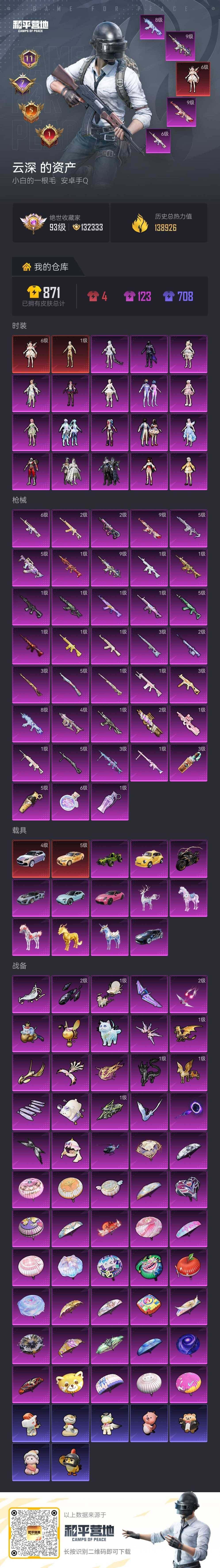 - [16331570]安卓 手Q-1神装-5粉装-9特效枪-0载具-2粉色飞行器-59264热力值-9王牌印记-151套装-198枪皮 【红色神装等级】:圣域龙灵-瑞拉(二级) 【红色角色神装】:圣域龙灵-瑞拉 【热门品类】:套装-龟仙人,套装-粉红小猪,角色-8号机,角色-Mark.06 【粉色套装】:角色-白勺歌姬,套装-创世·救赎,角色-初号机 觉醒Ver.,角色-萨利娅,角色-智耀战神 【粉色枪皮等级】:GROZA-镜光银凌(五级),AUG-暖羊咩咩(五级),AKS-74U-信仰神谕(四级),Kar98K-巳巳如意(五级),Kar98K-圣域龙灵(三级),AMR-智耀战神(四级),DP-28-圣堂之誓(七级),DP-28-千金淑猫(一级),DP-28-豹影疾电(一级) 【粉色枪皮】:GROZA-镜光银凌,AUG-暖羊咩咩,AKS-74U-信仰神谕,Kar98K-巳巳如意,Kar98K-圣域龙灵,AMR-智耀战神,DP-28-圣堂之誓,DP-28-千金淑猫,DP-28-豹影疾电 【粉色飞行器】:圣域金龙飞行器 【粉色降落伞】:洛神天依降落伞,垂柳戏鸭降落伞,第五大道降落伞,蜜语绒猫降落伞,辉耀战甲降落伞,精灵梦叶罗丽降落伞,守护天翼降落伞,千金淑猫降落伞,鬼刀降落伞,圣域龙灵降落伞,智耀战神降落伞,星穹咏叹调降落伞,炫彩糖果降落伞 【稀有套装】:套装-龟仙人,套装-巳巳如意,套装-雏菊兔兔,套装-萝兰蝴蝶,套装-小熊娃娃,角色-达芬奇,套装-糖糖葫芦,套装-青团波波,套装-棉花软糖,角色-都市丽猫,角色-摩登魅猫,套装-燕燕于飞,套装-鱼渊荷华,角色-海琴烟,套装-晶灵使者,套装-晶辉守护,套装-紫幽梦,套装-蓝冰羽,角色-猎影月神,角色-瑰梦爱神,套装-星影赞美诗,套装-朱霞炽焰,套装-凌霄紫焰,套装-擎苍青焰,套装-炫彩糖果 【稀有枪皮】:AKM-夜灯,AKM-破晓战魂,AKM-霓虹街区,AKM-龙的传人,M16A4-幻世战舞者,SCAR-L-玉兔迎春,M416-糯团青竹,M416-红色方程式,GROZA-懵萌河马,GROZA-田园牧歌,GROZA-晶梦幻蝶,AUG-耀粉歌者,QBZ-洛神天依,M762-天降萌叽,Mk47-妙红点点,G36C-懵萌河马,AC-VAL-天降萌叽,AC-VAL-快闪甜心,蜜獾-垂柳戏鸭,蜜獾-天降萌叽,蜜獾-娇憨猪猪,ARX-凌霄紫焰,UZI-啾