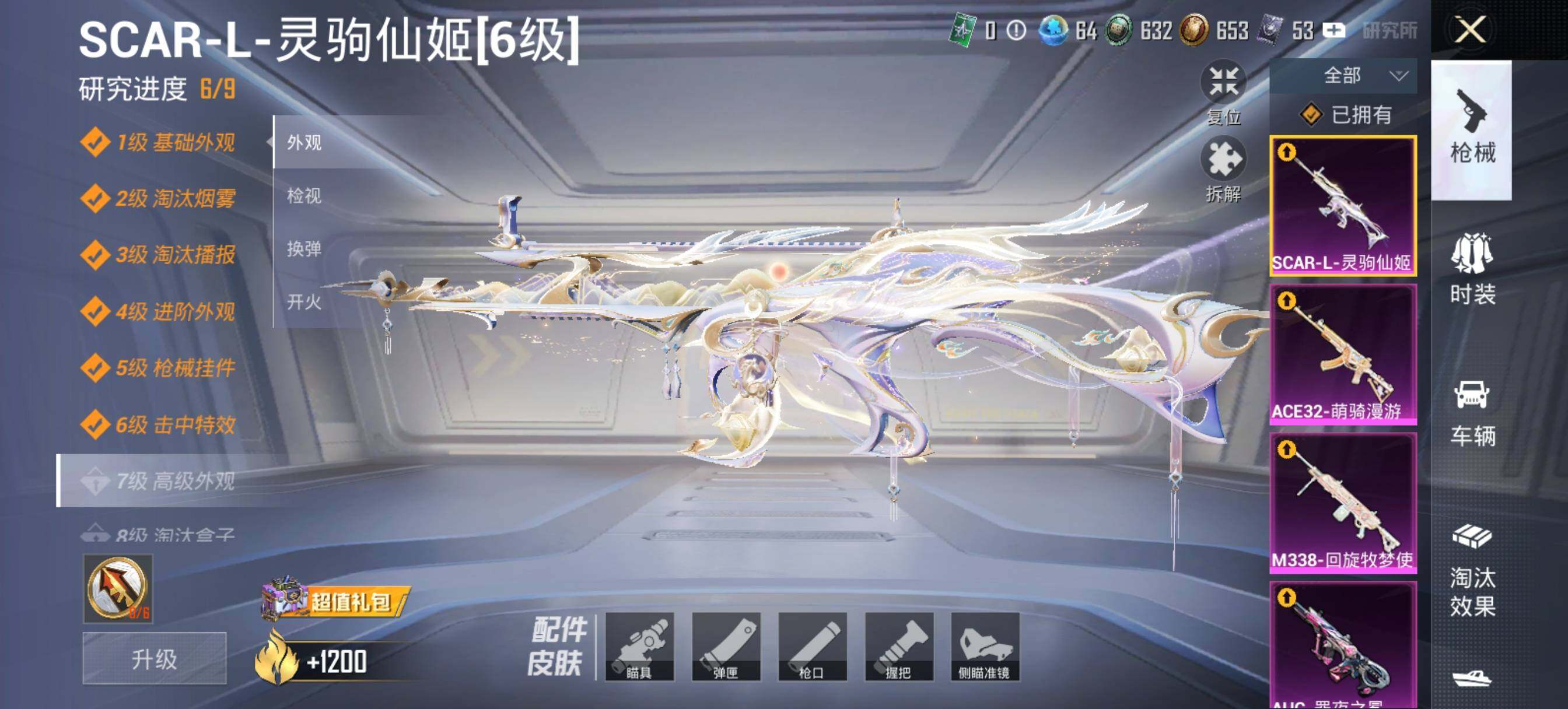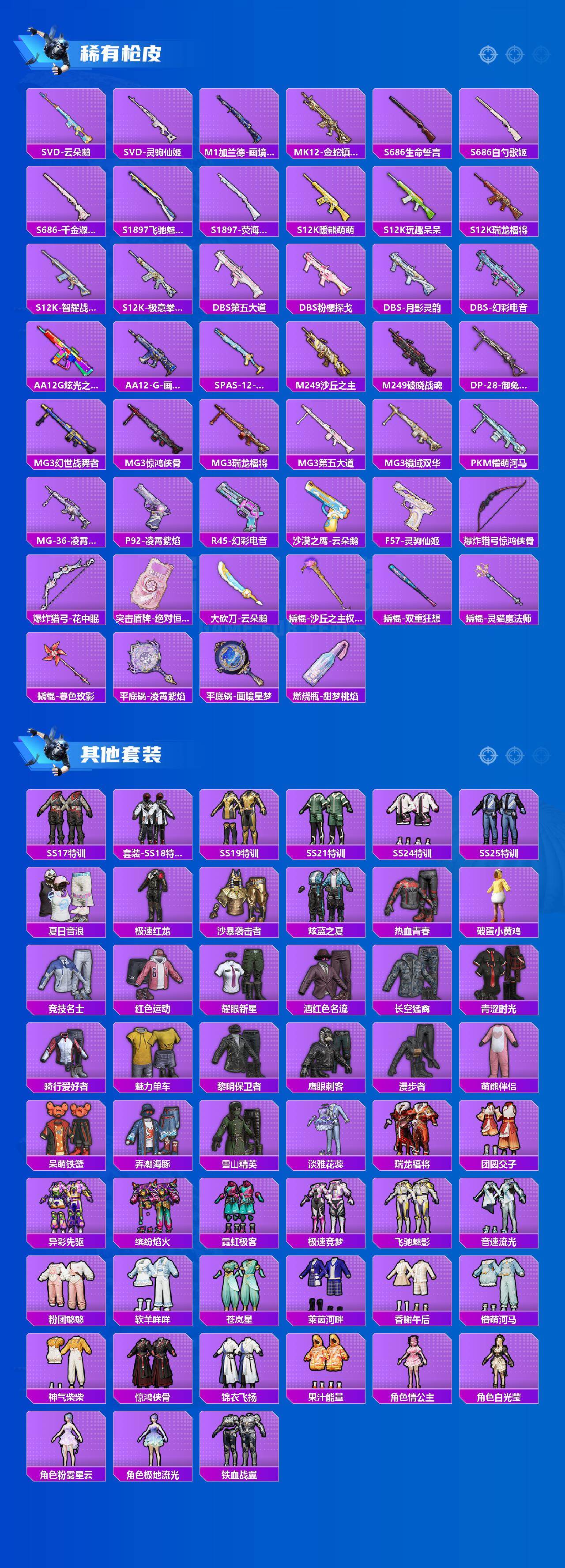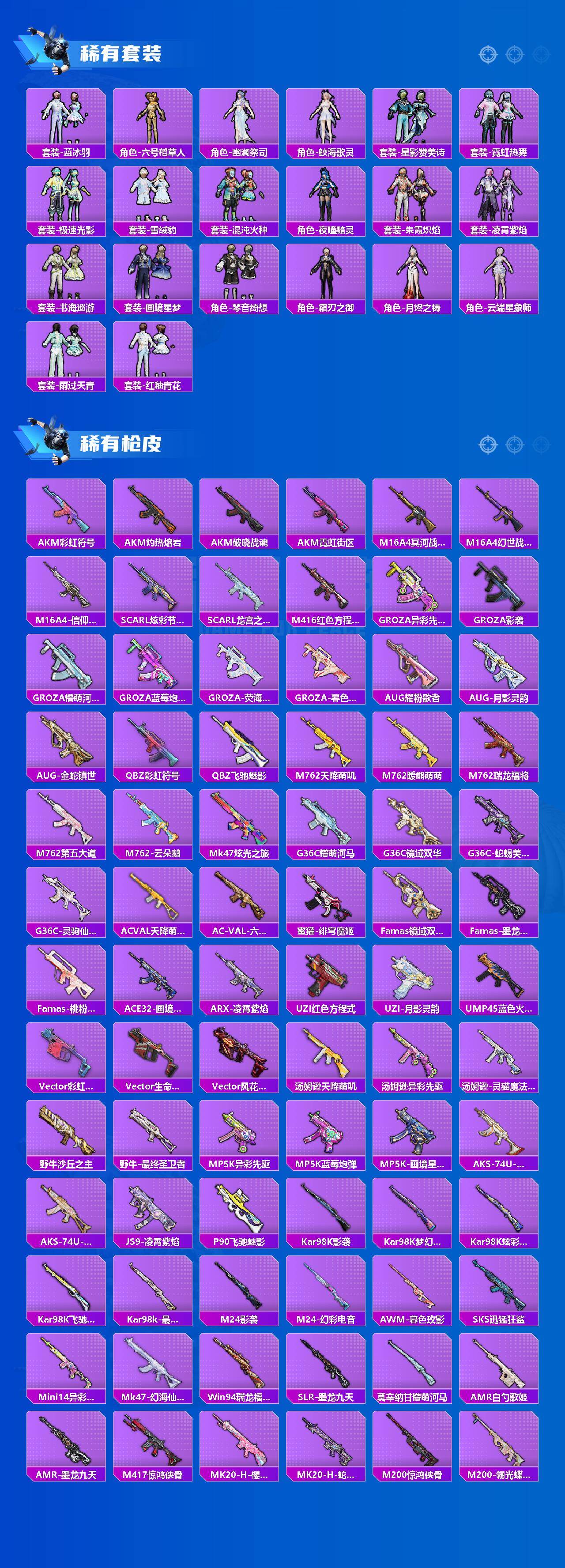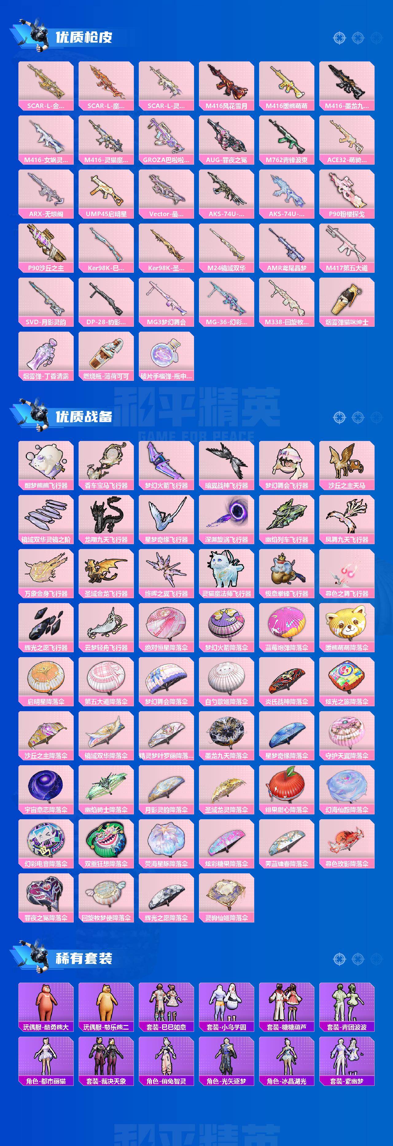 AKM-白勺歌姬,AKM-魔法神域,AKM-幽焰骑士,SCAR-L-时空协奏,SCAR-L-金蛇镇世,M416-风花雪月,M416-暖熊萌萌,M416-墨龙九天,M416-女娲灵识,GROZA-巴啦啦小魔仙,M762-青锋波束,UMP45-启明星,AKS-74U-信仰神谕,P90-粉樱探戈,P90-沙丘之主,Kar98K-巳巳如意,Kar98K-圣域龙灵,M24-镜域双华,AMR-鸢尾晶梦,M417-第五大道,SVD-月影灵韵,MG3-梦幻舞会,烟雾弹-猫咪绅士,烟雾弹-丁香清露