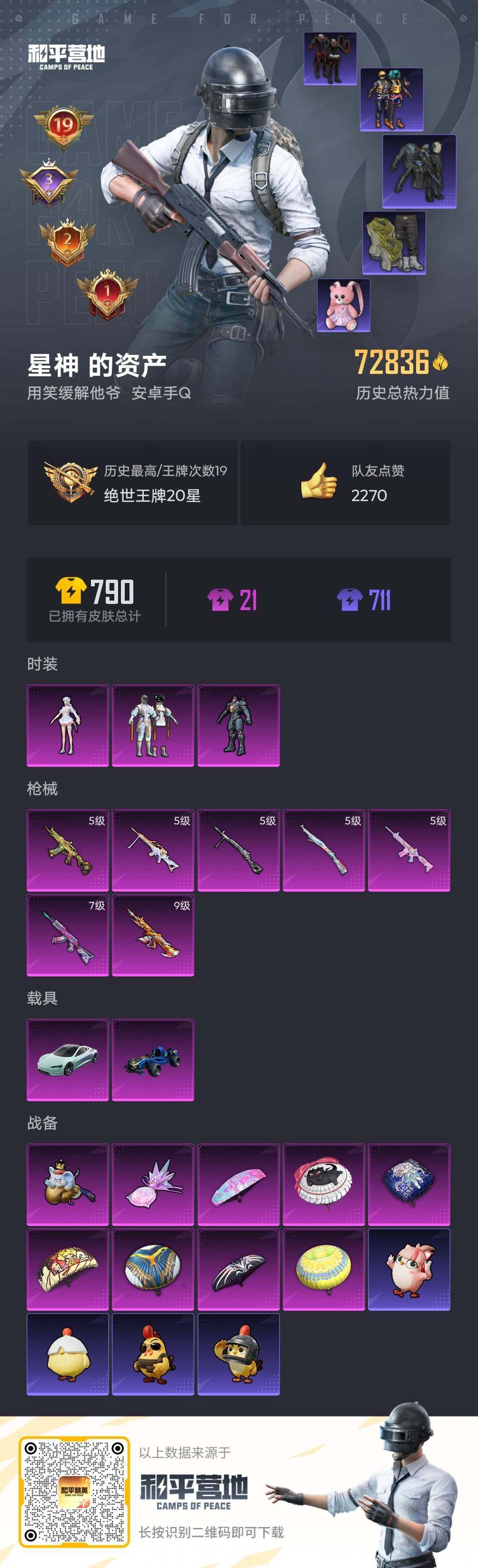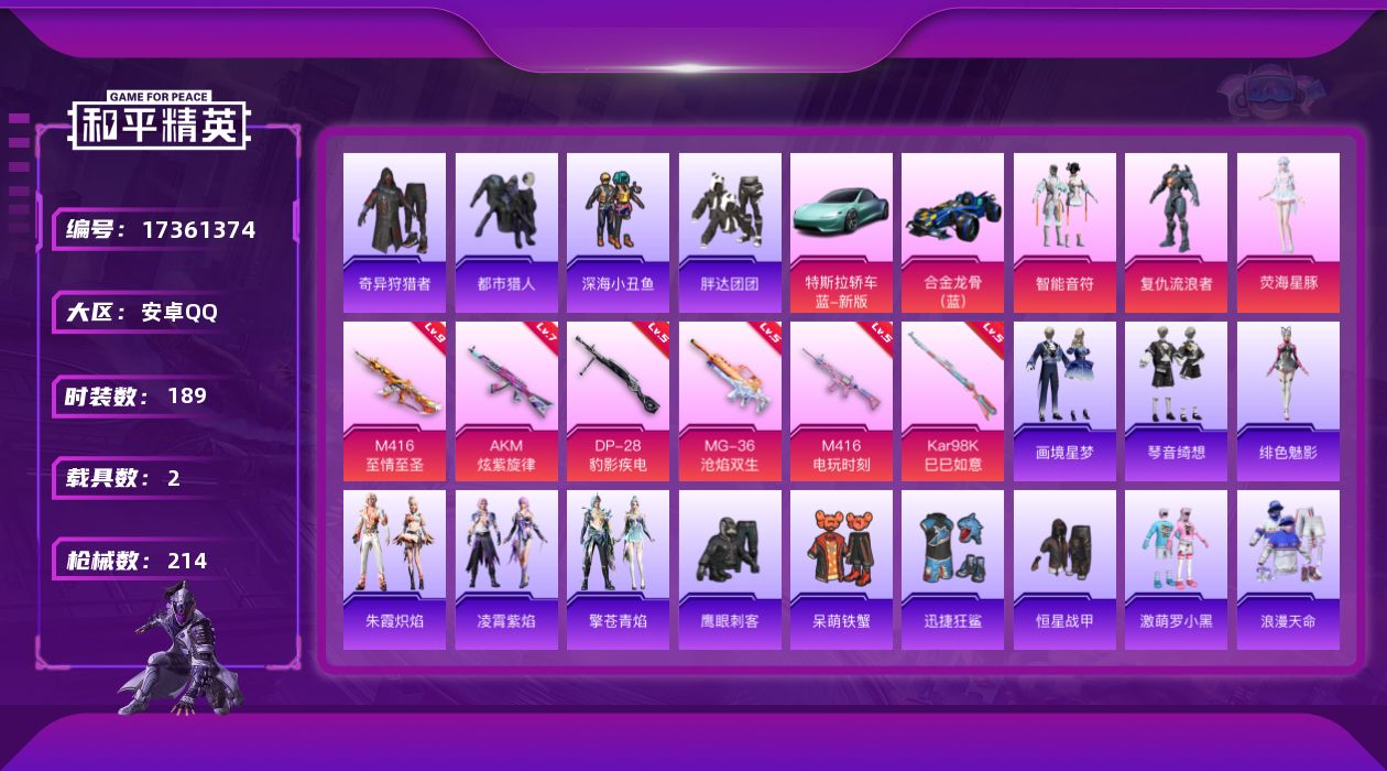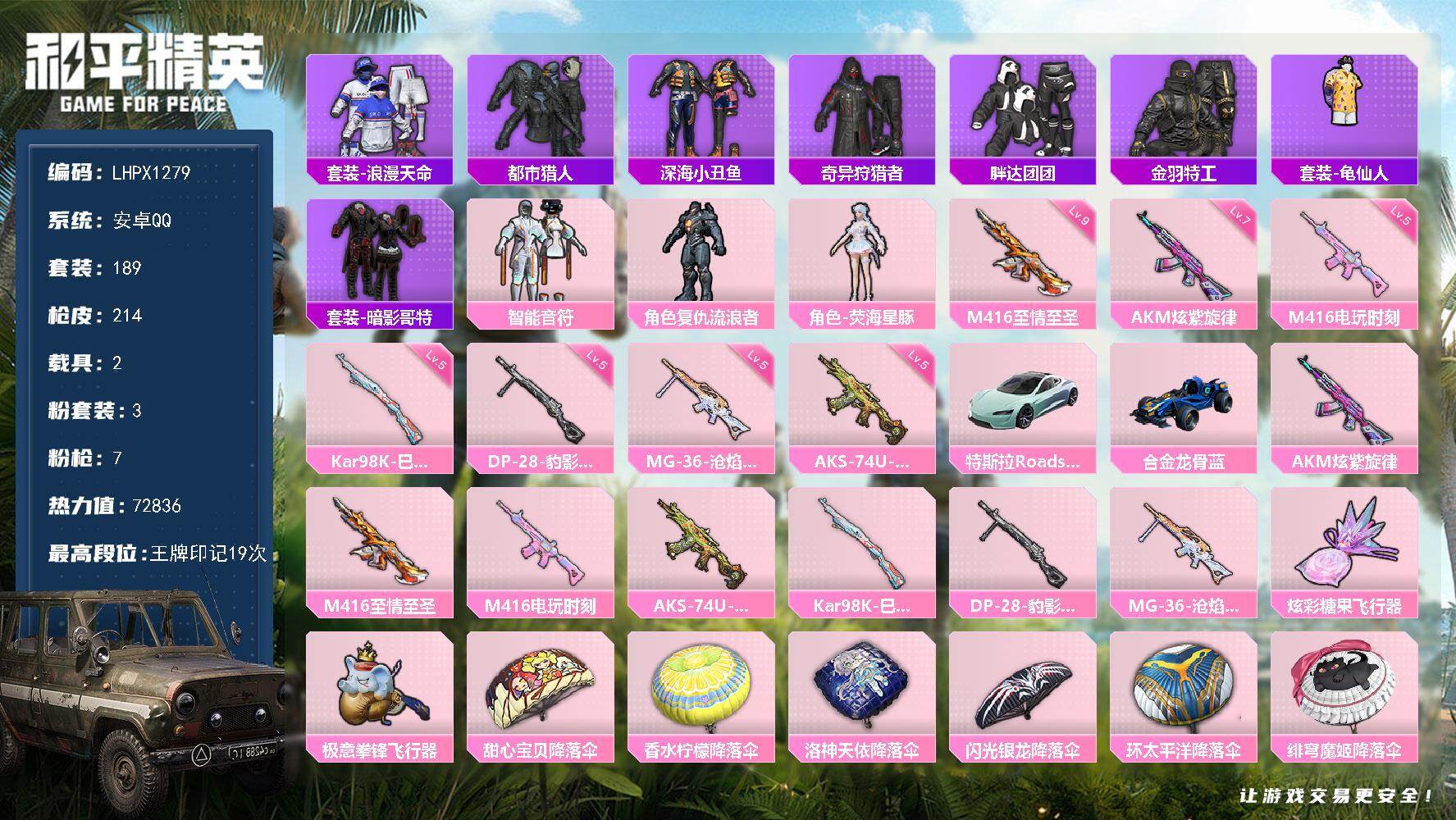 [17361374]【特价出售/店主推荐】安卓 手Q-3粉装-7特效枪-2载具-2粉色飞行器-72836热力值-19王牌印记-189套装-214枪皮【热门品类】:套装-浪漫天命,套装-都市猎人,套装-深海小丑鱼,套装-奇异狩猎者,套装-胖达团团,套装-金羽特工,套装-龟仙人,套装-暗影哥特【粉色套装】:粉装-智能音符,角色-复仇流浪者,角色-荧海星豚【粉色枪皮等级】:AKM-炫紫旋律(七级),M416-至情至圣(九级),M416-电玩时刻(五级),AKS-74U-森灵之息(五级),Kar98K-巳巳如意(五级),DP-28-豹影疾电(五级),MG-36-沧焰双生(五级)【粉色载具】:特斯拉Roadster(水滴蓝),合金龙骨(蓝)【粉色枪皮】:AKM-炫紫旋律,M416-至情至圣,M416-电玩时刻,AKS-74U-森灵之息,Kar98K-巳巳如意,DP-28-豹影疾电,MG-36-沧焰双生【粉色飞行器】:炫彩糖果飞行器,极意拳锋飞行器
