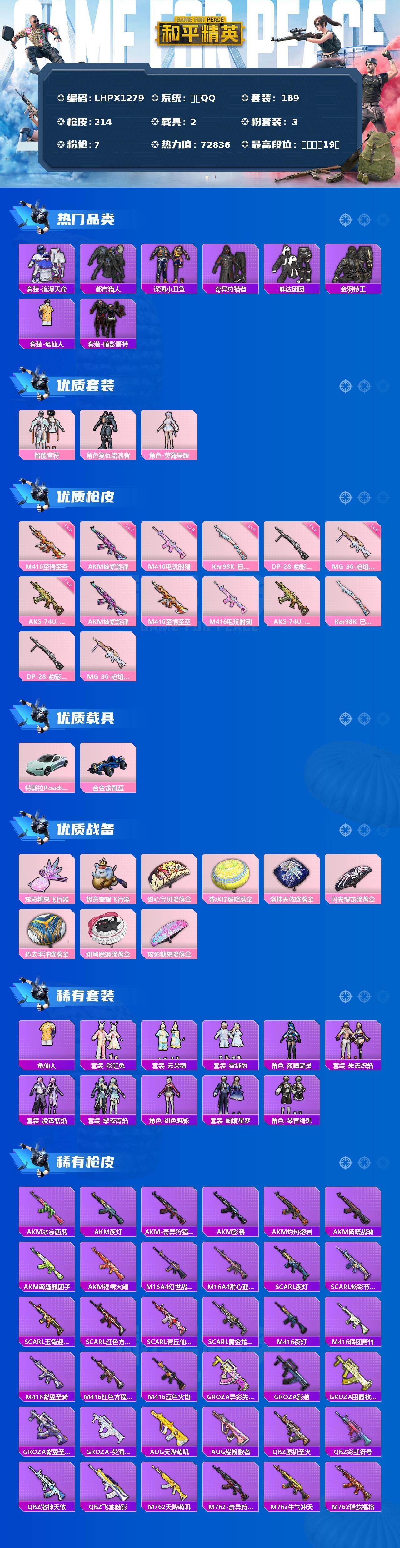 - [12681087]苹果 手Q-17粉装-13特效枪-5载具-1粉色飞行器-69634热力值-5王牌印记-135套装-183枪皮 【热门品类】:粉装-梦幻火箭,角色-军刀雅典娜,套装-AG战队服,套装-龟仙人,套装-粉红小猪 【粉色载具】:路特斯ELETRE(冰川蓝),玛莎拉蒂Quattroporte(夜幕蓝),乔治巴顿战车(鎏金黑),迈凯伦570S(天际蓝),合金龙骨(绿),僚机-萌兔起飞 【粉色套装】:粉装-数码大师,粉装-宝贝奶油派,粉装-天使彩虹糖,粉装-金曜白虎,粉装-梦幻火箭,粉装-天禅智恒,粉装-冰霜白皇,粉装-炙焰红王,粉装-炙焰赤龙,粉装-彩虹鹿灵,粉装-岚岚物语,粉装-橘柚倾心,粉装-赤焰黑爵,粉装-紫电风暴,粉装-傲雪凌霜,粉装-霁雪冰心,粉装-第五大道 【粉色枪皮等级】:AKM-炫紫旋律(一级),AKM-梦之光华(二级),SCAR-L-青春物语(一级),SCAR-L-纯梦嫁纱(四级),M416-五爪金龙(二级),M416-心之恋语(三级),M416-风花雪月(一级),GROZA-焦糖拿铁(二级),M762-激战未来(二级),M762-冷魅冰骑(二级),UZI-筑梦精灵(二级),AWM-橘柚倾心(二级),M417-第五大道(二级) 【粉色枪皮】:AKM-炫紫旋律,AKM-梦之光华,SCAR-L-青春物语,SCAR-L-纯梦嫁纱,M416-五爪金龙,M416-心之恋语,M416-风花雪月,GROZA-焦糖拿铁,M762-激战未来,M762-冷魅冰骑,UZI-筑梦精灵,AWM-橘柚倾心,M417-第五大道 【粉色飞行器】:冷魅冰骑飞行器 【粉色降落伞】:甜心宝贝降落伞,梦幻火箭降落伞,童趣迷兔降落伞,橘柚倾心降落伞,冷魅冰骑降落伞,环太平洋降落伞,绒雪飘舞降落伞,垂柳戏鸭降落伞,暗夜鎏金降落伞,音爆索尼克降落伞,雪梅暗香降落伞,炫光之旅降落伞 【稀有套装】:套装-龟仙人 【稀有枪皮】:AKM-夜灯,AKM-彩虹符号,AKM-星之信仰,AKM-灼热熔岩,AKM-破晓战魂,AKM-虎虎生威,AKM-霓虹街区,AKM-龙的传人,M16A4-夜灯,M16A4-幻世战舞者,M16A4-甜心亚梦,SCAR-L-玉兔迎春,SCAR-L-碧影闪光,SCAR-L-红色方程式,SCAR-L-银碳小老虎,M416-夜灯,M416-糯团青竹,M416-紫翼圣骑,M416-红色方程式,M41