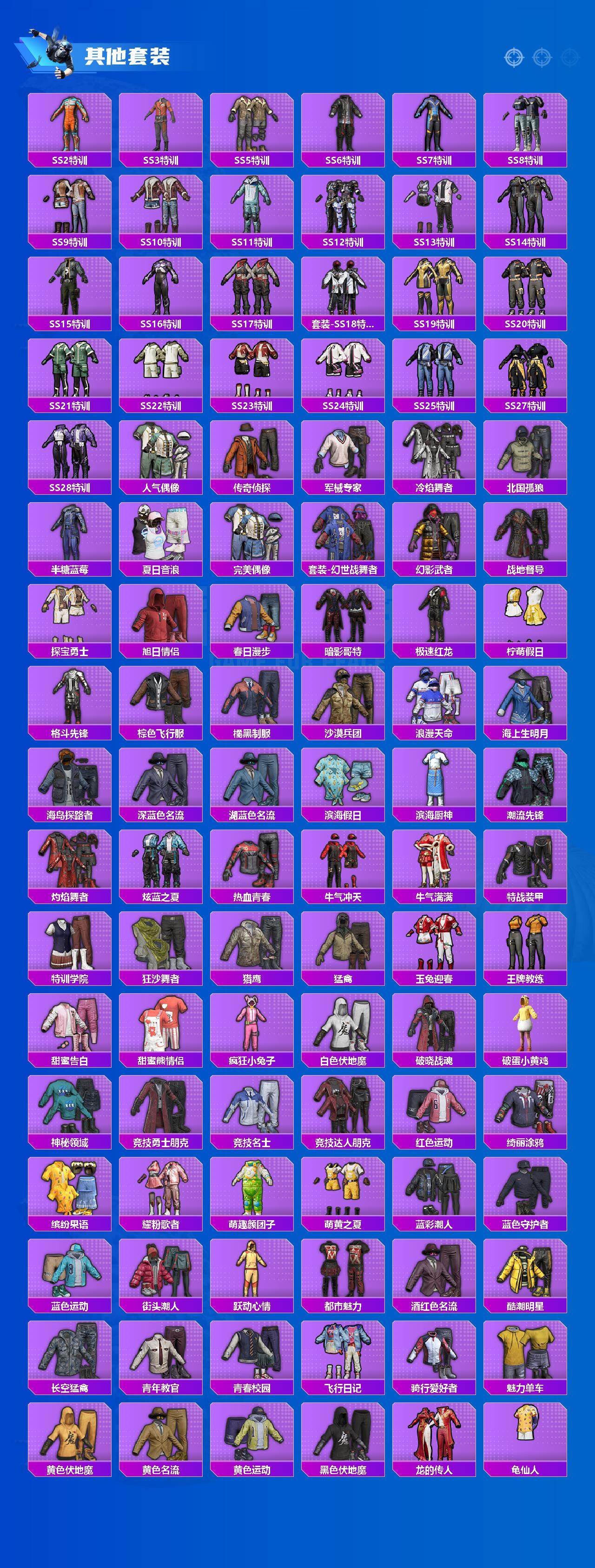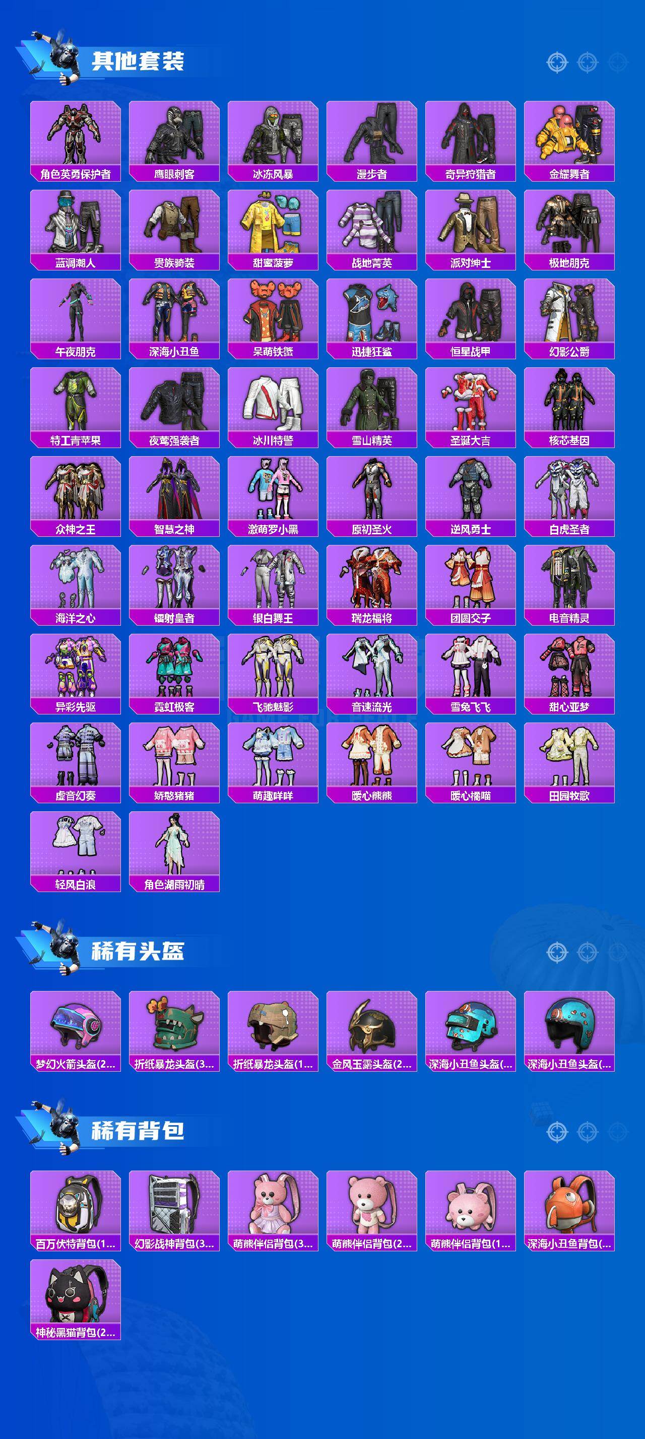 套装-都市猎人,套装-深海小丑鱼,套装-奇异狩猎者,套装-胖达团团,套装-智能音符,角色-复仇流浪者,套装-鹰眼刺客,套装-呆萌铁蟹,套装-迅捷狂鲨