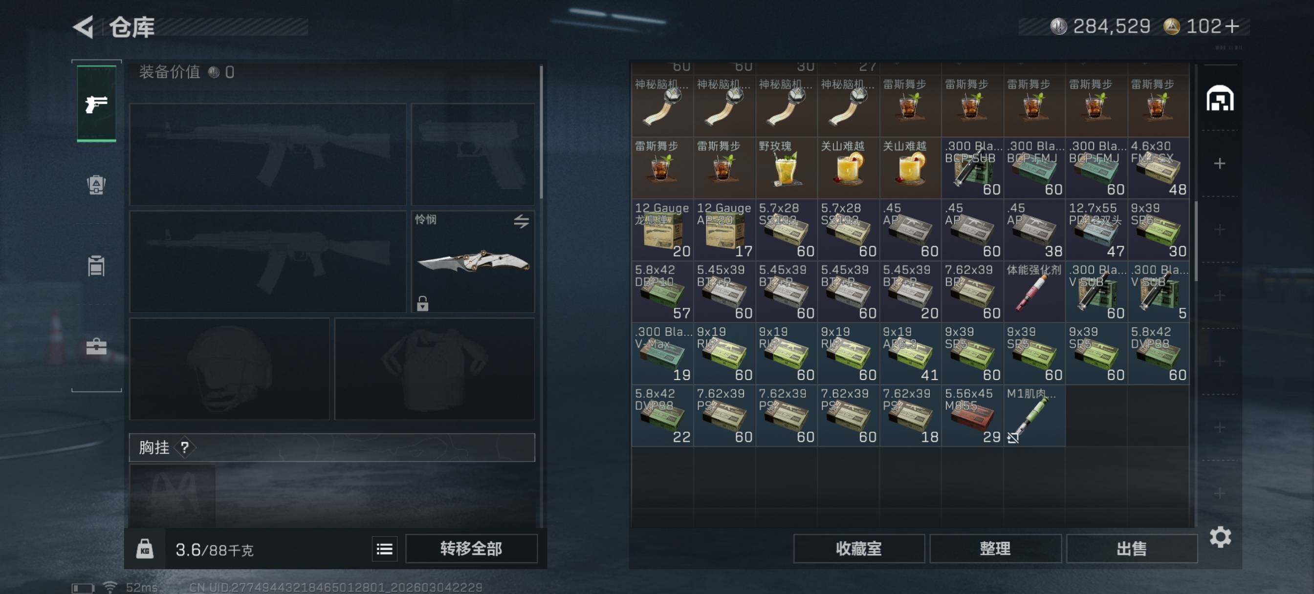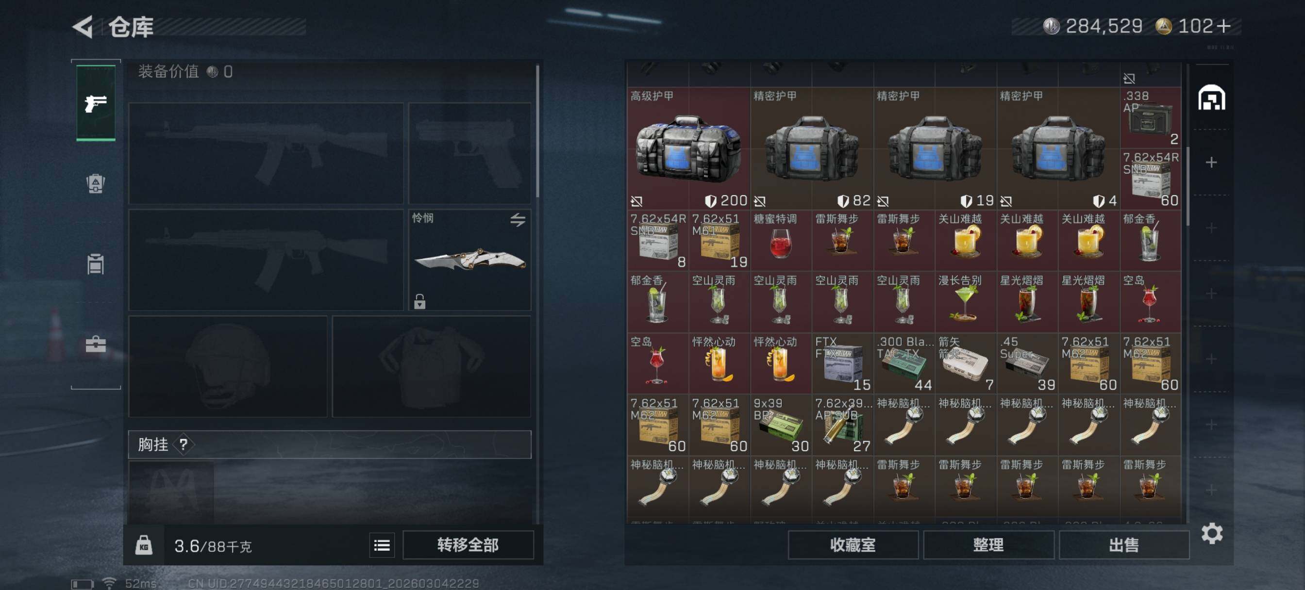 - [13003849]汤79825 总资产107M,哈夫币142w,枪皮数量68,战场等级:1 无军衔,行动等级:60 钻石,近战-黑鹰,安全箱等时效性道具请以游戏内数据为准;详情请看图【个人信息】战场等级:1 无军衔,行动等级:60 钻石【哈夫币】142w【总资产】107M【烽火地带专区】总资产100M-150M【货币】0三角币/0曼德尔币/320三角券【安全箱】基础安全箱2(1x2)/进阶安全箱4(2x2)【通行证】通行证免费版【特勤处】制药台Lv.3/工作台Lv.3/仓库Lv.9/防具台Lv.3/训练中心Lv.6/靶场Lv.6/技术中心Lv.3/指挥中心Lv.6/潜水中心Lv.1/收藏室Lv.0【近战皮肤】近战-黑鹰/【步枪皮肤】AUG突击步枪-蝮蛇/SG552突击步枪-深海恐惧/AKM突击步枪-林中猎手/PTR-32突击步枪-英雄/M16A4突击步枪-竞赛选手/M4A1突击步枪-阿米娅/【冲锋枪皮肤】MP5冲锋枪-深海恐惧/勇士冲锋枪-能天使-午夜邮差/【霰弹枪皮肤】M1014霰弹枪-林中猎手/【轻机枪皮肤】PKM通用机枪-蝮蛇/【狙击步枪皮肤】M700狙击步枪-竞技风/SVD狙击步枪-暗夜猎手/SV-98狙击步枪-林中猎手/【挂饰】演出导演/重装记者/挂饰-彩蛋/乐队纪念/阿萨拉盾兵/阿萨拉霰弹兵/阿萨拉狙击兵/挂饰-阿米娅/阿萨拉徽章/(典藏皮肤颜色请以典藏展示为准,安全箱等时效性道具请以游戏内数据为准)