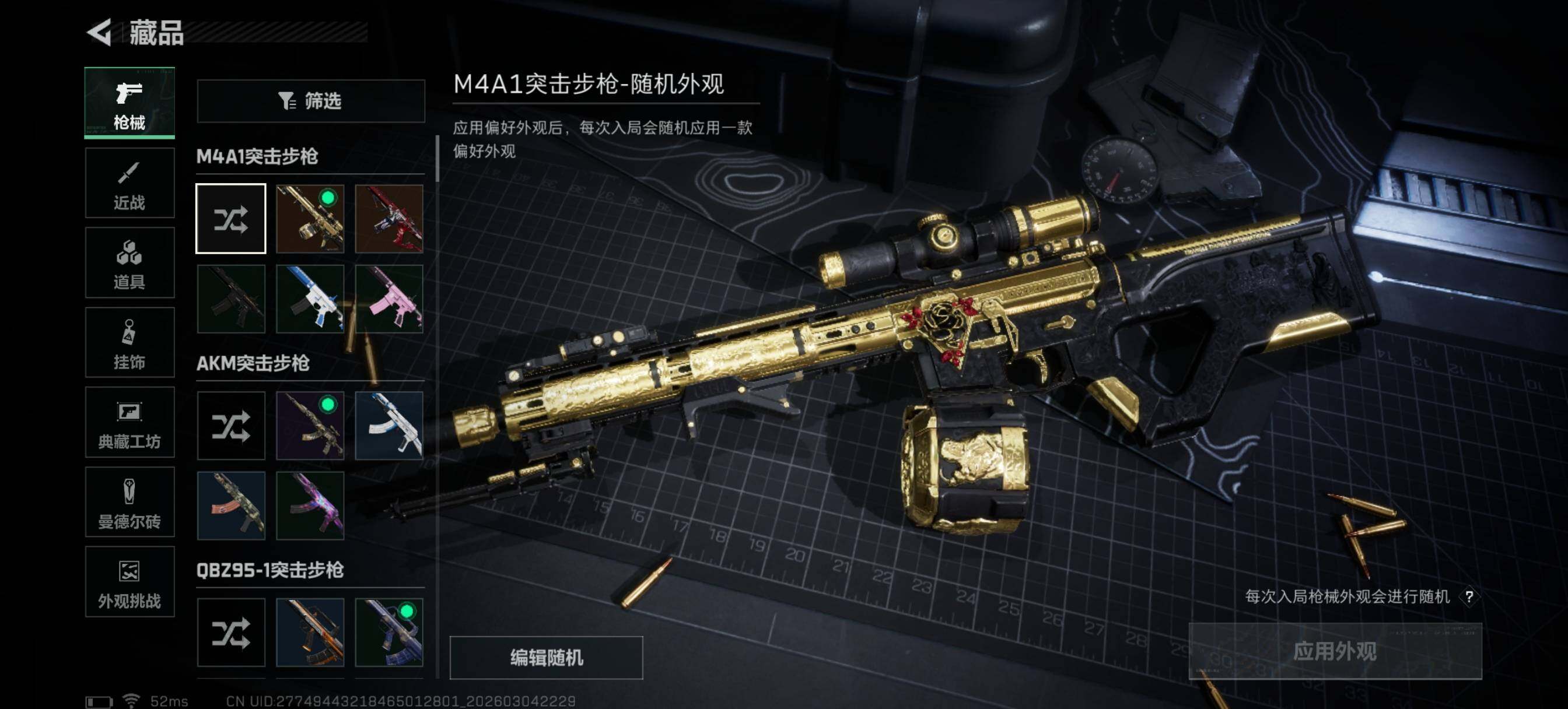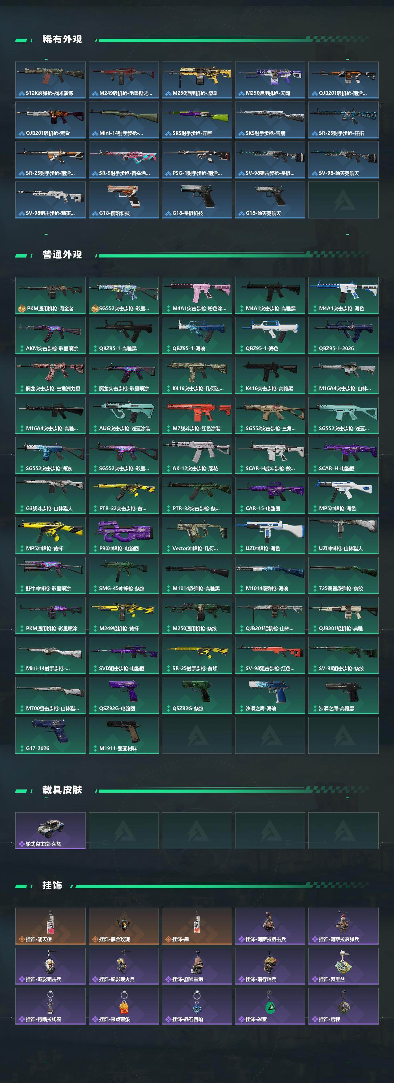 【稀有外观】:AKM突击步枪-战术演练,AKM突击步枪-肃杀,QBZ95-1突击步枪-公平竞技,K416突击步枪-虎啸,AUG突击步枪-前沿科技,M7战斗步枪-捣蛋鬼,SG552突击步枪-2026,SG552突击步枪-贴花艺术,SCAR-H战斗步枪-荣耀列队,SCAR-H战斗步枪-黄昏,G3战斗步枪-前沿科技,G3战斗步枪-战术演练,G3战斗步枪-主宰,PTR-32突击步枪-天网,PTR-32突击步枪-英雄,腾龙突击步枪-雪崩,腾龙突击