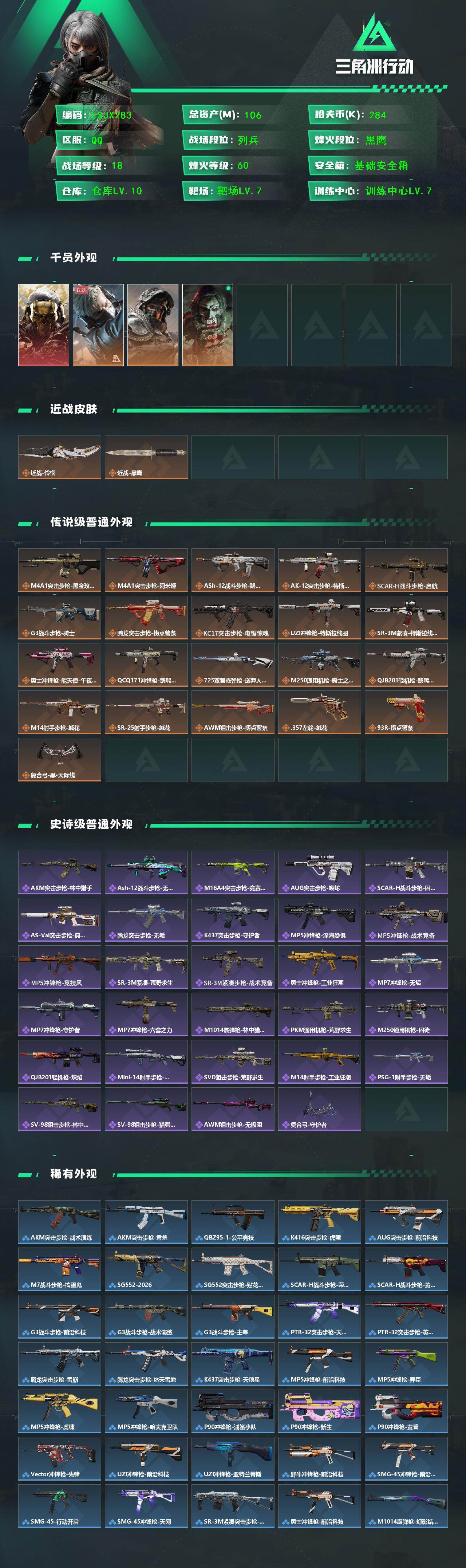 [17361683]【特价出售/店主推荐】106m总资产-284k哈伏币-60烽火等级-黑鹰-18战场等级-列兵 【干员外观】:红狼-蚀金玫瑰,蜂医-送葬人·无题密令,深蓝-不破誓约,红狼-电锯惊魂 【近战皮肤】:近战-怜悯,近战-黑鹰 【传说外观】:M4A1突击步枪-蚀金玫瑰,M4A1突击步枪-阿米娅,ASh-12战斗步枪-鹅鸭杀,AK-12突击步枪-特斯拉线圈,SCAR-H战斗步枪-启航,G3战斗步枪-骑士,腾龙突击步枪-捞点薯条,KC17突击步枪-电锯惊魂,UZI冲锋枪-特斯拉线圈,SR-3M紧凑突击步枪-特斯拉线圈,勇士冲锋枪-能天使-午夜邮差,QCQ171冲锋枪-鹅鸭杀,725双管霰弹枪-送葬人-无题密令,M250通用机枪-骑士之心,QJB201轻机枪-鹅鸭杀,M14射手步枪-缄花,SR-25射手步枪-缄花,AWM狙击步枪-捞点薯条,.357左轮-缄花,93R-捞点薯条,复合弓-黑·天际线 【史诗外观】:AKM突击步枪-林中猎手,ASh-12战斗步枪-无极限,M16A4突击步枪-竞赛选手,AUG突击步枪-蝮蛇,SCAR-H战斗步枪-囚徒,AS Val突击步枪-典狱官,腾龙突击步枪-无垢,K437突击步枪-守护者,MP5冲锋枪-深海恐惧,MP5冲锋枪-战术竞备,MP5冲锋枪-竞技风,SR-3M紧凑突击步枪-荒野求生,SR-3M紧凑突击步枪-战术竞备,勇士冲锋枪-工业狂潮,MP7冲锋枪-无垢,MP7冲锋枪-守护者,MP7冲锋枪-六套之力,M1014霰弹枪-林中猎手,PKM通用机枪-荒野求生,M250通用机枪-囚徒,QJB201轻机枪-炽焰,Mini-14射手步枪-守护者,SVD狙击步枪-荒野求生,M14射手步枪-工业狂潮,PSG-1射手步枪-无垢,SV-98狙击步枪-林中猎手,SV-98狙击步枪-猎鳄行动,AWM狙击步枪-无极限,复合弓-守护者 【稀有外观】:AKM突击步枪-战术演练,AKM突击步枪-肃杀,QBZ95-1突击步枪-公平竞技,K416突击步枪-虎啸,AUG突击步枪-前沿科技,M7战斗步枪-捣蛋鬼,SG552突击步枪-2026,SG552突击步枪-贴花艺术,SCAR-H战斗步枪-荣耀列队,SCAR-H战斗步枪-黄昏,G3战斗步枪-前沿科技,G3战斗步枪-战术演练,G3战斗步枪-主宰,PTR-32突击步枪-天网,PTR-32突击步枪-英雄,腾龙突击步枪-雪崩,腾龙突击
