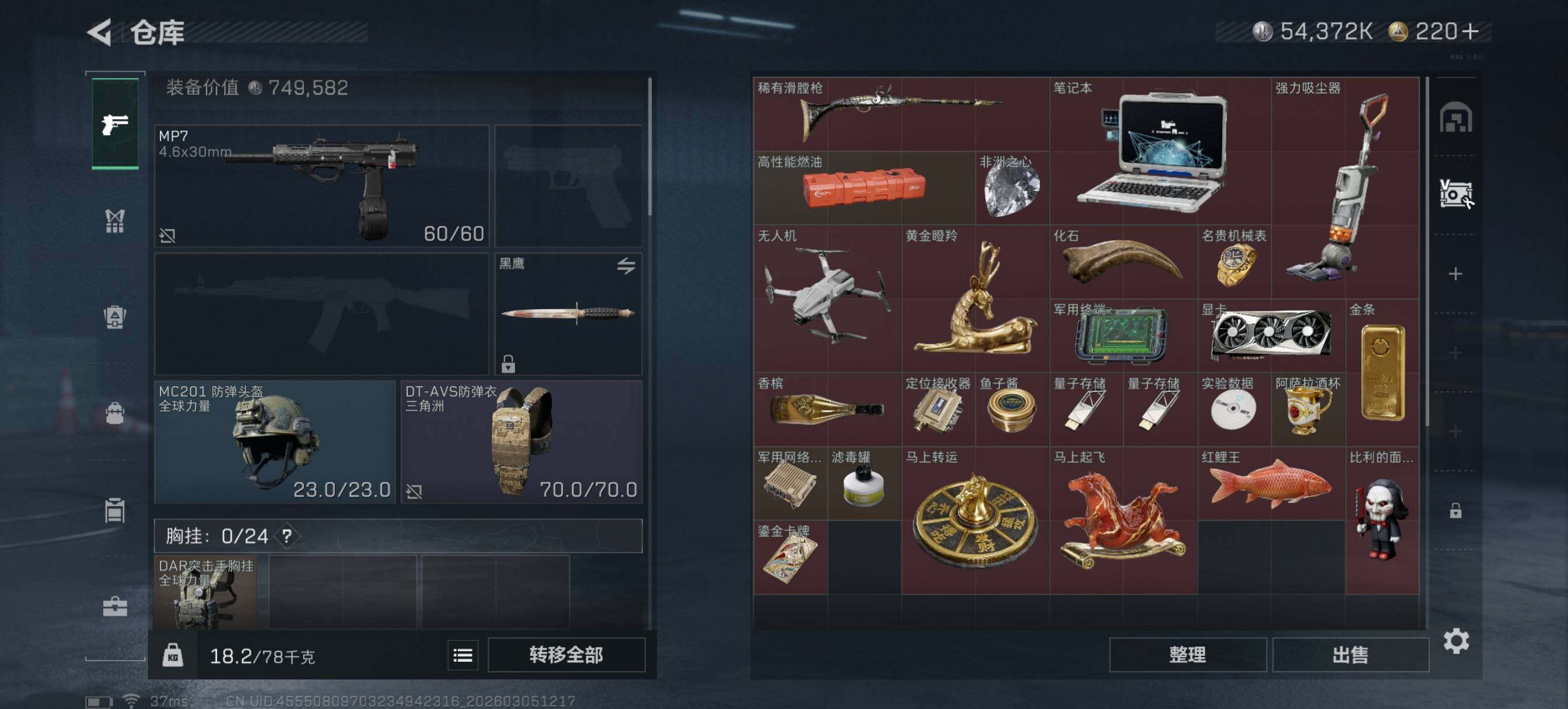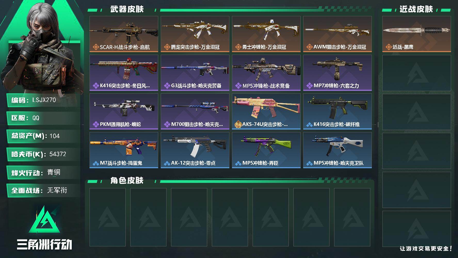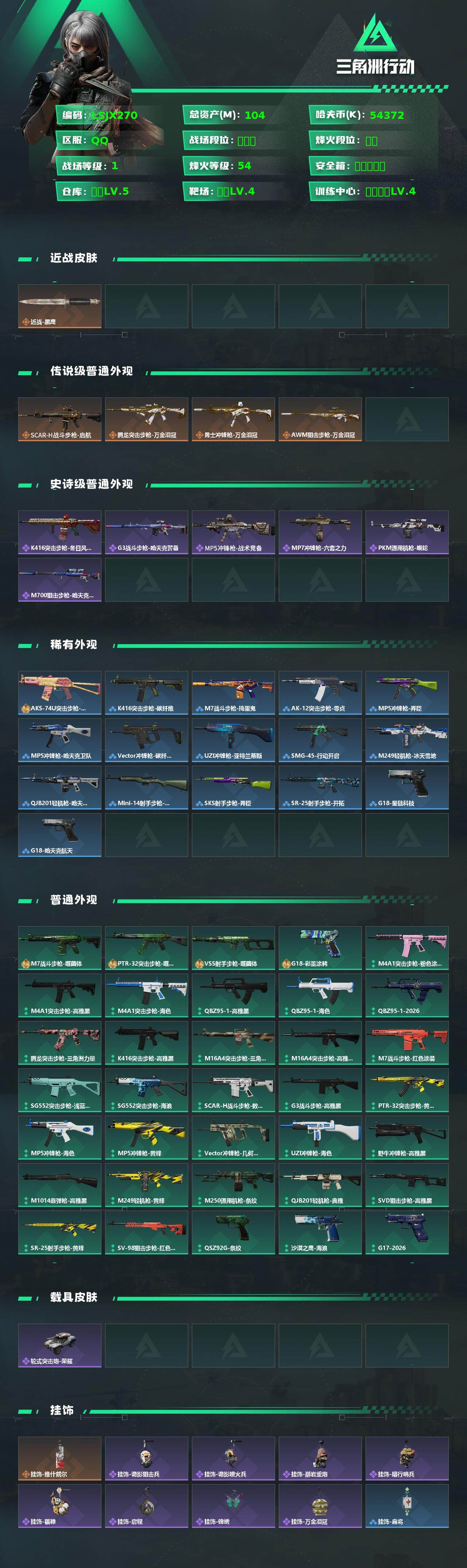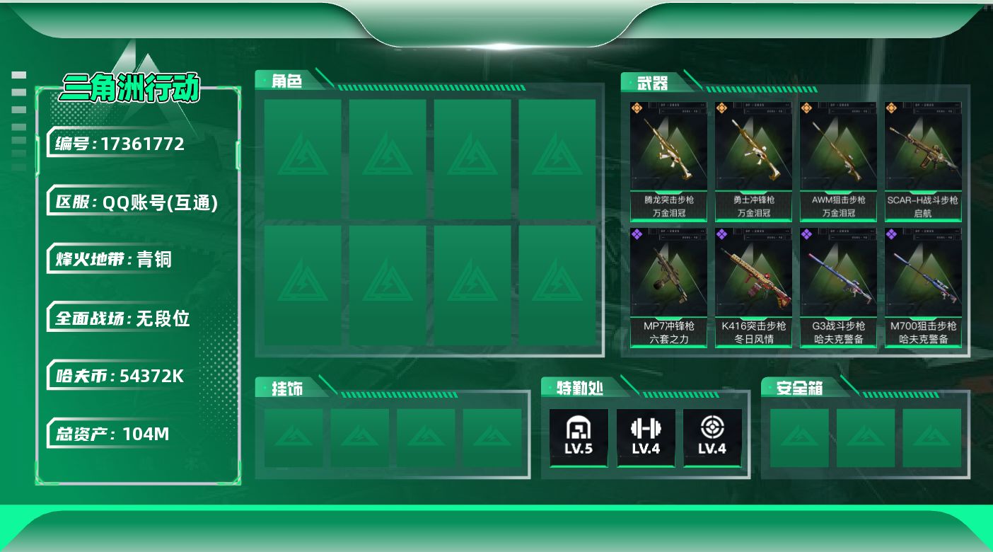 [17361772]可二次【特价出售/店主推荐】104m总资产-54372k哈伏币-54烽火等级-青铜-1战场等级-无军衔 【近战皮肤】:近战-黑鹰 【传说外观】:SCAR-H战斗步枪-启航,腾龙突击步枪-万金泪冠,勇士冲锋枪-万金泪冠,AWM狙击步枪-万金泪冠 【史诗外观】:K416突击步枪-冬日风情,G3战斗步枪-哈夫克警备,MP5冲锋枪-战术竞备,MP7冲锋枪-六套之力,PKM通用机枪-蝮蛇,M700狙击步枪-哈夫克警备 【稀有外观】:AKS-74U突击步枪-休闲时光,K416突击步枪-碳纤维,M7战斗步枪-捣蛋鬼,AK-12突击步枪-零点,MP5冲锋枪-弄臣,MP5冲锋枪-哈夫克卫队,Vector冲锋枪-碳纤维,UZI冲锋枪-亚特兰蒂斯,SMG-45冲锋枪-行动开启,M249轻机枪-冰天雪地,QJB201轻机枪-哈夫克卫队,Mini-14射手步枪-荣耀列队,SKS射手步枪-弄臣,SR-25射手步枪-开拓,G18-星链科技,G18-哈夫克航天 【普通外观】:M7战斗步枪-噬菌体,PTR-32突击步枪-噬菌体,VSS射手步枪-噬菌体,G18-彩墨涂鸦,M4A1突击步枪-粉色涂装,M4A1突击步枪-高雅黑,M4A1突击步枪-海色,QBZ95-1突击步枪-高雅黑,QBZ95-1突击步枪-海色,QBZ95-1突击步枪-2026,腾龙突击步枪-三角洲力量,K416突击步枪-高雅黑,M16A4突击步枪-三角洲力量,M16A4突击步枪-高雅黑,M7战斗步枪-红色涂装,SG552突击步枪-浅蓝涂装,SG552突击步枪-海浪,SCAR-H战斗步枪-数码迷彩,G3战斗步枪-高雅黑,PTR-32突击步枪-黄蜂,MP5冲锋枪-海色,MP5冲锋枪-黄蜂,Vector冲锋枪-几何迷彩,UZI冲锋枪-海色,野牛冲锋枪-高雅黑,M1014霰弹枪-高雅黑,M249轻机枪-黄蜂,M250通用机枪-条纹,QJB201轻机枪-典雅,SVD狙击步枪-高雅黑,SR-25射手步枪-黄蜂,SV-98狙击步枪-红色涂装,QSZ92G-条纹,沙漠之鹰-海浪,G17-2026 【载具外观】:轮式突击炮-荣耀 【挂饰】:挂饰-维什戴尔,挂饰-诡影狙击兵,挂饰-诡影喷火兵*3,挂饰-崩岩重炮,挂饰-暗行哨兵*2,挂饰-福禄,挂饰-启程,挂饰-锦绣,挂饰-万金泪冠,挂饰-麻将