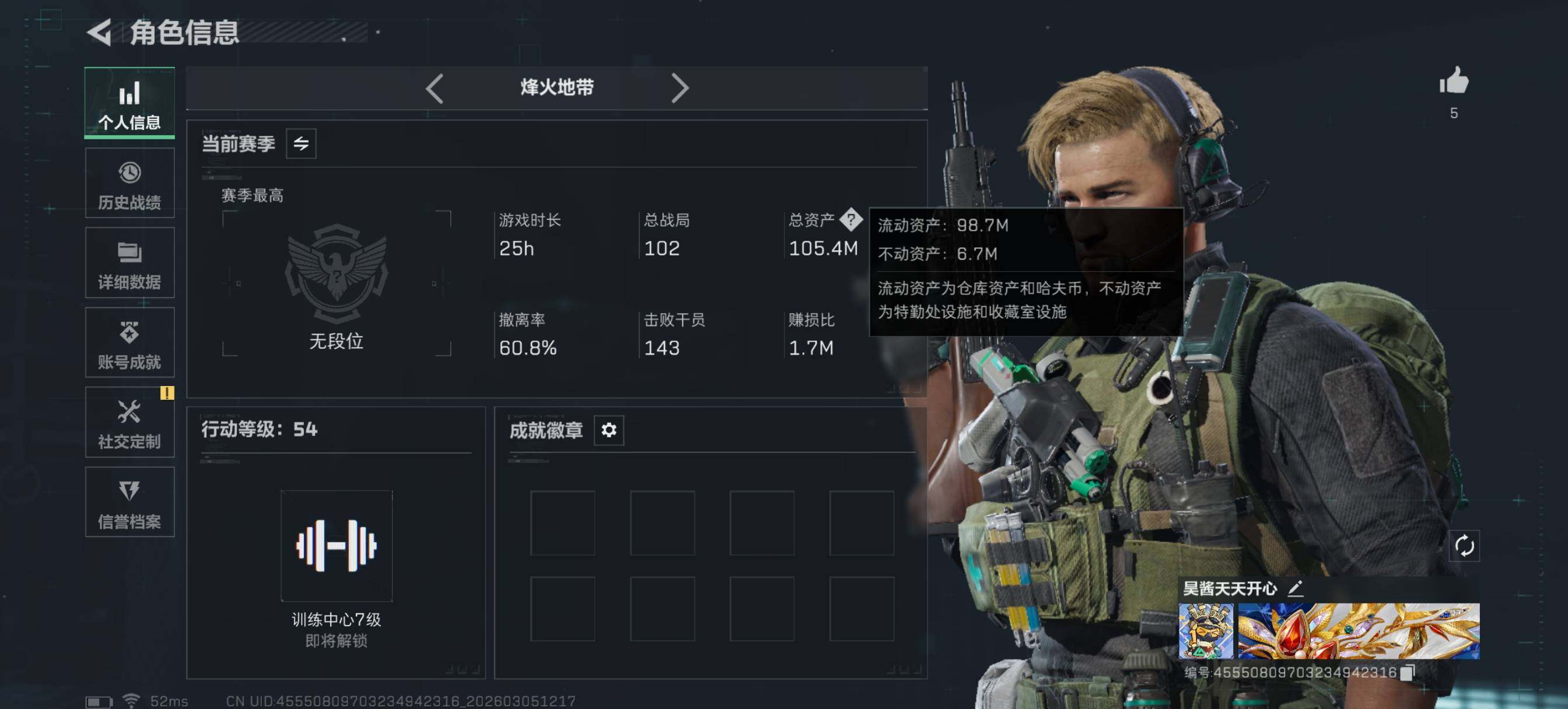 [17361772]可二次【特价出售/店主推荐】104m总资产-54372k哈伏币-54烽火等级-青铜-1战场等级-无军衔