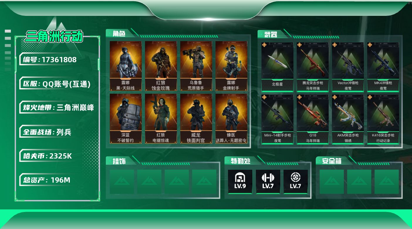 [17361808]196m总资产-2325k哈伏币-60烽火等级-三角洲巅峰-10战场等级-列兵