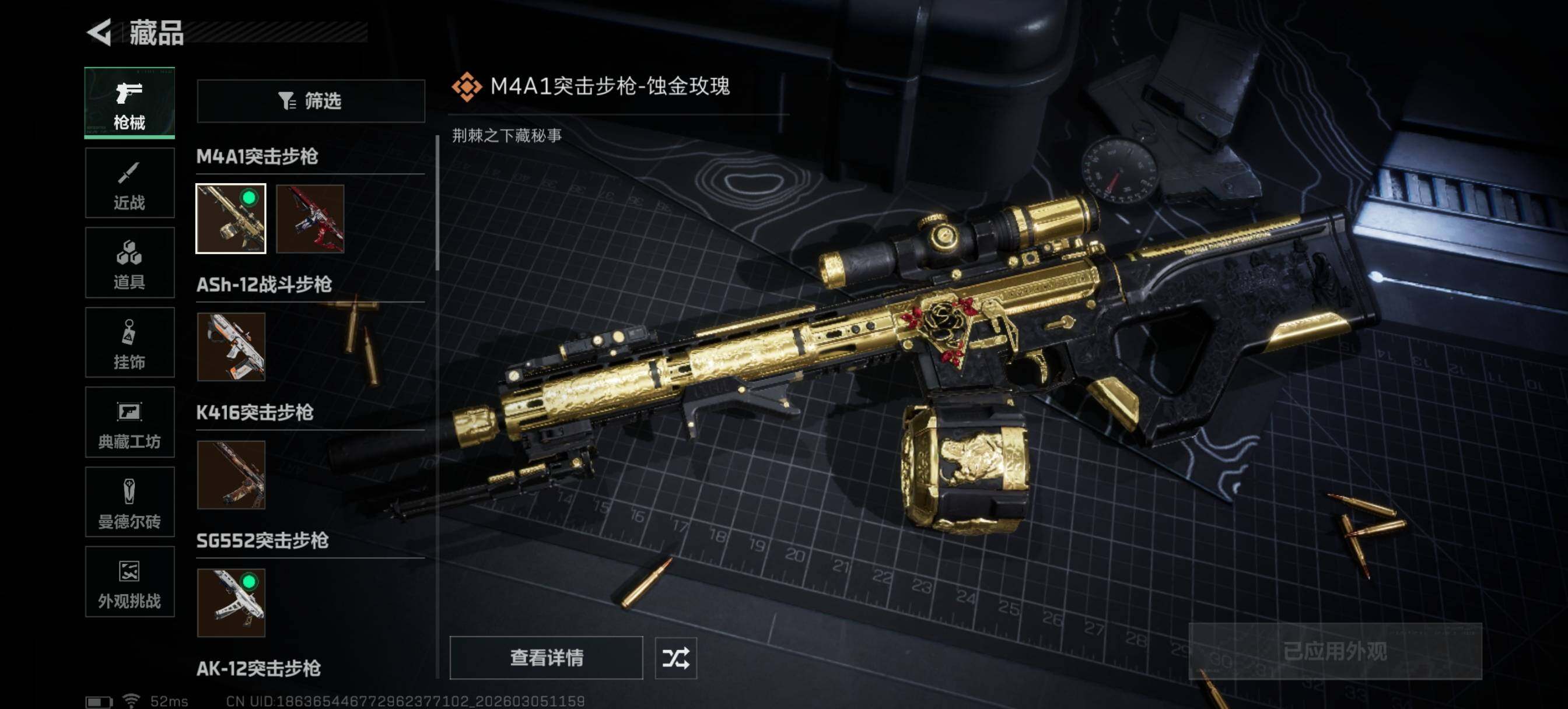 【传说外观】:M4A1突击步枪-蚀金玫瑰,M4A1突击步枪-阿米娅,ASh-12战斗步枪-鹅鸭杀,K416突击步枪-行动记录,SG552突击步枪-运动员,AK-12突击步枪-夜鹰,SCAR-H战斗步枪-启航,G3战斗步枪-骑士,CAR-15突击步枪-阿米娅,KC17突击步枪-电锯惊魂,P90冲锋枪-信条,SMG-45冲锋枪-骑士,勇士冲锋枪-能天使-午夜邮差,QCQ171冲锋枪-鹅鸭杀,M250通用机枪-骑士之心,QJB201轻机枪-鹅鸭杀,M14射手步枪-蛮荒,M14射手步枪-缄花,SR-25射手步枪-信条,SR-25射手步枪-缄花,R93狙击步枪-维什戴尔,.357左轮-缄花
