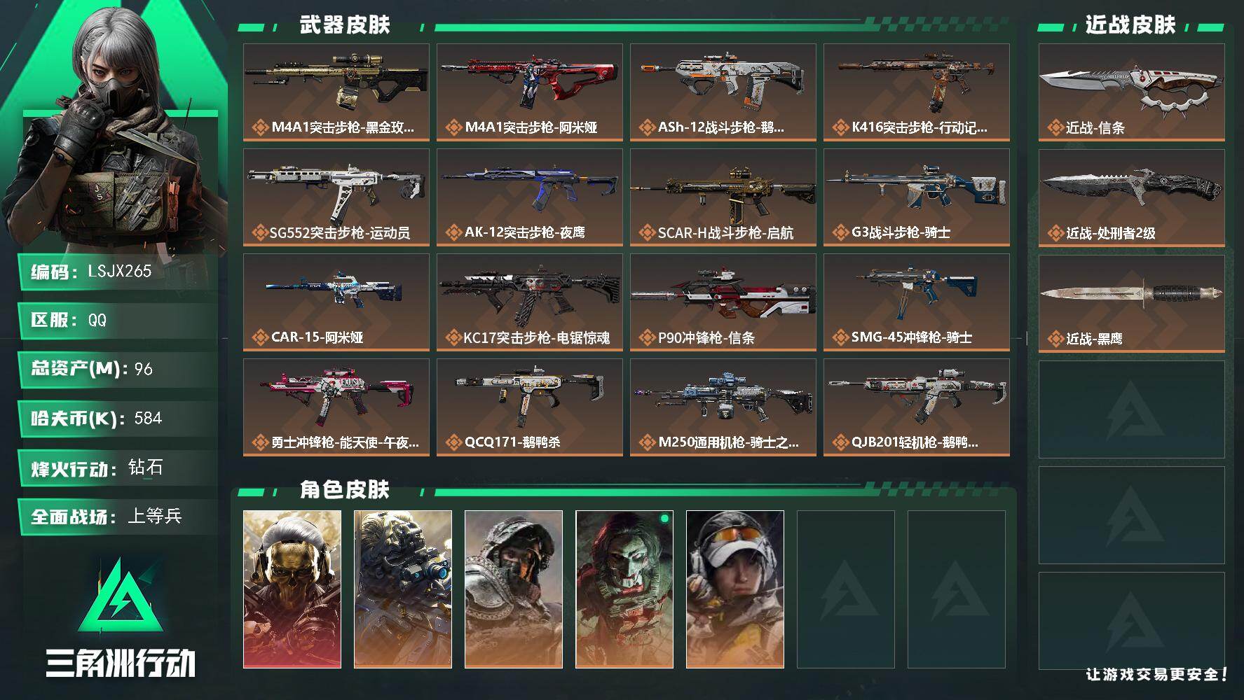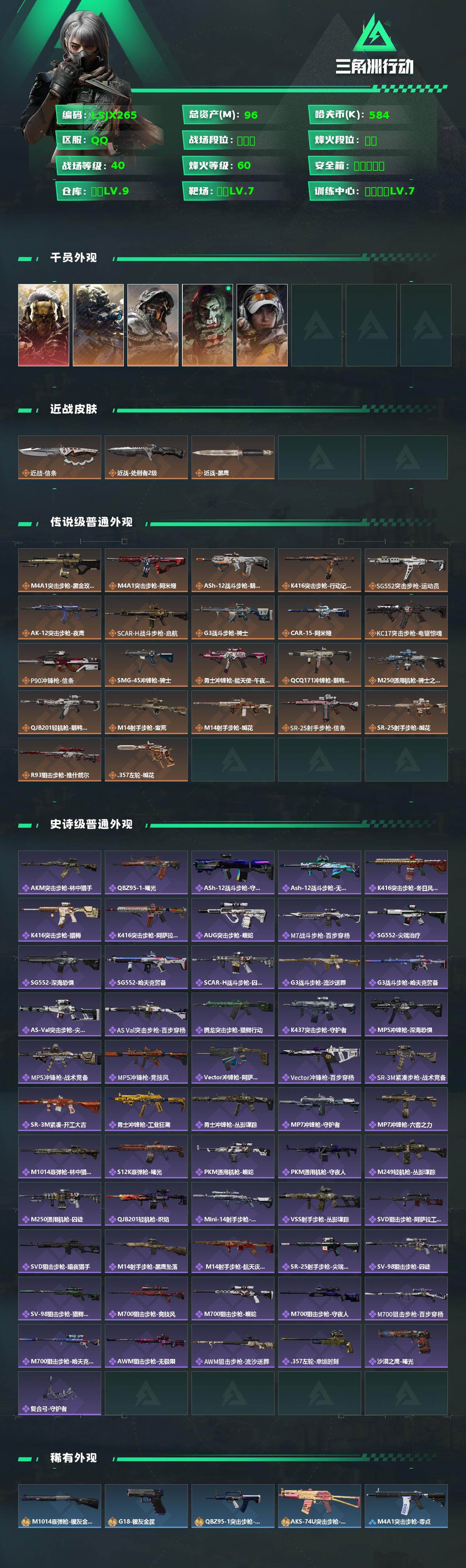 [17361830]【特价出售/店主推荐】96m总资产-584k哈伏币-60烽火等级-钻石-40战场等级-上等兵 【干员外观】:红狼-蚀金玫瑰,无名-夜鹰,深蓝-不破誓约,红狼-电锯惊魂,露娜-金牌射手 【近战皮肤】:近战-信条,近战-处刑者2级,近战-黑鹰 【传说外观】:M4A1突击步枪-蚀金玫瑰,M4A1突击步枪-阿米娅,ASh-12战斗步枪-鹅鸭杀,K416突击步枪-行动记录,SG552突击步枪-运动员,AK-12突击步枪-夜鹰,SCAR-H战斗步枪-启航,G3战斗步枪-骑士,CAR-15突击步枪-阿米娅,KC17突击步枪-电锯惊魂,P90冲锋枪-信条,SMG-45冲锋枪-骑士,勇士冲锋枪-能天使-午夜邮差,QCQ171冲锋枪-鹅鸭杀,M250通用机枪-骑士之心,QJB201轻机枪-鹅鸭杀,M14射手步枪-蛮荒,M14射手步枪-缄花,SR-25射手步枪-信条,SR-25射手步枪-缄花,R93狙击步枪-维什戴尔,.357左轮-缄花 【史诗外观】:AKM突击步枪-林中猎手,QBZ95-1突击步枪-曙光,ASh-12战斗步枪-守夜人,ASh-12战斗步枪-无极限,K416突击步枪-冬日风情,K416突击步枪-腊梅,K416突击步枪-阿萨拉特攻,AUG突击步枪-蝮蛇,M7战斗步枪-百步穿杨,SG552突击步枪-尖端治疗,SG552突击步枪-深海恐惧,SG552突击步枪-哈夫克警备,SCAR-H战斗步枪-囚徒,G3战斗步枪-流沙送葬,G3战斗步枪-哈夫克警备,AS Val突击步枪-尖端治疗,AS Val突击步枪-百步穿杨,腾龙突击步枪-猎鳄行动,K437突击步枪-守护者,MP5冲锋枪-深海恐惧,MP5冲锋枪-战术竞备,MP5冲锋枪-竞技风,Vector冲锋枪-阿萨拉文明,Vector冲锋枪-百步穿杨,SR-3M紧凑突击步枪-战术竞备,SR-3M紧凑突击步枪-开工大吉,勇士冲锋枪-工业狂潮,勇士冲锋枪-丛影谍踪,MP7冲锋枪-守护者,MP7冲锋枪-六套之力,M1014霰弹枪-林中猎手,S12K霰弹枪-曙光,PKM通用机枪-蝮蛇,PKM通用机枪-守夜人,M249轻机枪-丛影谍踪,M250通用机枪-囚徒,QJB201轻机枪-炽焰,Mini-14射手步枪-守护者,VSS射手步枪-丛影谍踪,SVD狙击步枪-阿萨拉工艺,SVD狙击步枪-暗夜猎手,M14射手步枪-黑鹰坠落, M14射手步枪-航天庆典,