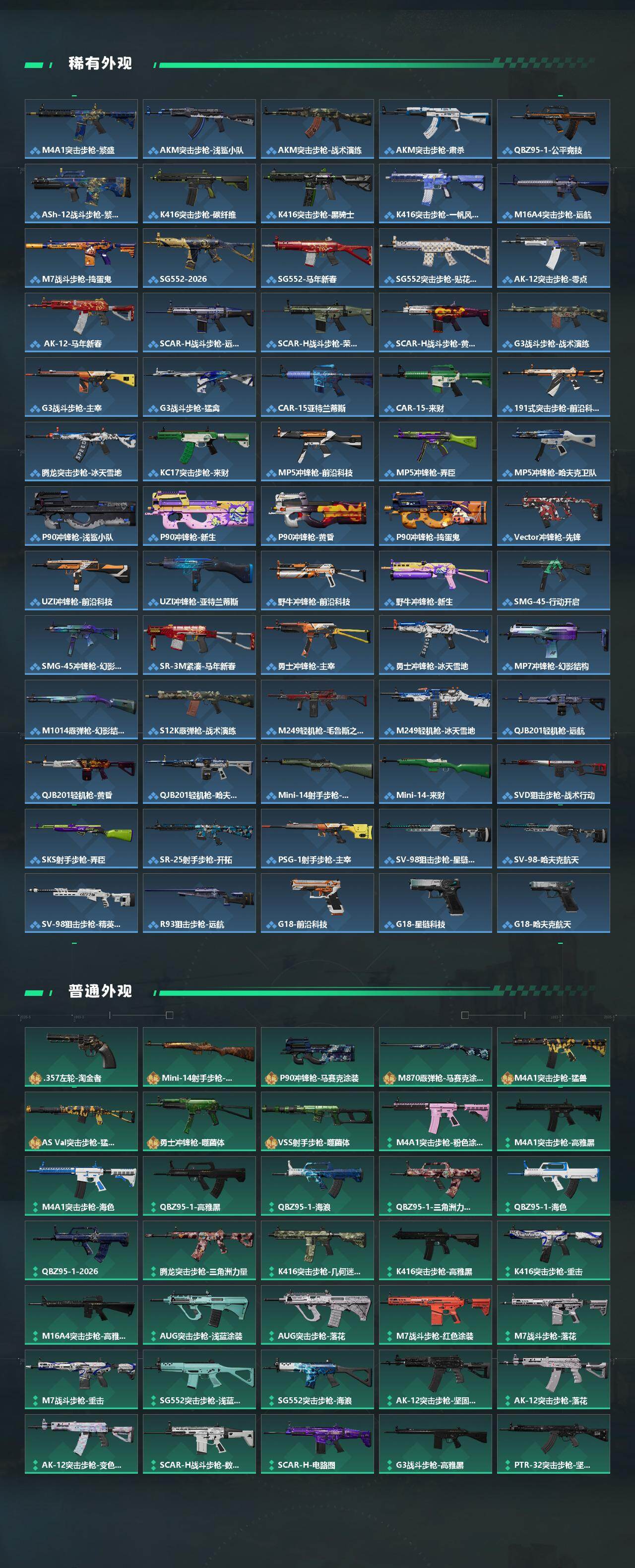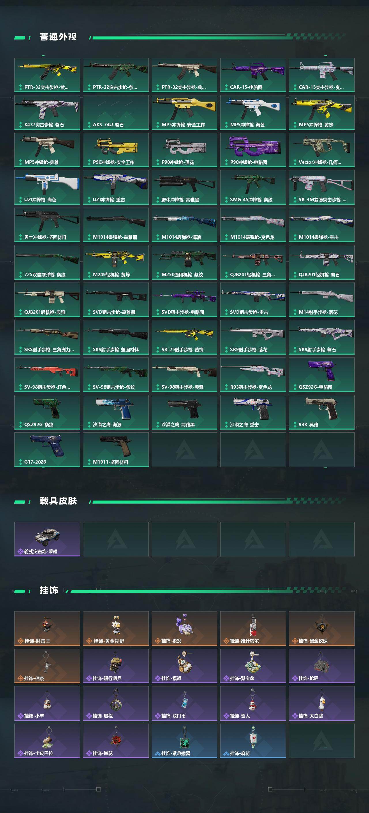 【史诗外观】:AKM突击步枪-林中猎手,QBZ95-1突击步枪-曙光,ASh-12战斗步枪-守夜人,ASh-12战斗步枪-无极限,K416突击步枪-冬日风情,K416突击步枪-腊梅,K416突击步枪-阿萨拉特攻,AUG突击步枪-蝮蛇,M7战斗步枪-百步穿杨,SG552突击步枪-尖端治疗,SG552突击步枪-深海恐惧,SG552突击步枪-哈夫克警备,SCAR-H战斗步枪-囚徒,G3战斗步枪-流沙送葬,G3战斗步枪-哈夫克警备,AS Val突击步枪-尖端治疗,AS Val突击步枪-百步穿杨,腾龙突击步枪-猎鳄行动,K437突击步枪-守护者,MP5冲锋枪-深海恐惧,MP5冲锋枪-战术竞备,MP5冲锋枪-竞技风,Vector冲锋枪-阿萨拉文明,Vector冲锋枪-百步穿杨,SR-3M紧凑突击步枪-战术竞备,SR-3M紧凑突击步枪-开工大吉,勇士冲锋枪-工业狂潮,勇士冲锋枪-丛影谍踪,MP7冲锋枪-守护者,MP7冲锋枪-六套之力,M1014霰弹枪-林中猎手,S12K霰弹枪-曙光,PKM通用机枪-蝮蛇,PKM通用机枪-守夜人,M249轻机枪-丛影谍踪,M250通用机枪-囚徒,QJB201轻机枪-炽焰,Mini-14射手步枪-守护者,VSS射手步枪-丛影谍踪,SVD狙击步枪-阿萨拉工艺,SVD狙击步枪-暗夜猎手,M14射手步枪-黑鹰坠落, M14射手步枪-航天庆典,